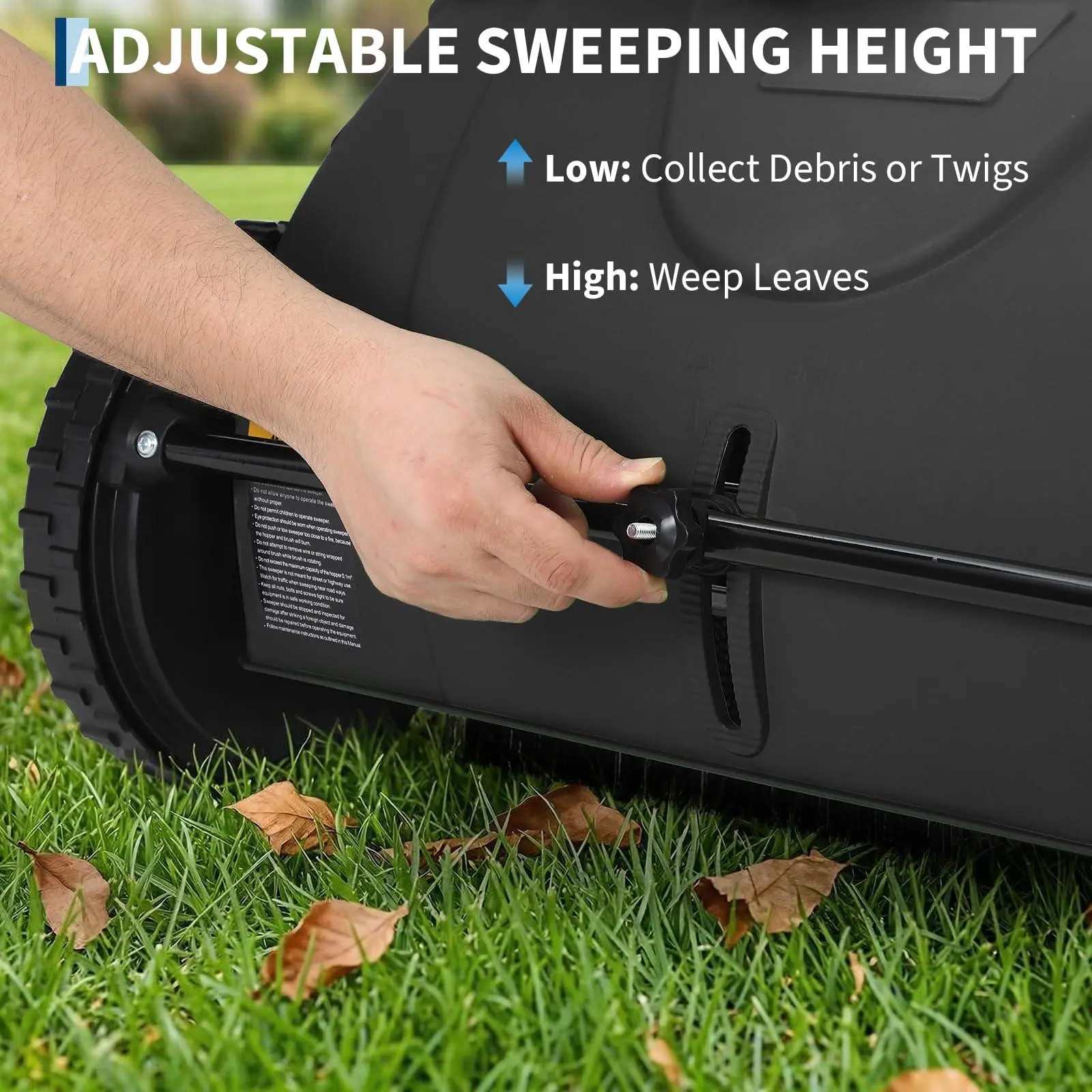 TOOL-FREE HEIGHT ADJUSTMENT: Easily adapt to any terrain with the simple turn of a knob. The adjustable brush height allows you to transition seamlessly between lush lawns, gravel driveways, and concrete sidewalks, protecting your grass while maximizing    pickup efficiency.