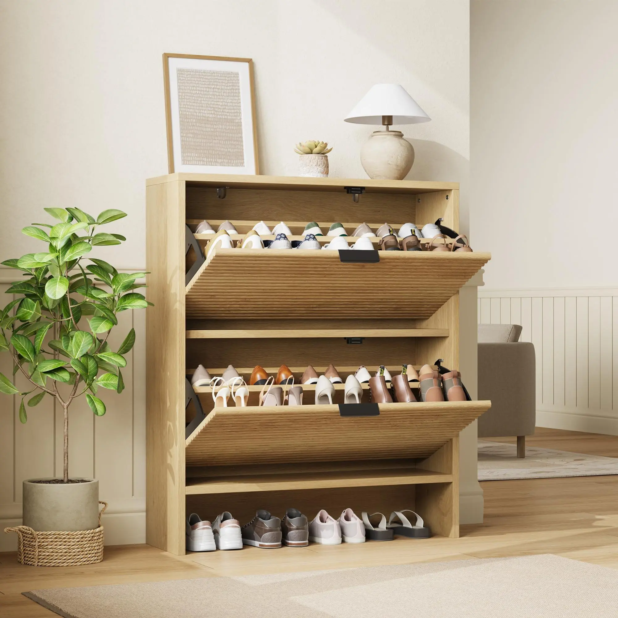 【Artistic Wavy Fluted Aesthetics】 The natural wood-toned wavy fluted panel design adds rich texture and visual depth to your shoe rack, highlighting the natural beauty of wood while elevating your home’s decor, acting as both a functional organizer and a stylish decorative piece, turning your entryway into a welcoming, elegant focal point.