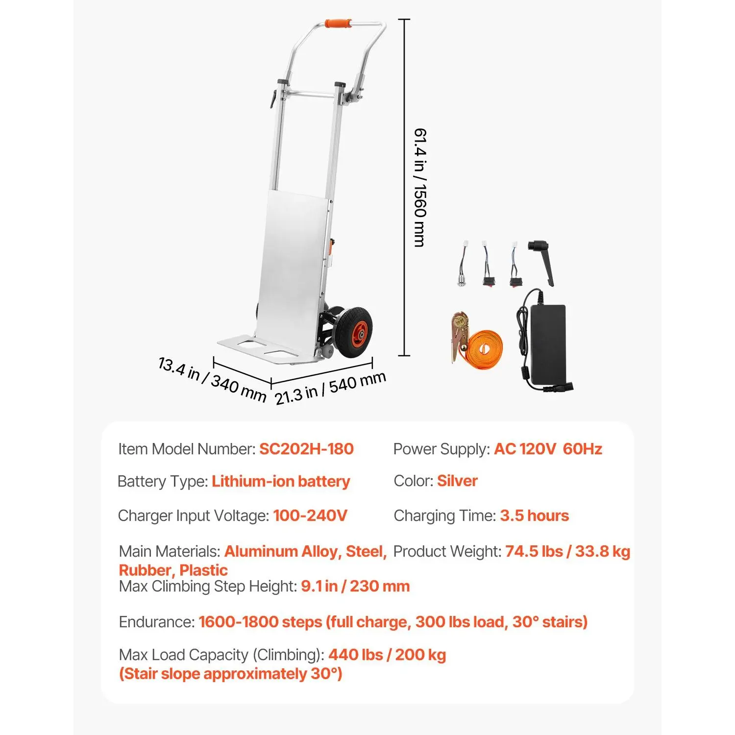 VEVOR Electric Stair Climbing Dolly, 440lbs Capacity Electric Stair Climbing Hand Trucks with 157.5in Rope Folding Handle, Heavy Duty Stair Climber for Warehouse Logistics, Moving Furniture(Silver)Efficient Stair ClimbingSmooth Secure Stair ClimbingUpgraded MaterialsEasy to OperateReliable DesignNon-Slip Stair Climbing WheelsMotor Dustproof Waterproof: IP54, Charger Input Voltage: 100-240V, Color: Silver, Handle Height: 47.6 - 61.4/ 1210 - 1560 mm, Max Load Capacity (Climbing): 440 lbs/ 200 kg (Stair slope approximately 30), Product Dimensions: 61.4x 21.3x 13.4 inch/ 1560x 540x 340 mm, Battery Type: Lithium-ion battery, Charging Time: 3.5 hours, Power Supply: AC 120V, 60Hz, Operating Noise: 50dB (tested at 1-meter radius), Main Materials: Aluminum Alloy, Steel, Rubber, Plastic, Cargo Plate Dimensions: 17.3x 9.8/ 440x 250 mm, Item Model Number: SC202H-180, Product Weight: 74.5 lbs/ 33.8 kg, Climbing Wheels: 2.4 Inflatable Rubber Wheelsx 2, Endurance: 1600-1800 steps (full charge, 300 lbs load, 30 stairs), Speed Settings: 30/50 steps/min, Max Climbing Step Height: 9.1/ 230 mm