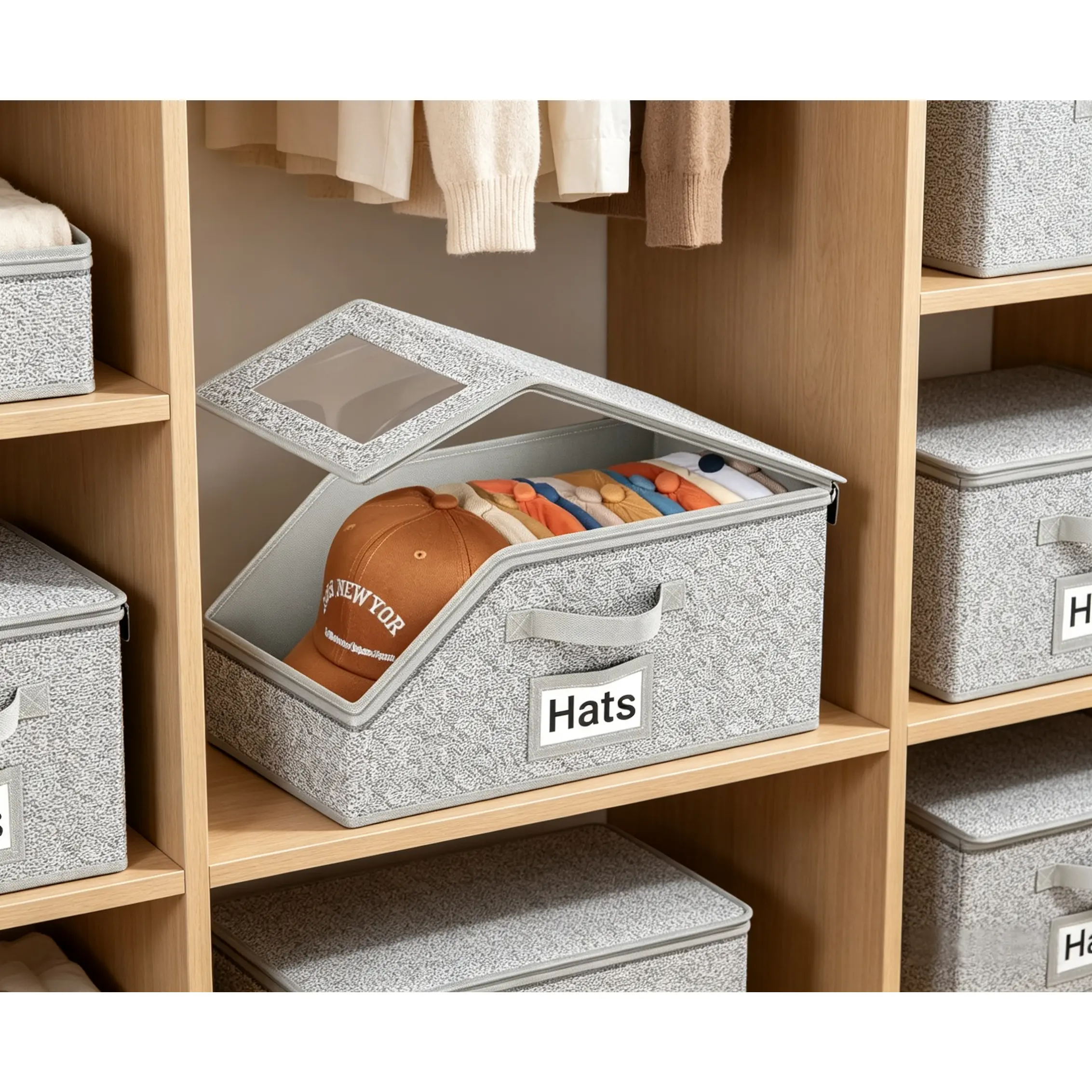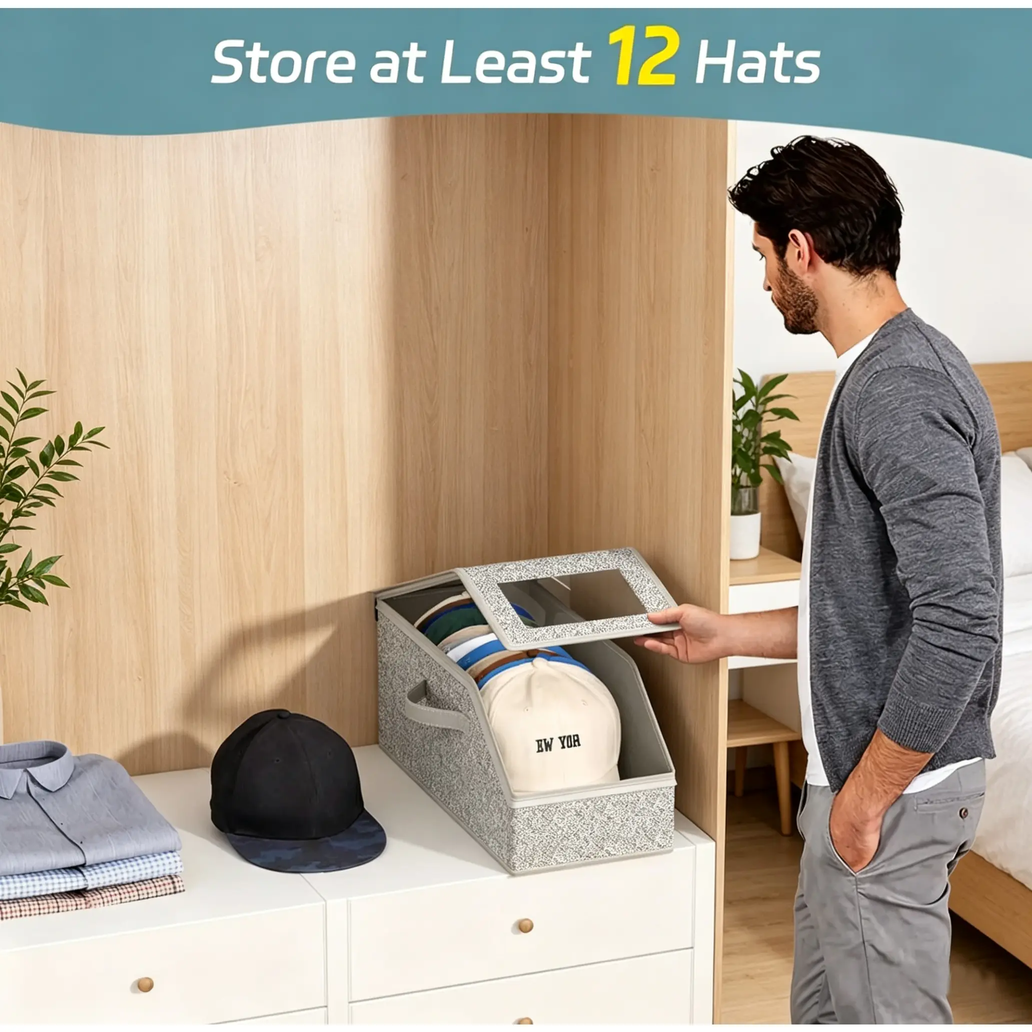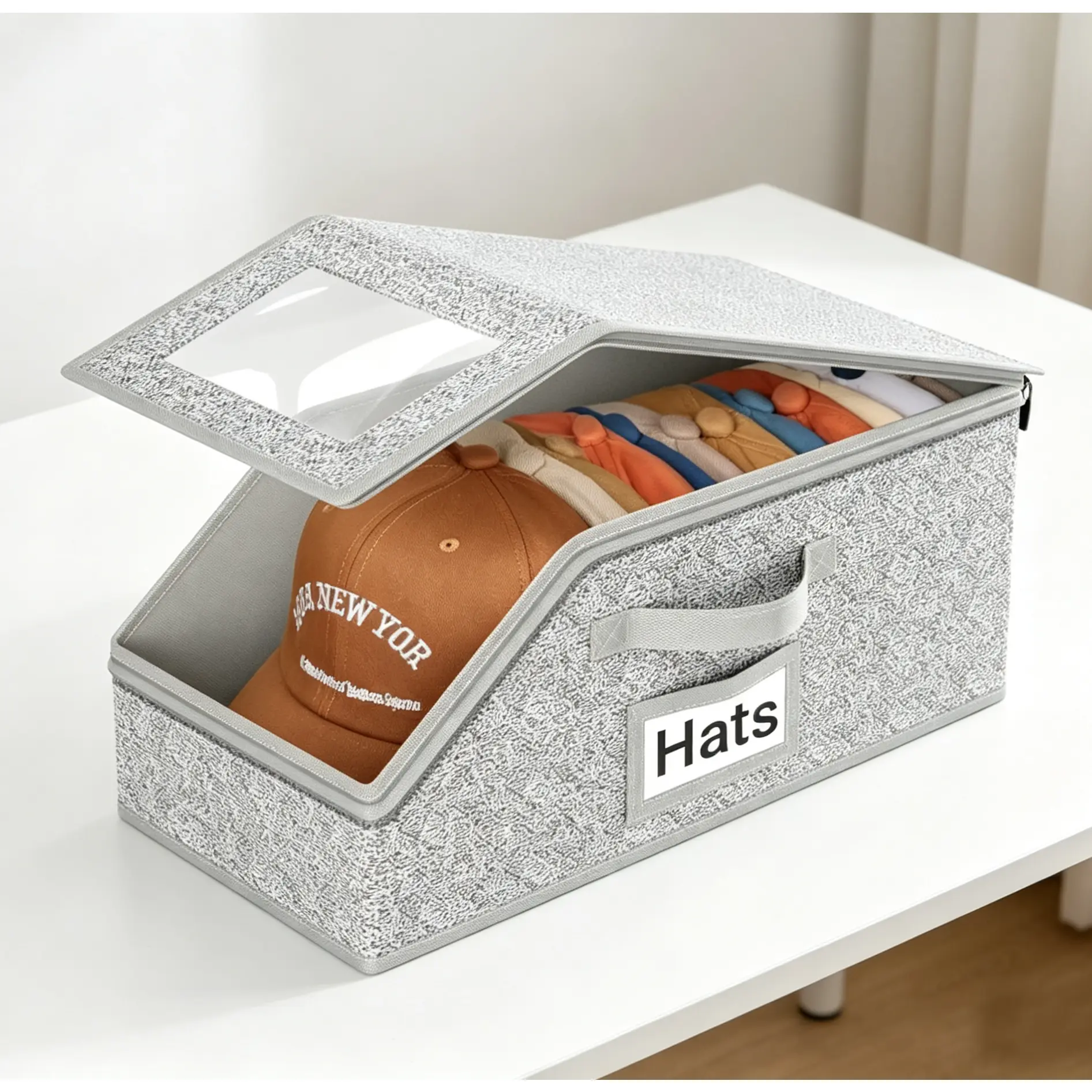 Cross-border multifunctional hat storage box for bedroom, large capacity, foldable, with cover, dustproof, zipper, baseball cap storage box