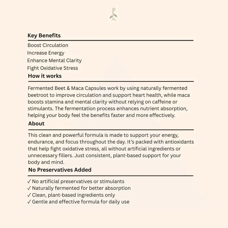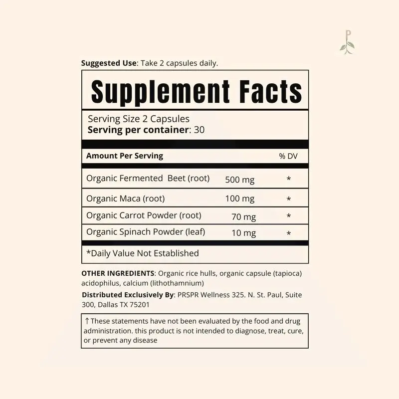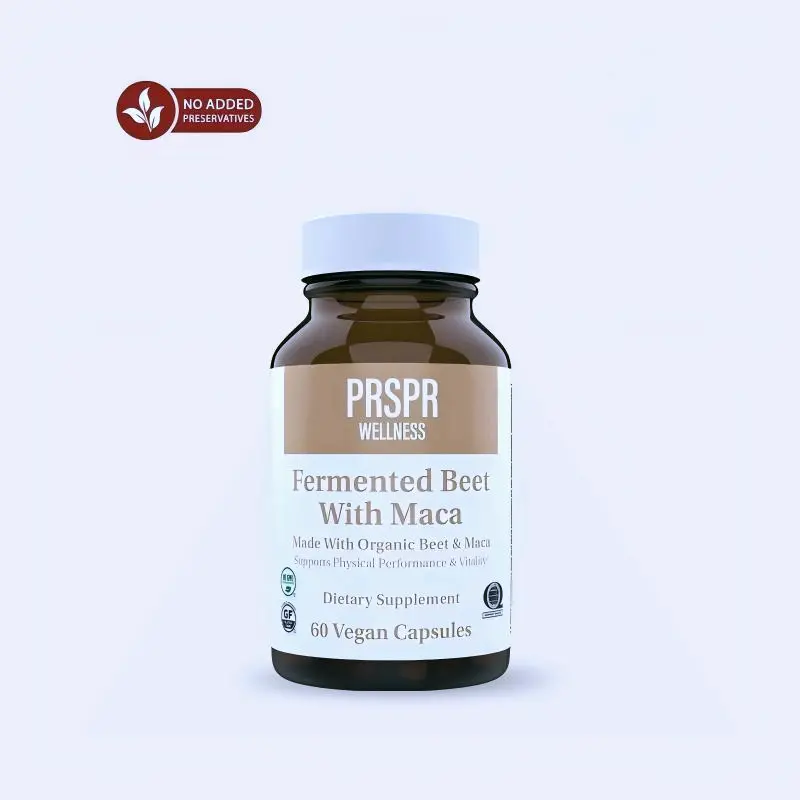 PRSPR Wellness Fermented Beet Root Maca offers clean daily nutrition in 60 capsules. Vegan and organic, it ensures enhanced absorption. Perfect for those seeking natural, wholesome supplements. Each capsule is crafted to support your wellness journey with fermented beet root and maca. Ideal for daily use, it complements your health regimen.
