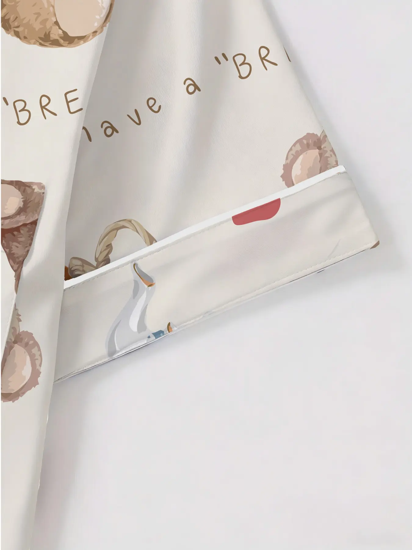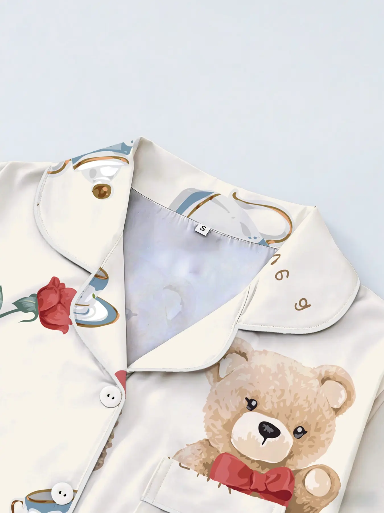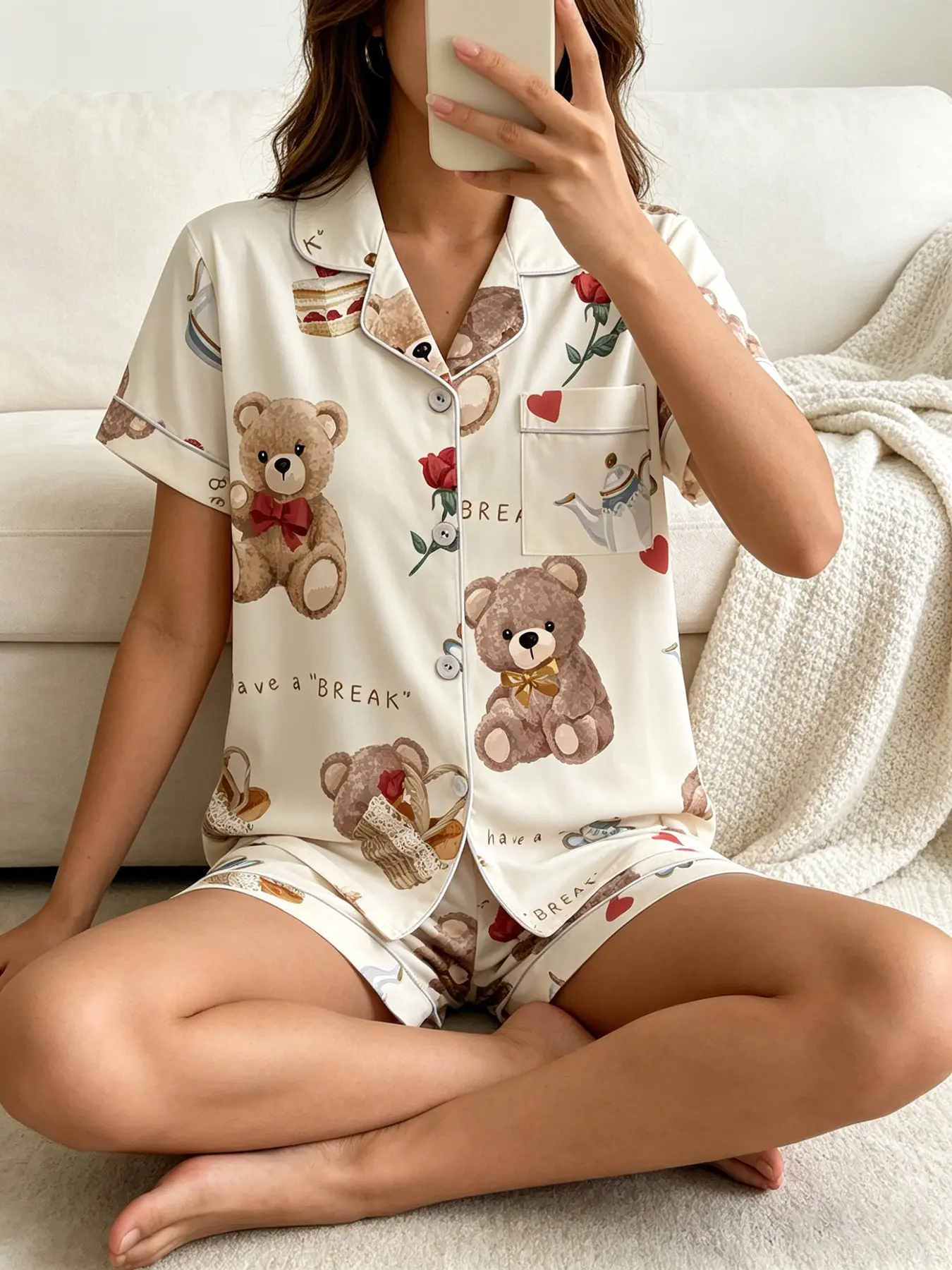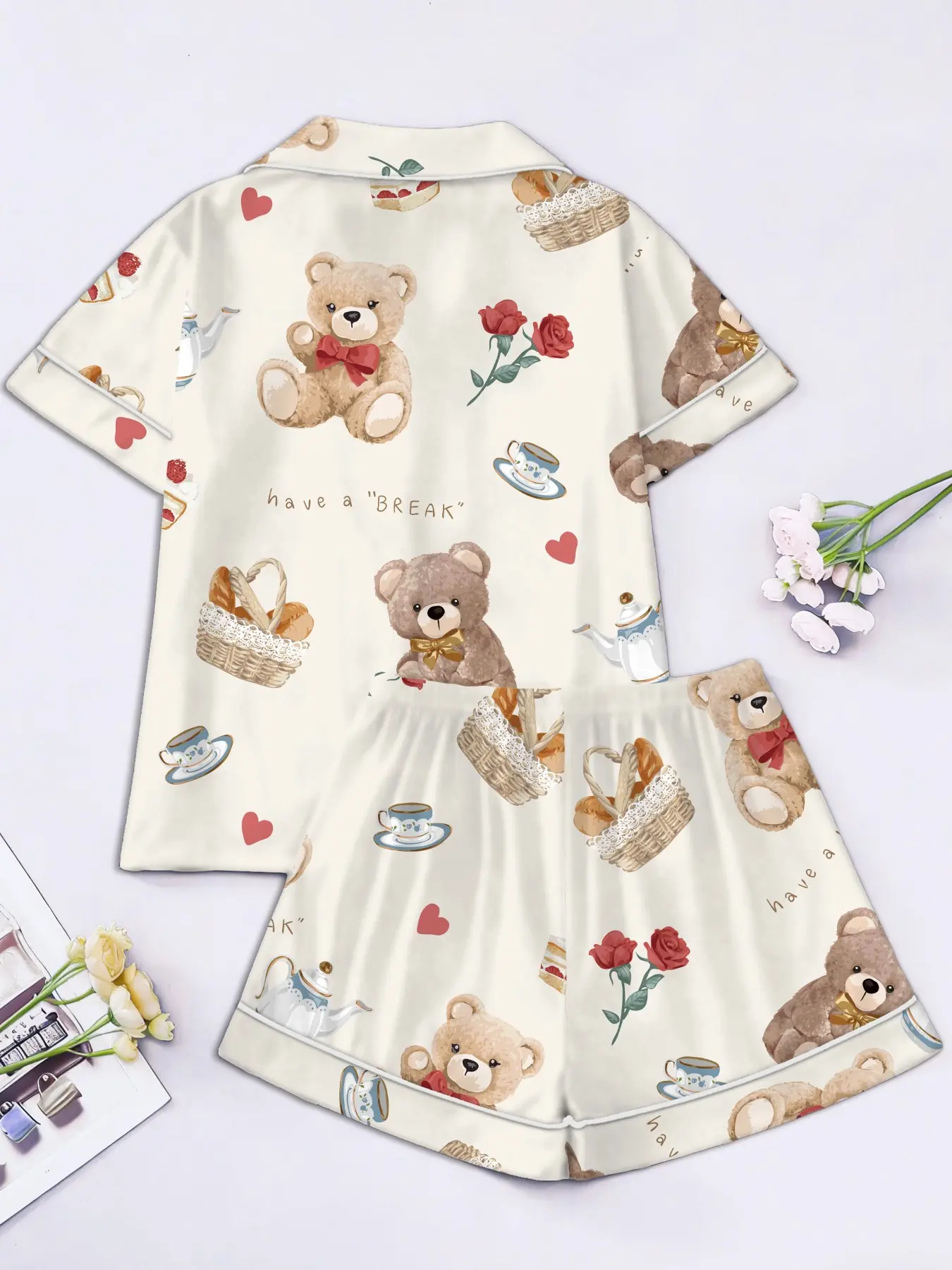 Women's Short Sleeve Button Down Top and Shorts Pajama Set, Spring Summer Wear, For French Romantic Lovers, White Base Rose Teddy Bear Print, Classic Lapel Collar, Loose Fit, Comfortable For Home & Travel