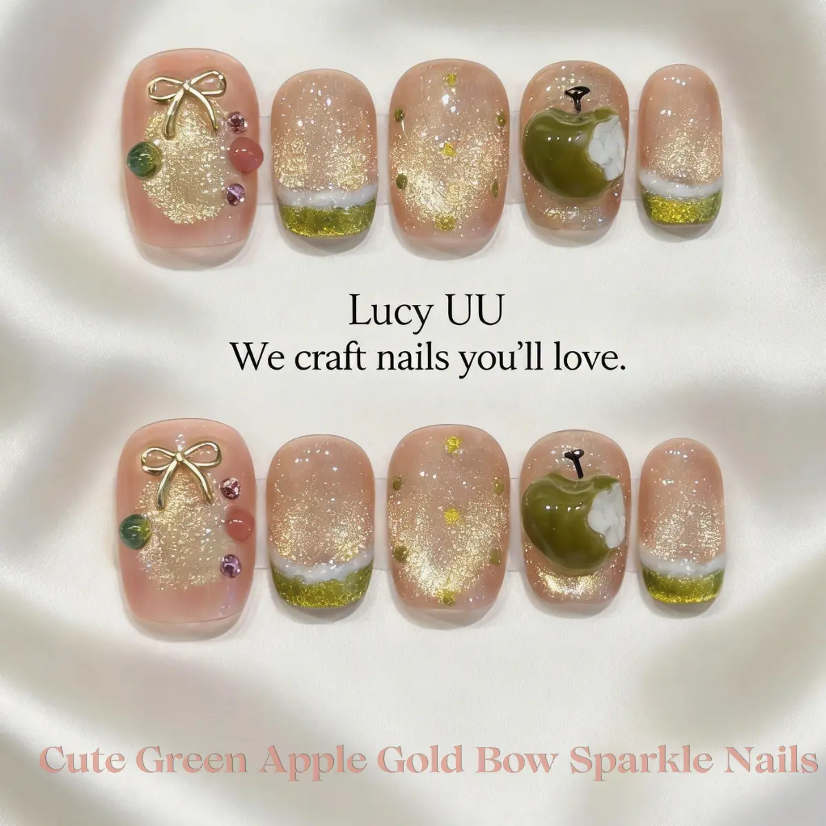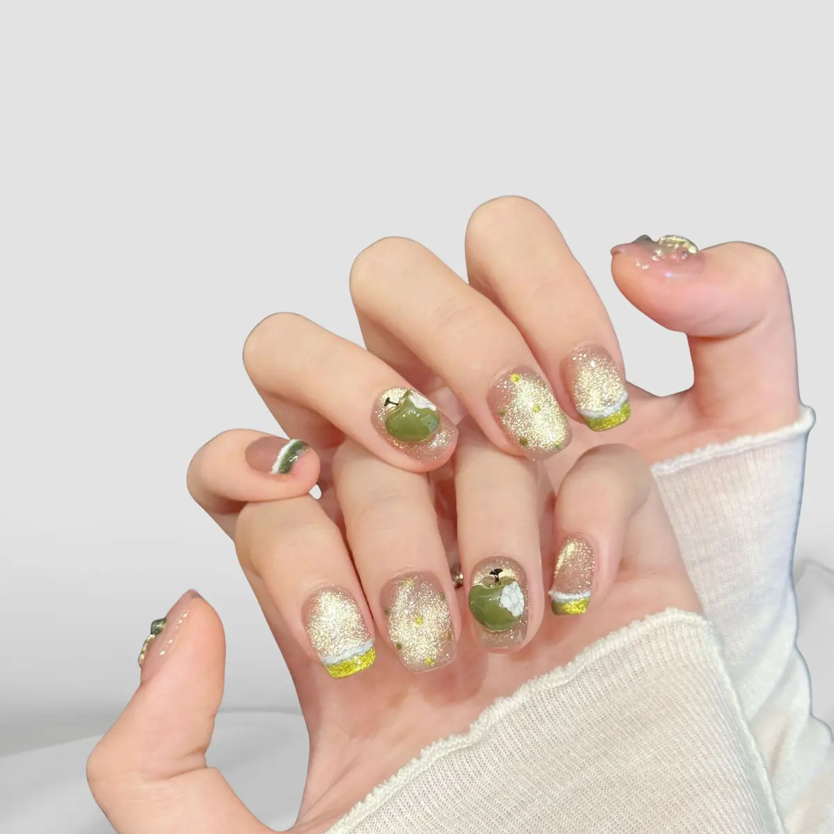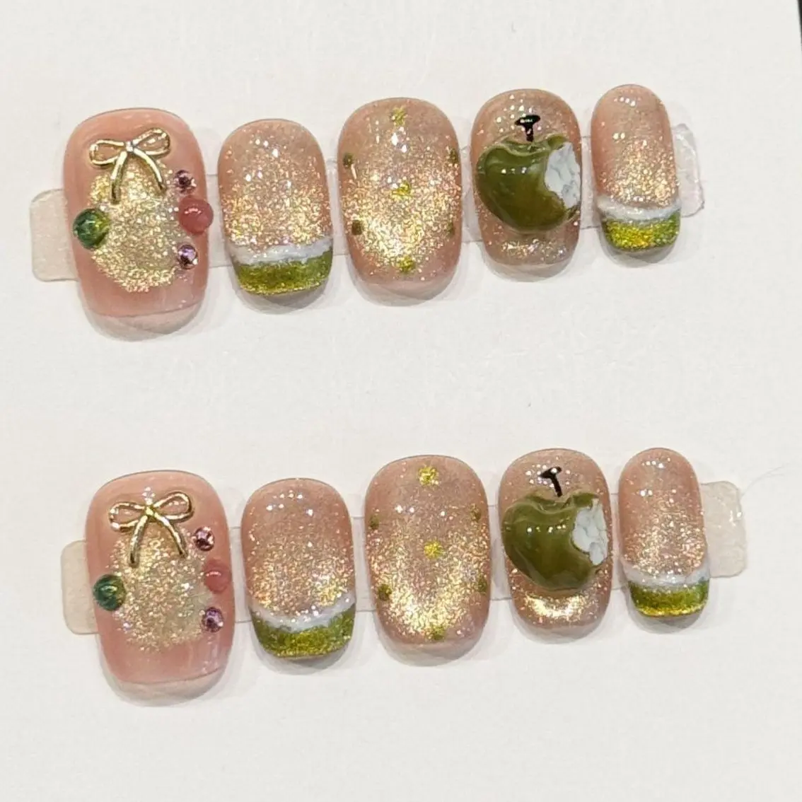 Style 2 : Green Apple Gold Bow Sparkle Nails