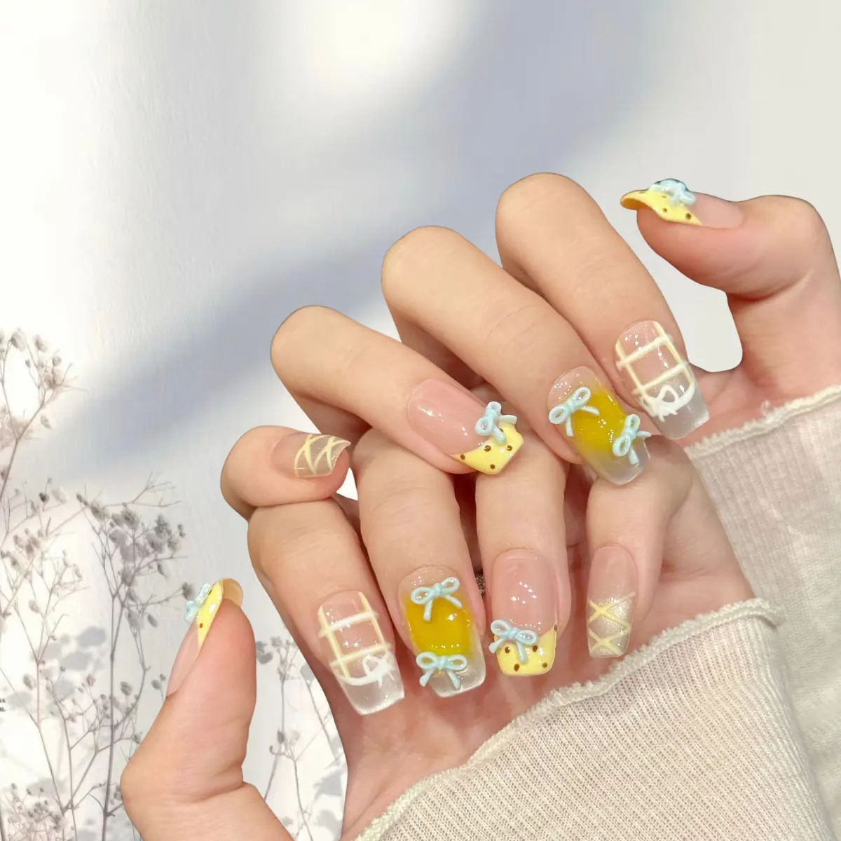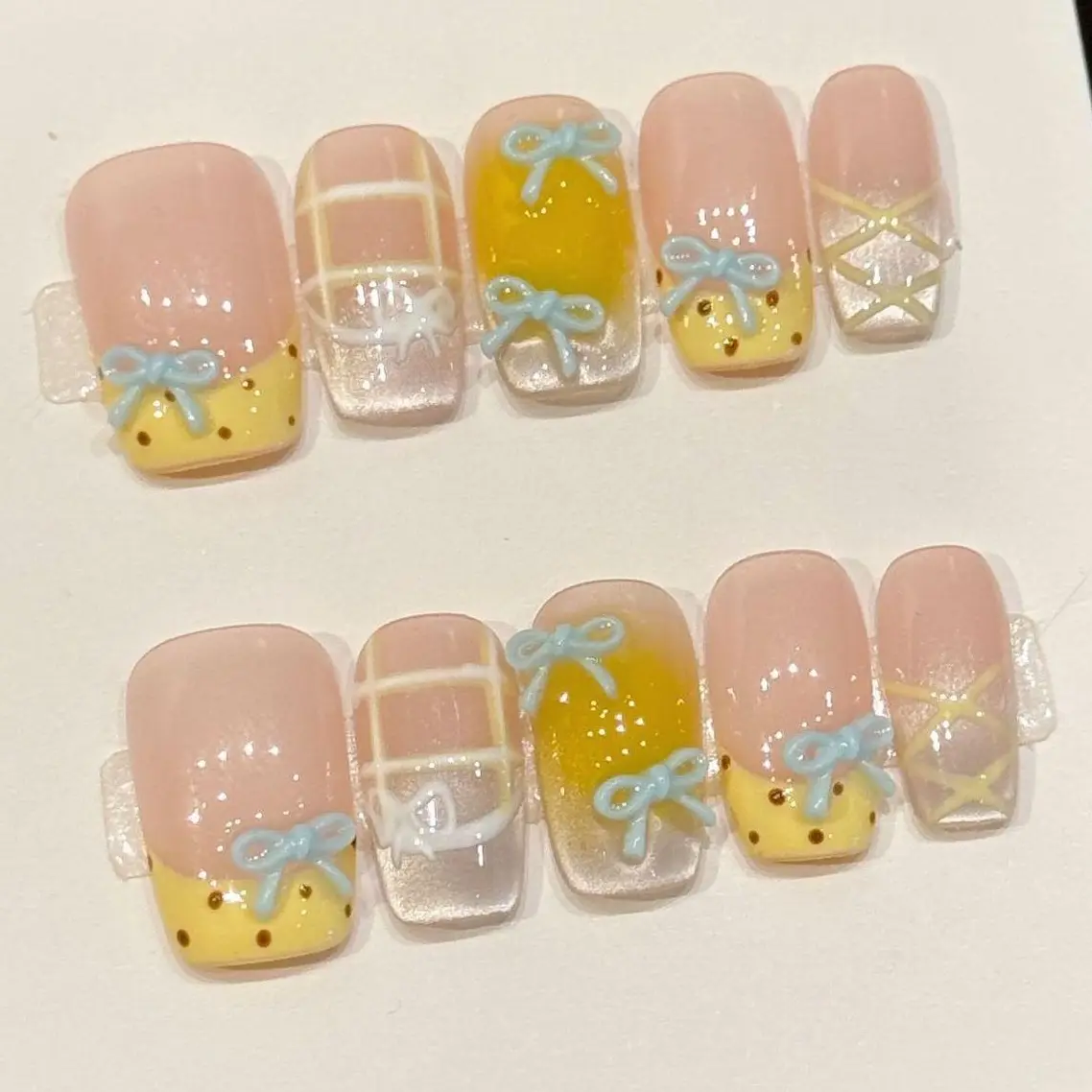 Featuring a soft pink base with a sunny yellow French tip, delicate white grid lines, tiny brown polka dots, and exquisite 3D light blue bow details. This style brings a fresh, sweet, and playful vibe, perfect for casual outings, picnics, date nights, and sweet daily wear.