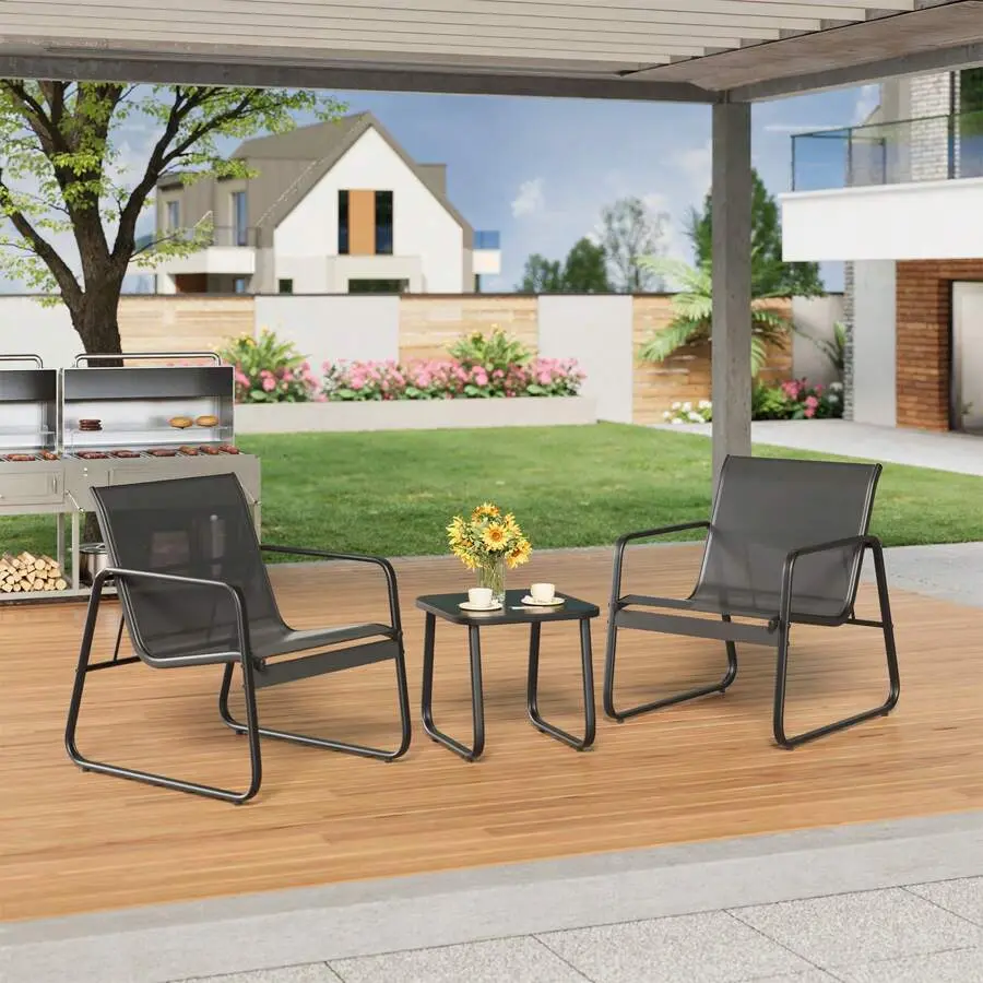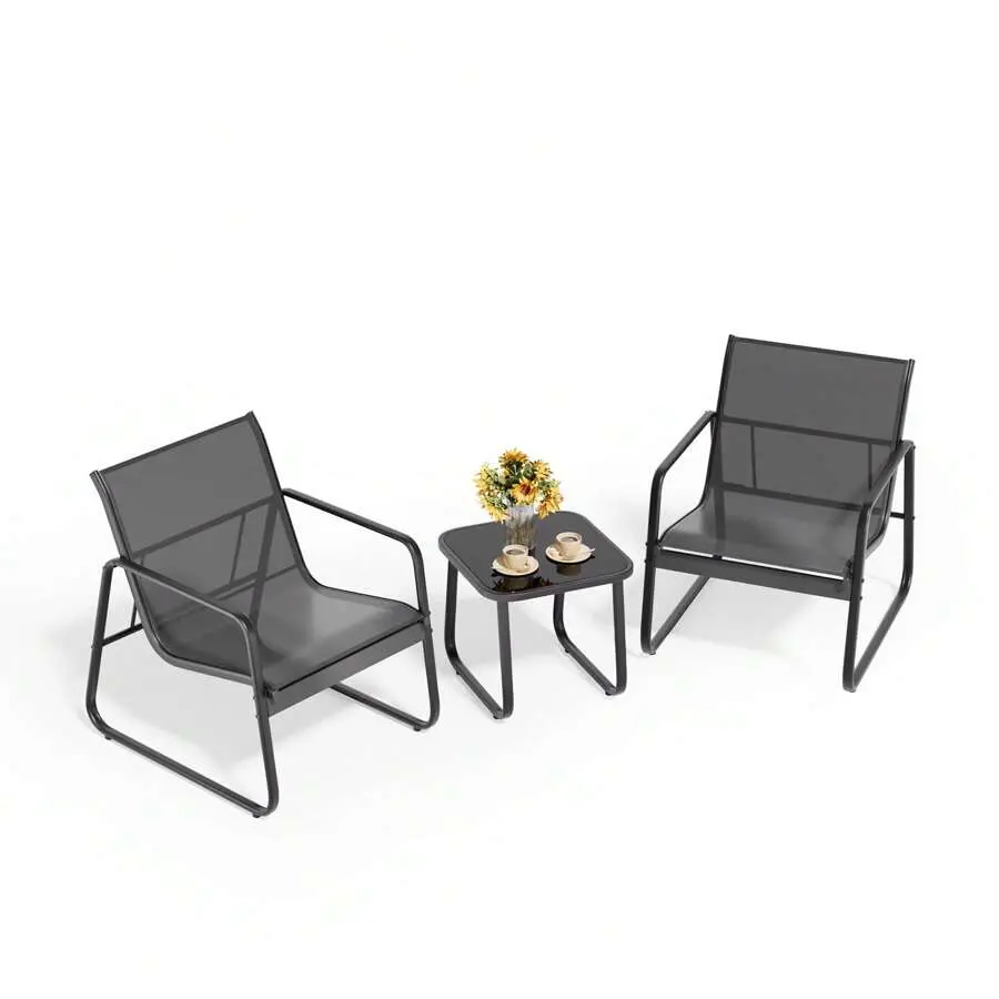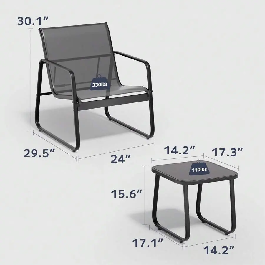 Versatile Application: With a simple and modern overall design, our outdoor black bistro table and chairs set of 2 includes two single chairs and a tempered glass table, perfect for outdoor gardens, lawns, patios, pools, afternoon tea, and dinner.Offering both convenience and leisure, it complements your home perfectly