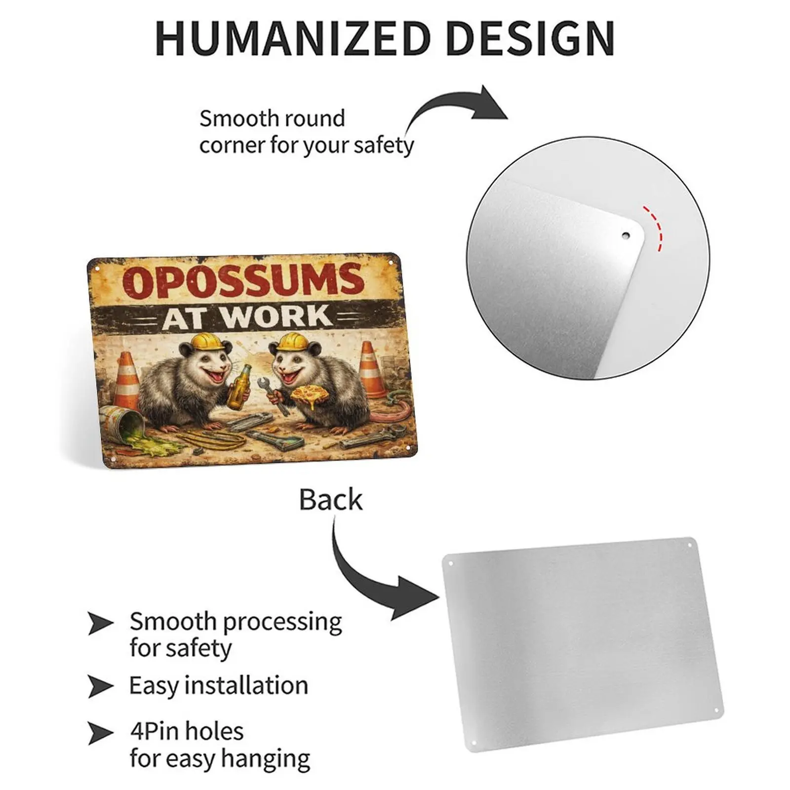12x8 Inch "Opossums At Work" Retro Metal Sign, Funny Opossum Garage Decor for Tool Shop & Home