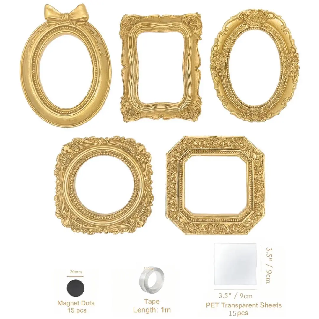 ·Package Including: 5pcs vintage frames in different shapes and sizes and adhesive tape,Magnetic stickers,Protective sheet.The mini picture frames individually packaged in a bubble wrap and then put into a sturdy cardboard box to ensure that the frames will not break