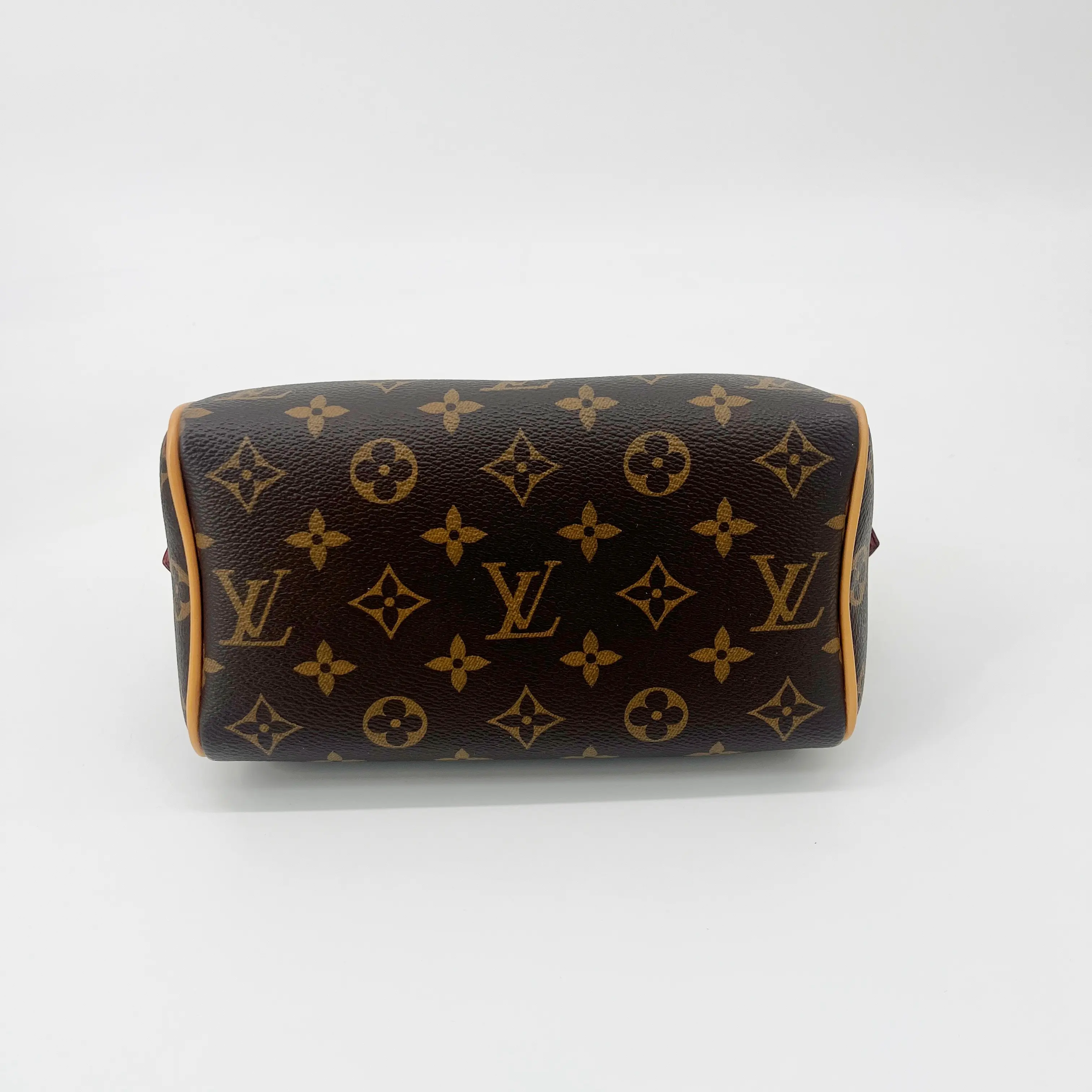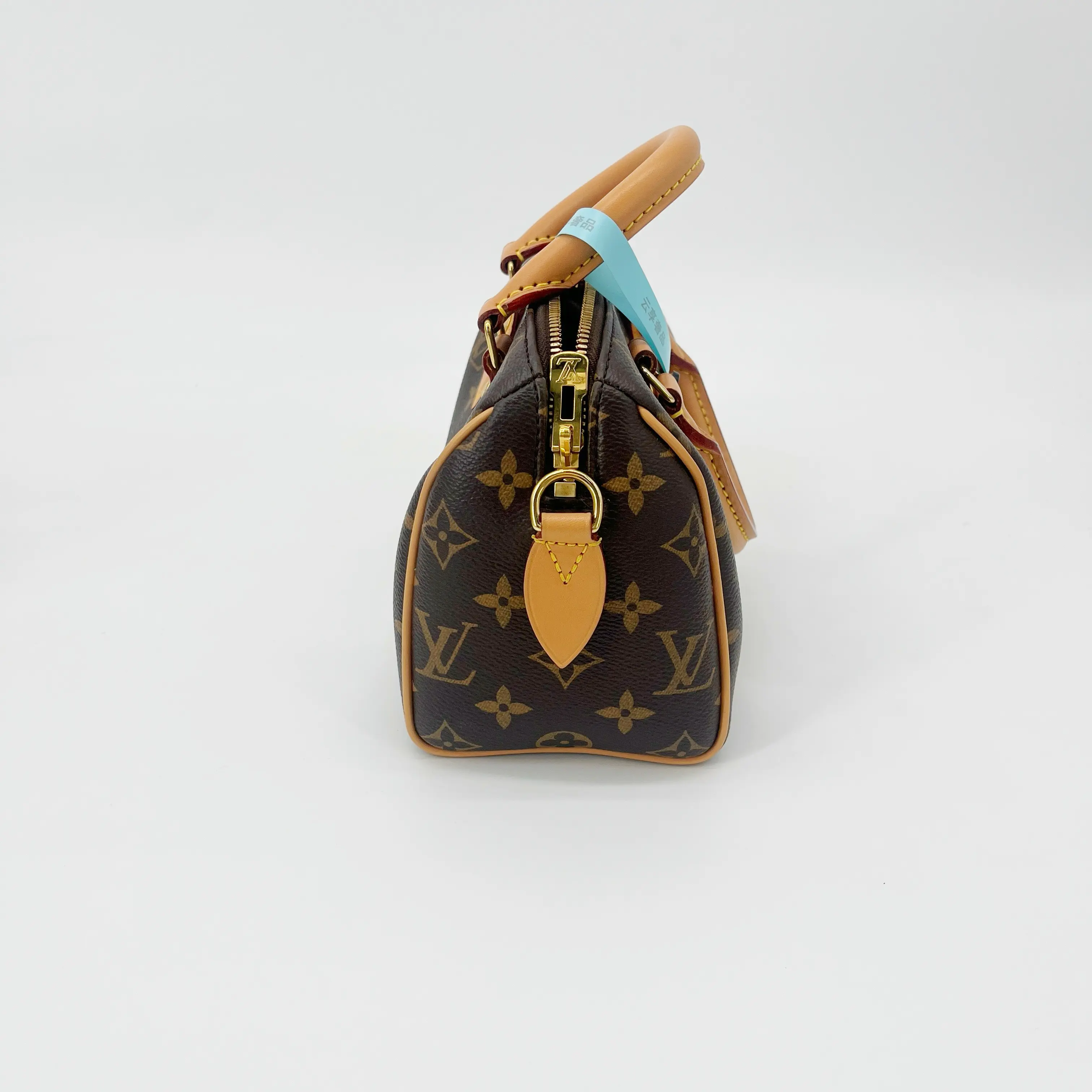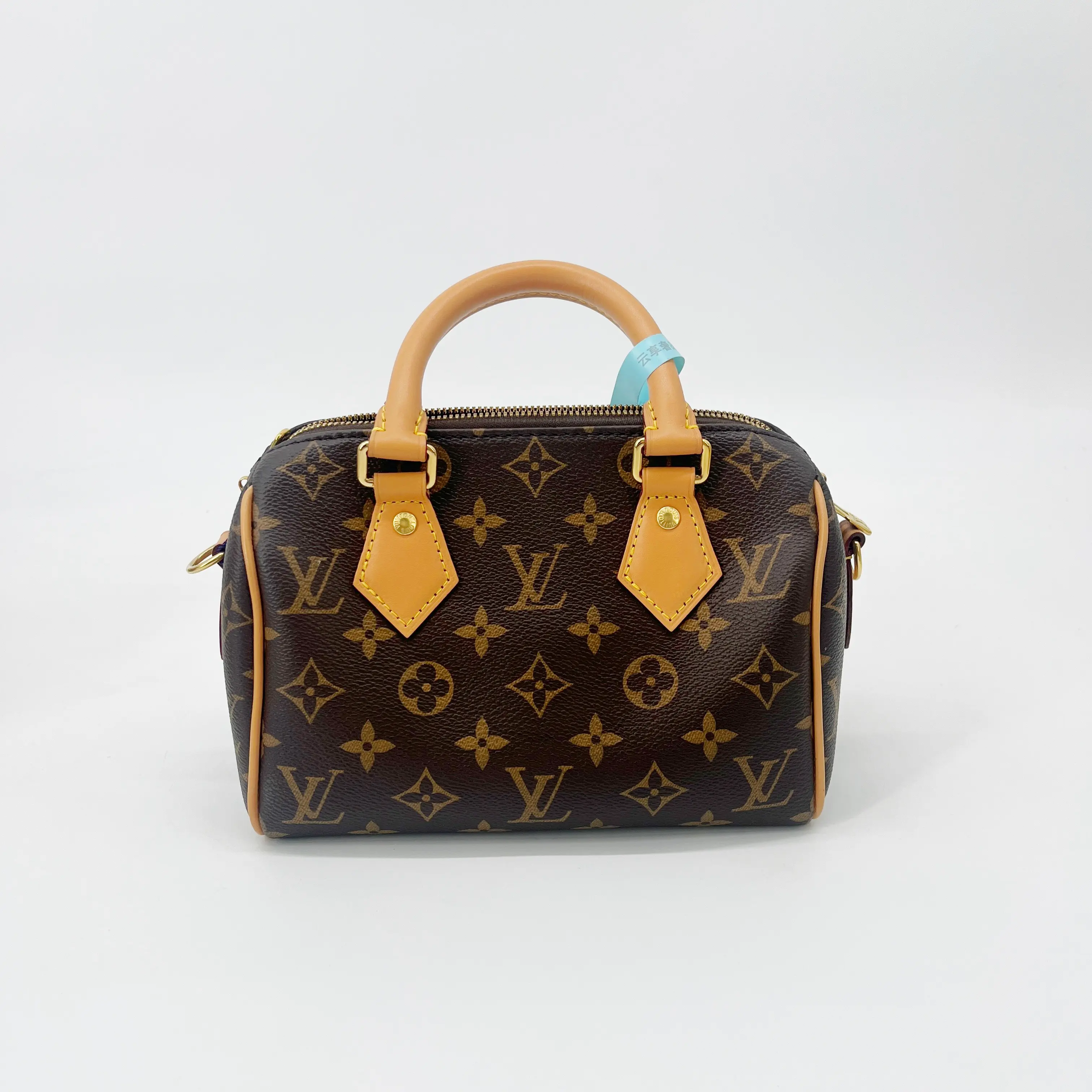 This is an authentic LOUIS VUITTON Monogram Speedy Bandouliere 20 in Beige. This classic handbag is crafted of signature Louis Vuitton monogram coated canvas. The bag features vachetta cowhide leather rolled top handles, an optional beige fabric shoulder strap, and polished gold hardware. The top zipper opens to a red fabric interior with a patch pocket.