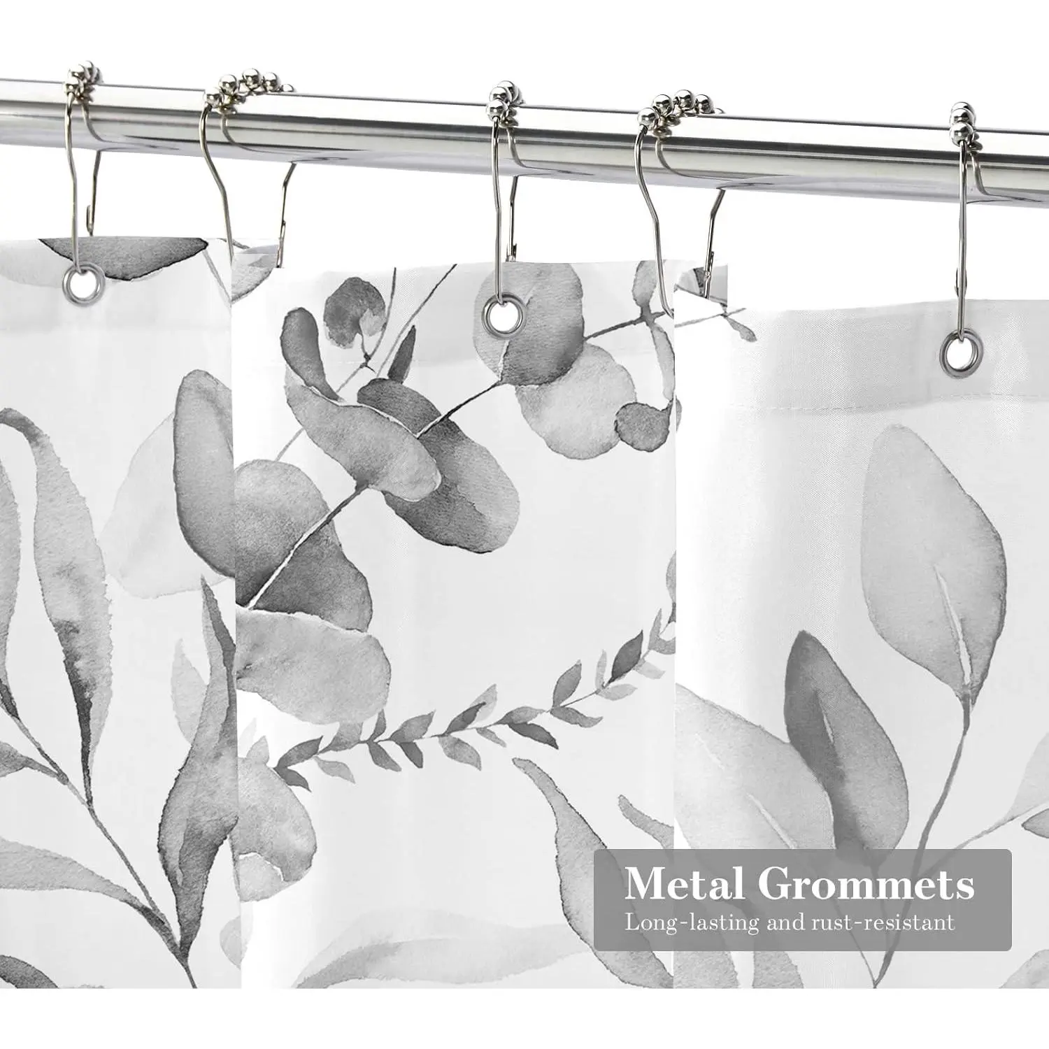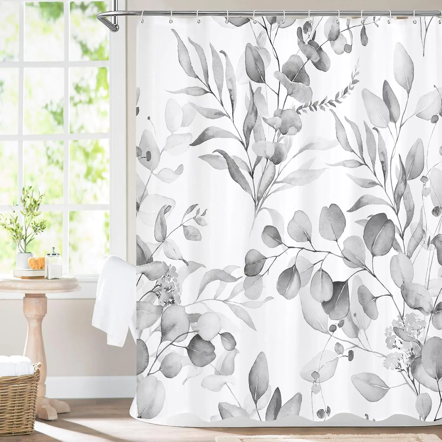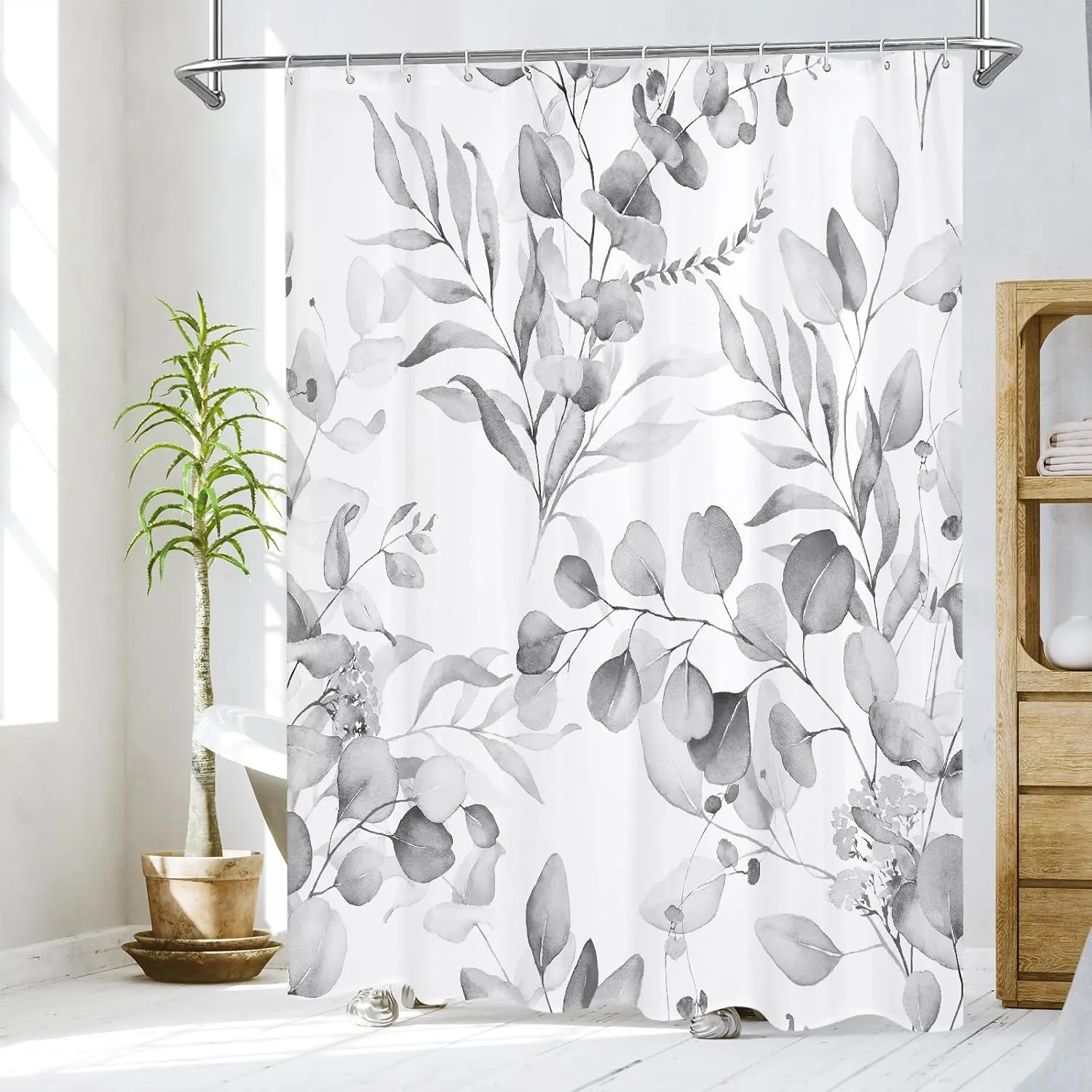 Grey Spring Floral Shower Curtain, Modern Plants Botanical Fabric Cloth Shower Curtains for Chic Elegant Bathroom Decor, Summer Watercolor Eucalyptus Leaf, 72x72