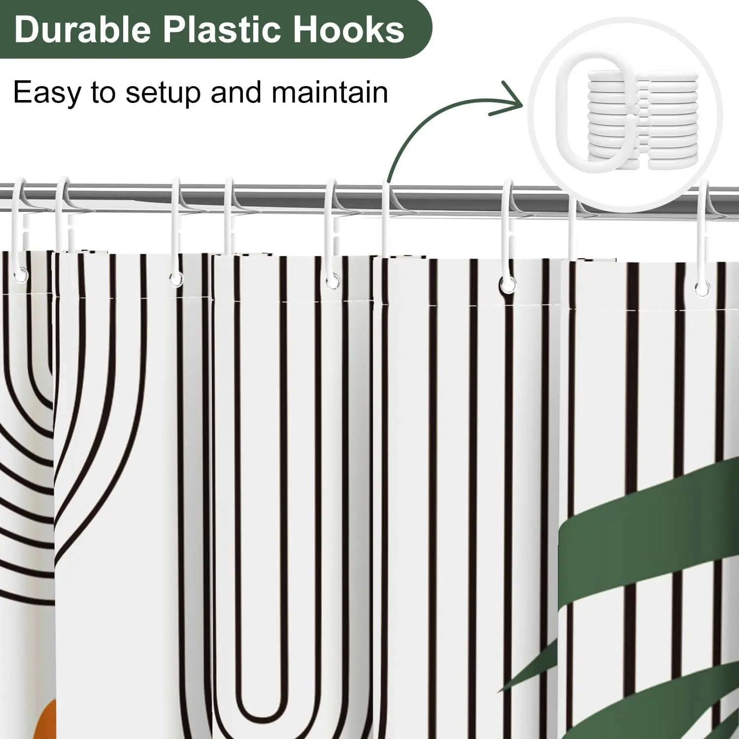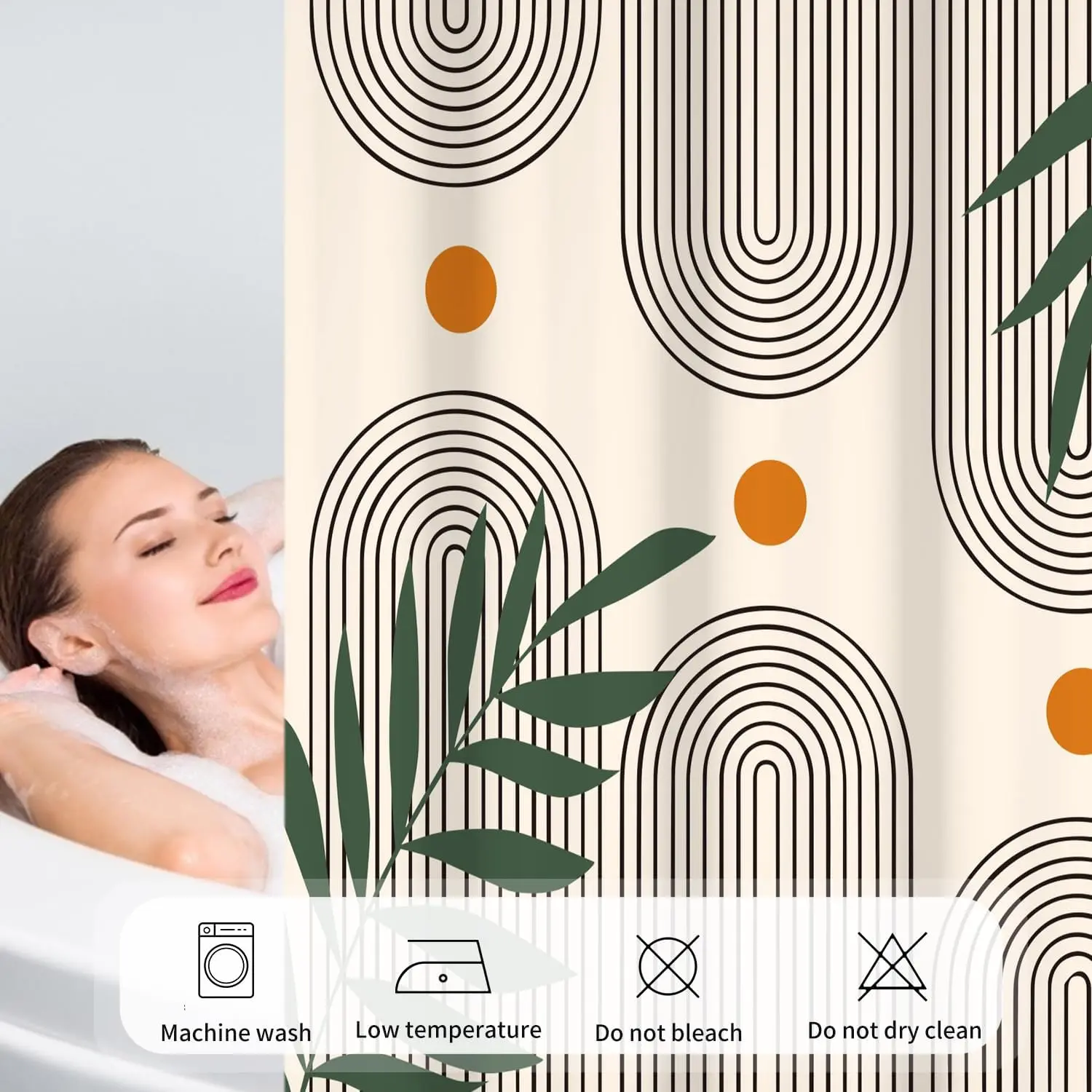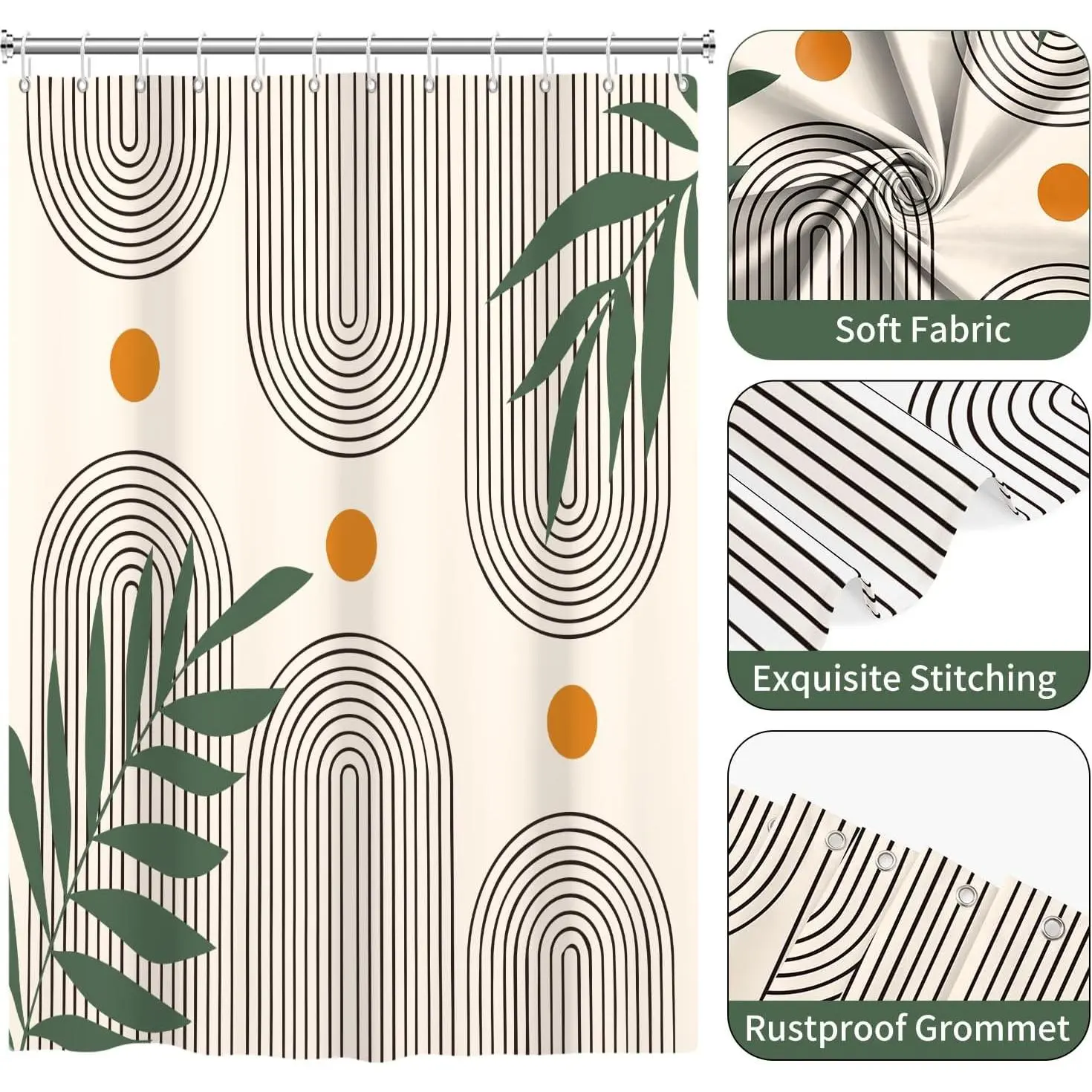 Boho Shower Curtain, Modern Abstract Arch Bathroom Curtain Minimalist Geometric Green Leaves for Home Decor Waterproof Fabric with Hooks, 72x72 Inch
