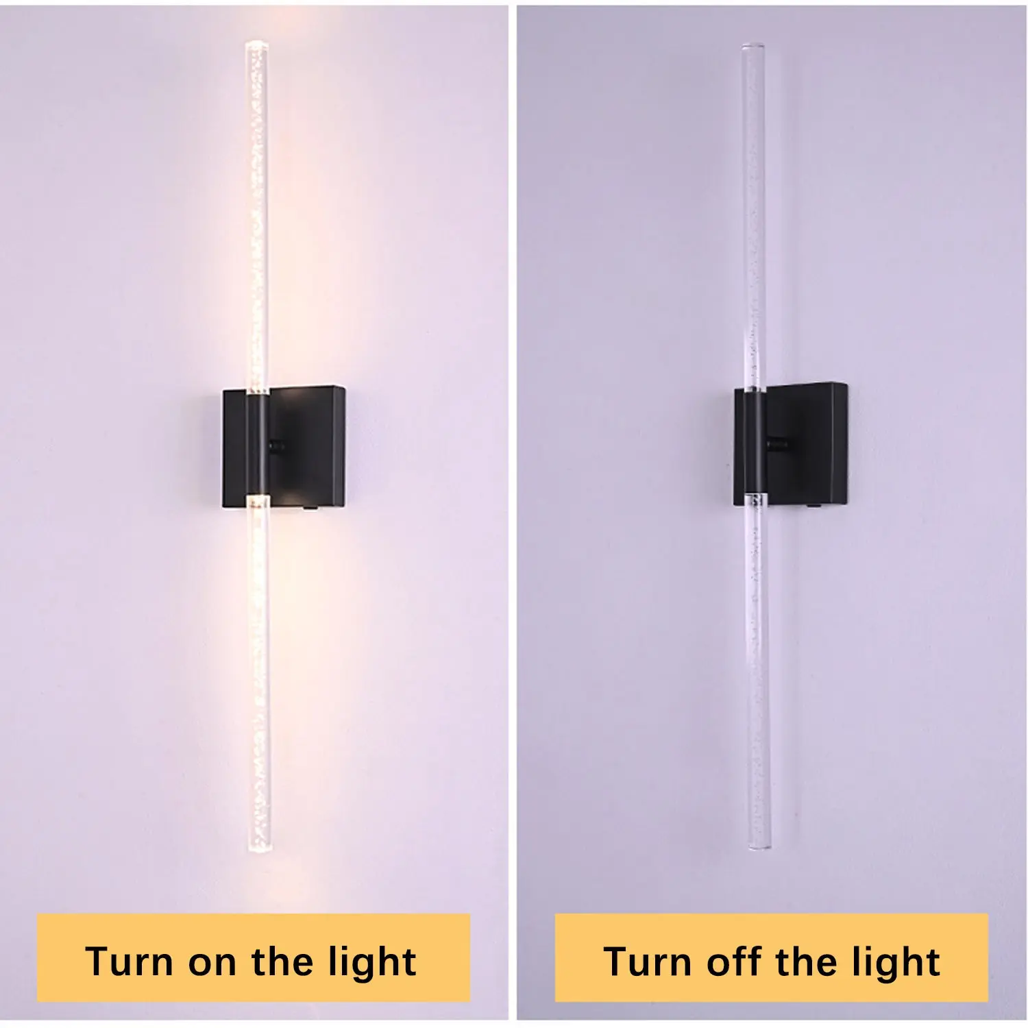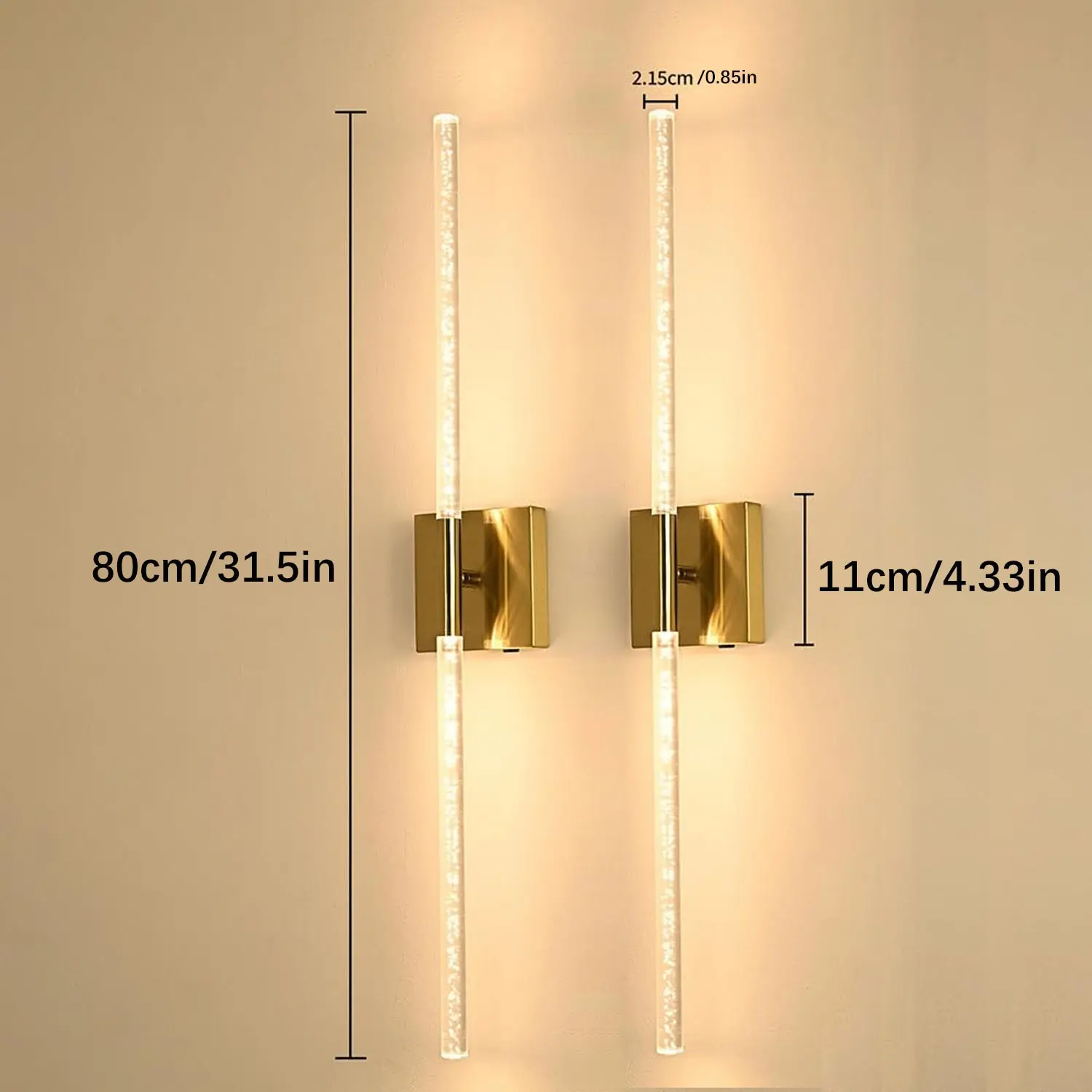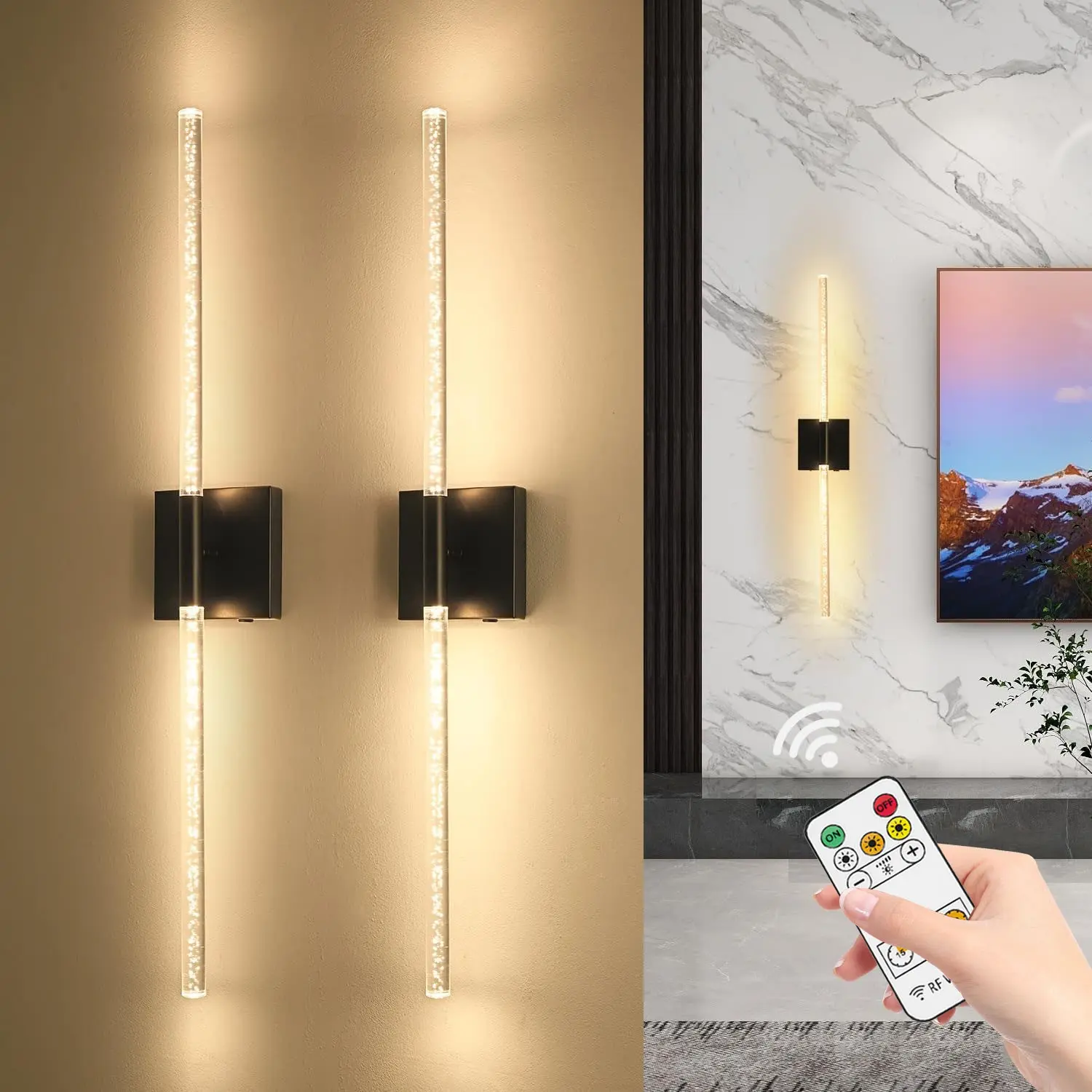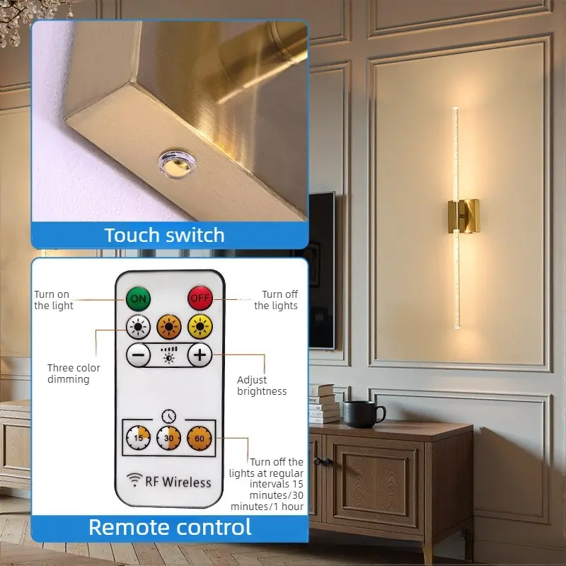 Set of 2 LED Wall Sconces, Black and Gold / 80cm Modern Rectangular Crystal Wall Sconces - Rechargeable with Remote Control - Dimmable - Ideal for living room accent walls, hotel corridors, hallways, and home interiors