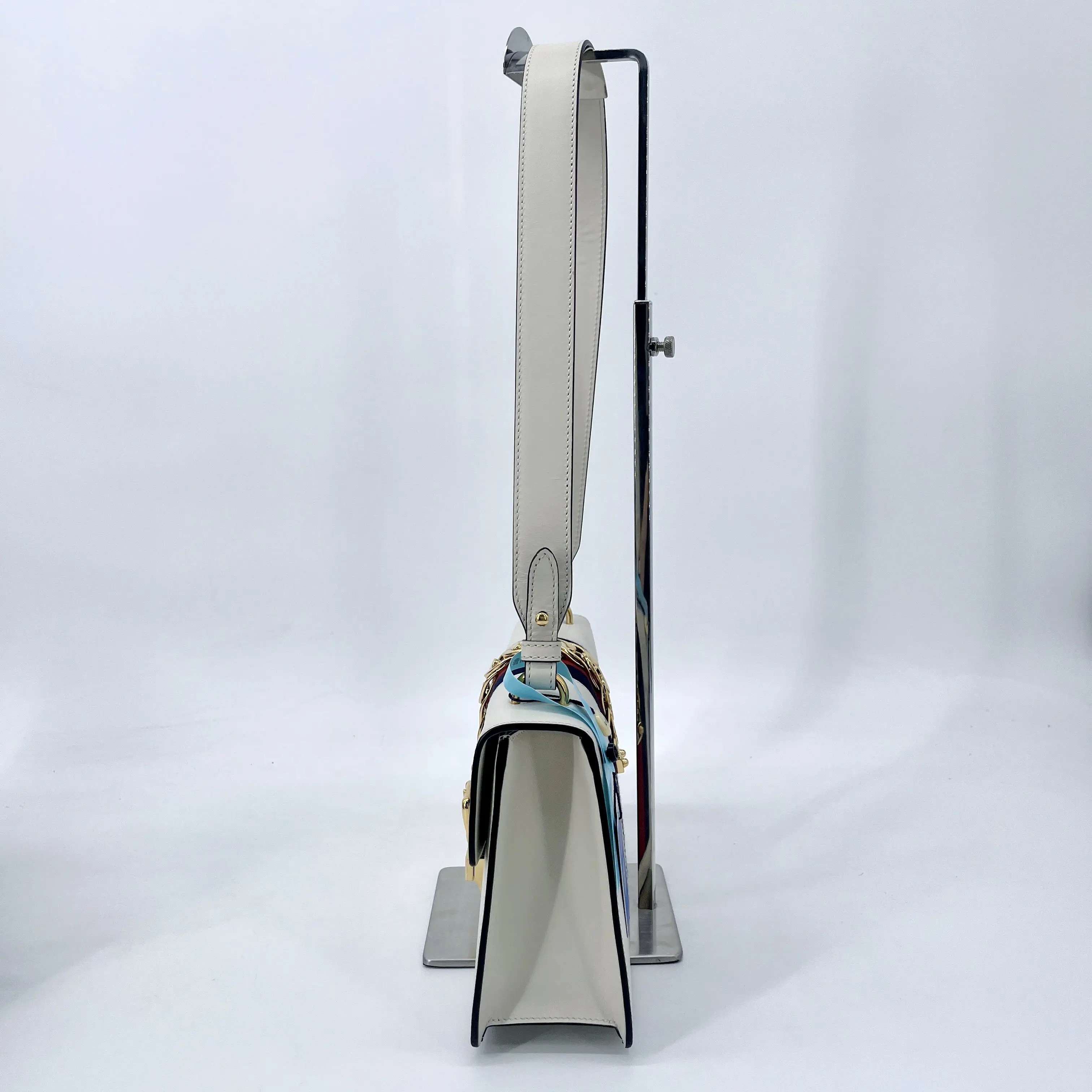 This is an authentic GUCCI Calfskin Super Mini Sylvie Chain Shoulder Bag in White. This chic shoulder bag is crafted of smooth ivory calfskin leather and features a red and navy blue web stripe accented with a gold chain and buckle detail on the crossover flap. This mini clutch comes with an optional gold chain-link shoulder strap and opens to a soft beige microfiber lining with a gold key ring.