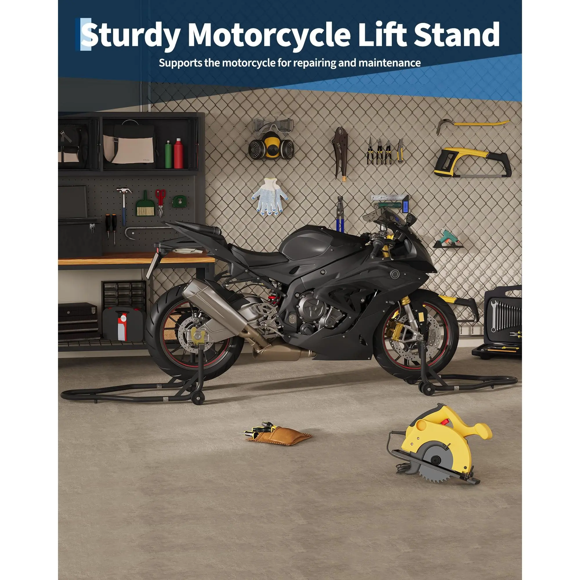 MULTIPLE APPLICATIONS: This stand is ideal for a wide range of scenarios, both at home and in professional repair shops. It provides support for numerous tasks, including vehicle storage, tire changes, maintenance, and part installation. It is also perfect    for detailed jobs such as chain lubrication, oil changes, and general cleaning.