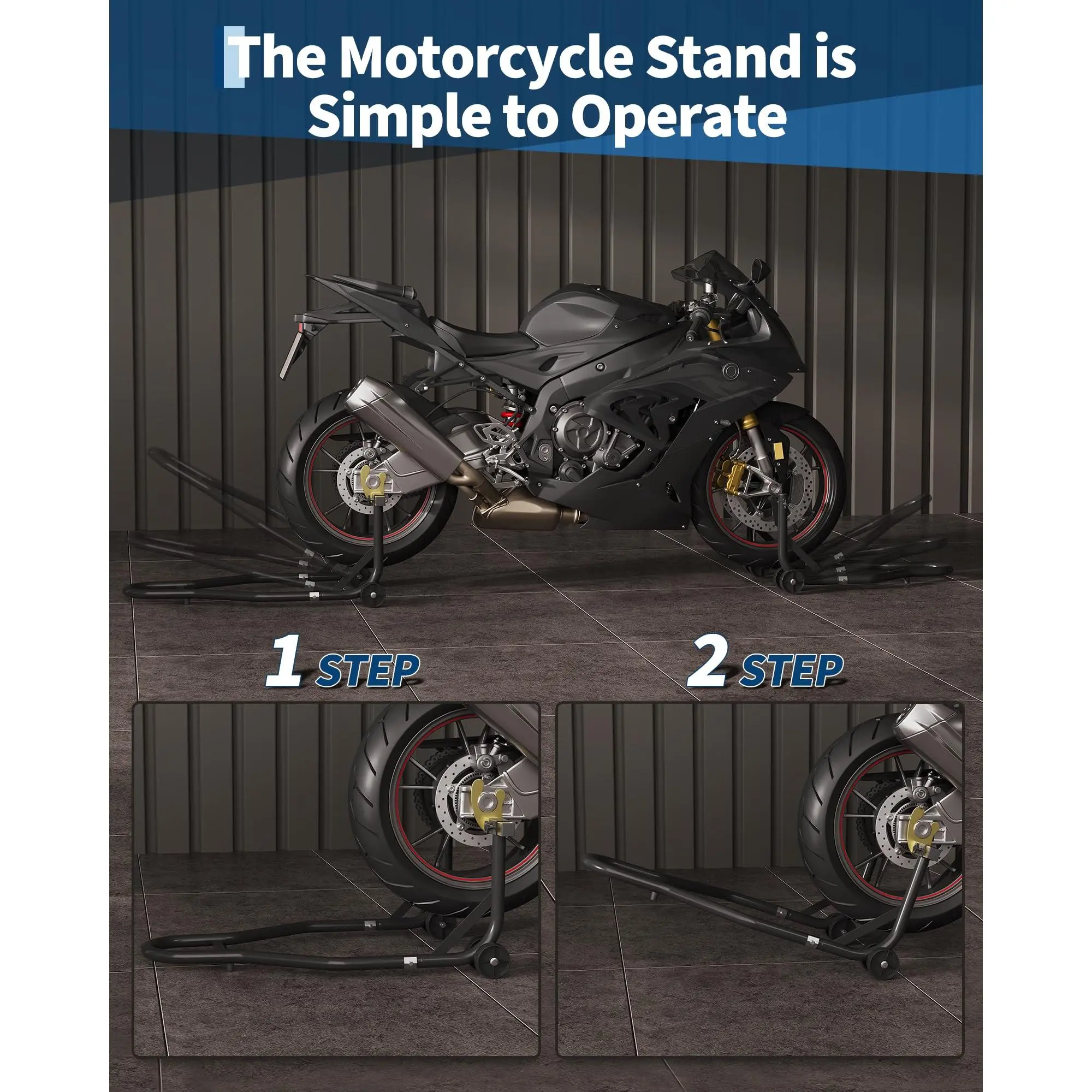 EASY TO USE: This motorcycle stand lift includes detailed assembly instructions with diagrams. One end is securely lifted off the ground without compressing the tire, thereby preventing blowouts and air leaks. The accessories can be installed within minutes,    and the built-in rollers make maneuvering the vehicle effortless, saving both time and energy.