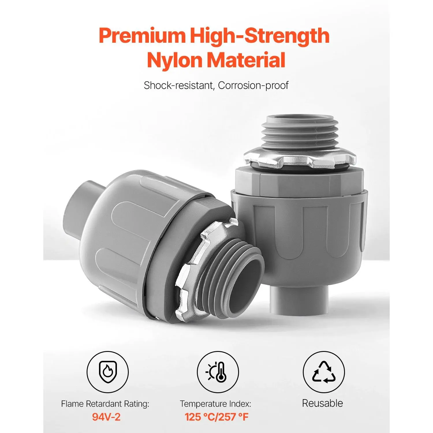 We provide 100 pieces of 1/2-inch liquid tight connectors that are built to last. With impact-resistant and corrosion-proof properties, theyre designed for long-term use. Featuring a 94V-2 flame retardant rating and a 125C temperature index, they bring reliable electrical connections.