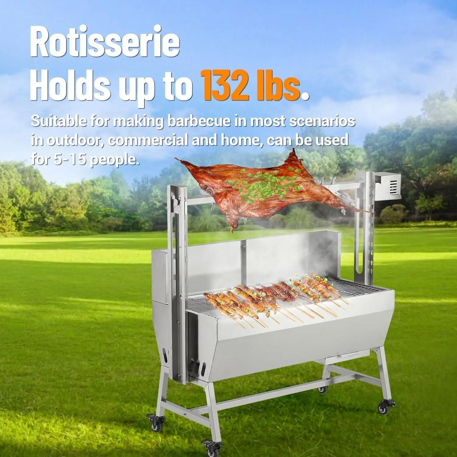 5. Rotisserie Grill With Windscreen Electric BBQ Whole Pig Lamb Spit Grill Stainless Steel Rotisserie Roaster w/ 50W 198 Lbs Capacity Electric Motor Roaster With Lockable Wheels for Camping Outdoor