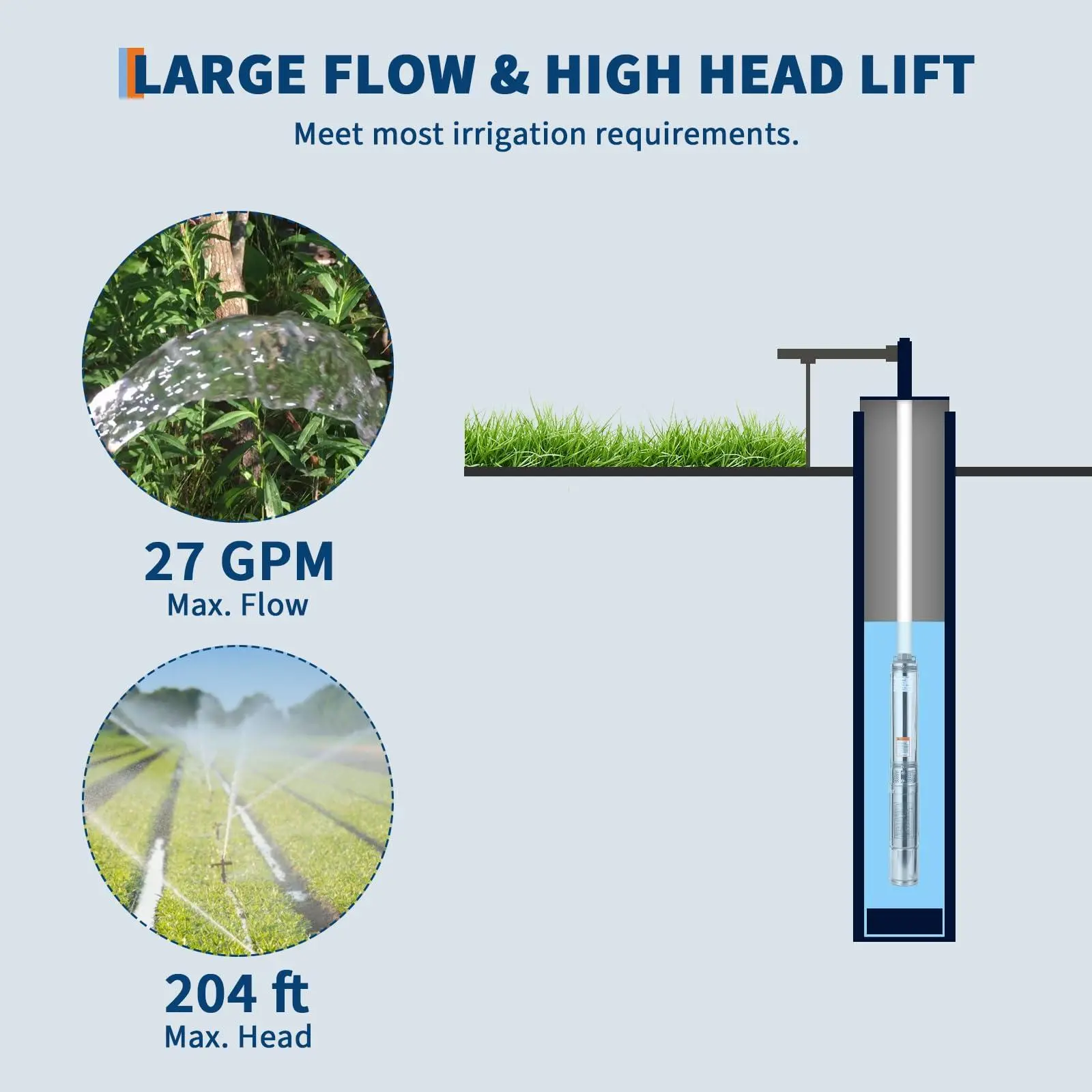【Enhanced Pump Flow & Head】Stainless Steel Submersible Deep Well Pump rated voltage: 110V/60HZ; Rated power:1HP; Diameter: 4" (The diameter of the well needs to be at least 10mm larger than the diameter of the pump); Discharge: 1-1/4" NPT. This deep well submersible pump is designed with 8-stage thermoplastic impellers and a powerful pure copper wire motor, drains up to 27 GPM and can lift water up to 204 ft; Easily pump and transfer water like never before.