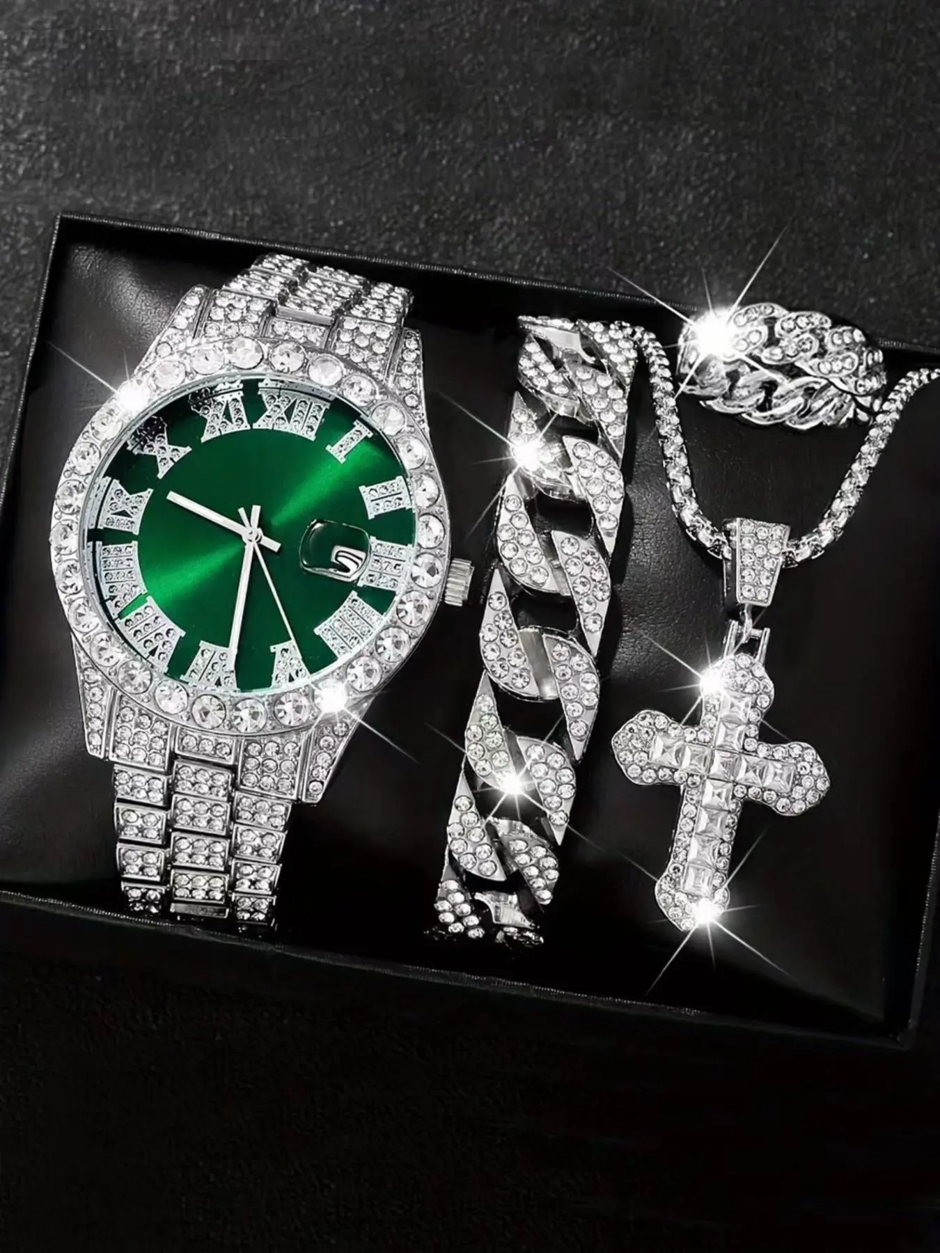 Men's 4-piece quartz watch set - simple style, electronic movement, round zinc alloy case, not waterproof, calendar function, analog display, matching cross necklace, bracelet and ring, fashionable gift