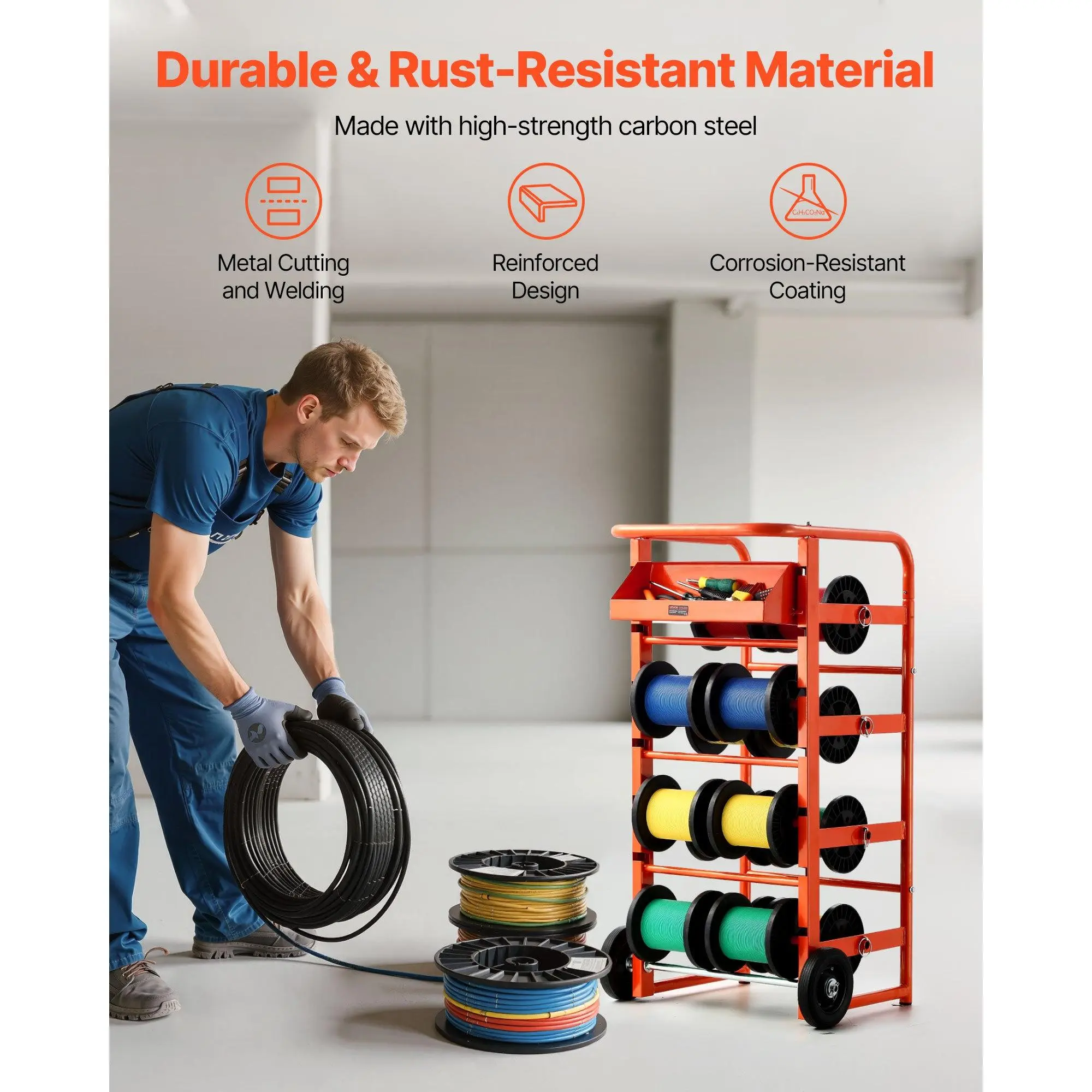 This wire spool rack is built with durable materials and a rust-resistant powder coating, supporting up to 300 lbs. It features 4 central and 5-6 side axle tubes to hold multiple cable spools of various sizes. With two solid rubber wheels, its easy to move, ideal for indoor and outdoor use.