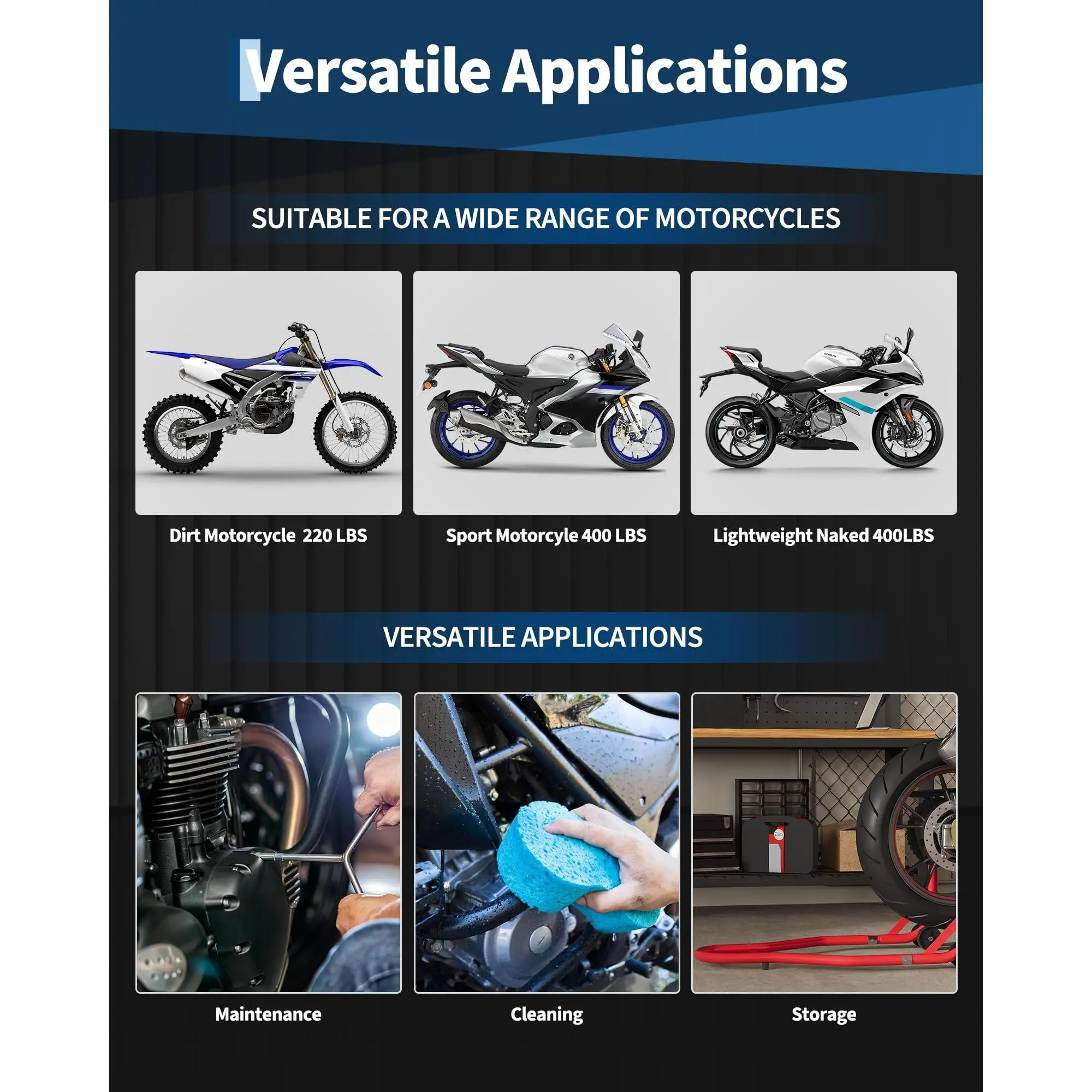 MULTIPLE APPLICATIONS: This stand is ideal for a wide range of scenarios, both at home and in professional repair shops. It provides support for numerous tasks, including vehicle storage, tire changes, maintenance, and part installation. It is also perfect for detailed jobs such as chain lubrication, oil changes, and general cleaning.