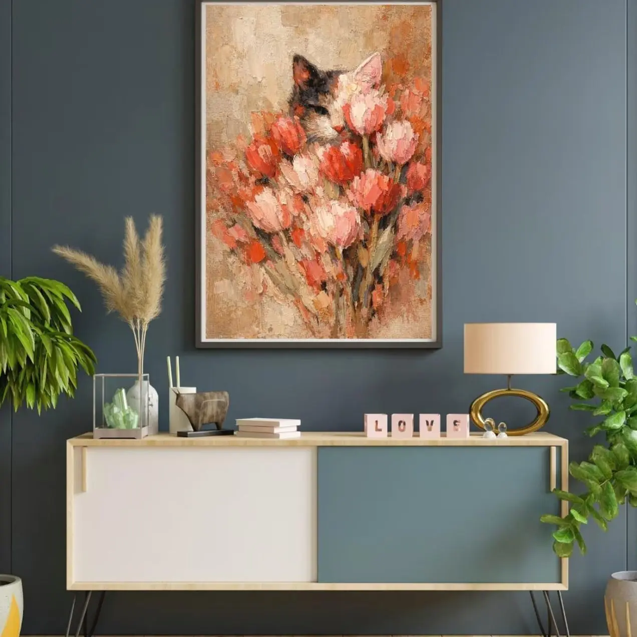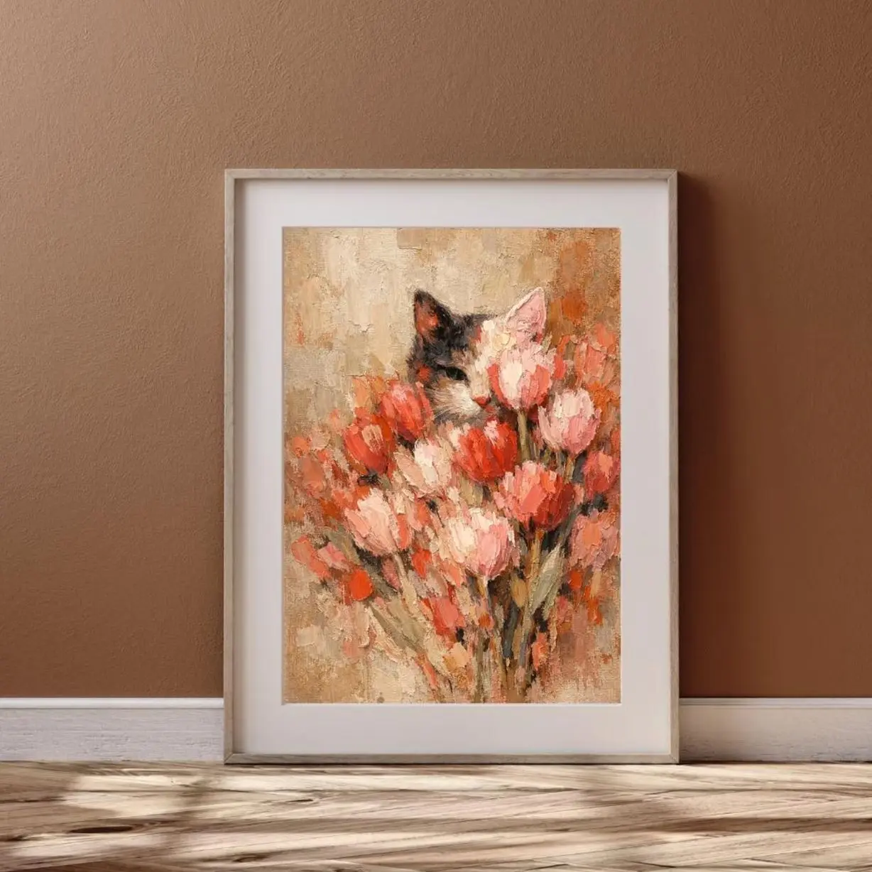 Abstract Cat in Flowers Poster, Pink Tulip Art, Minimalist Home Decor | Unframed B