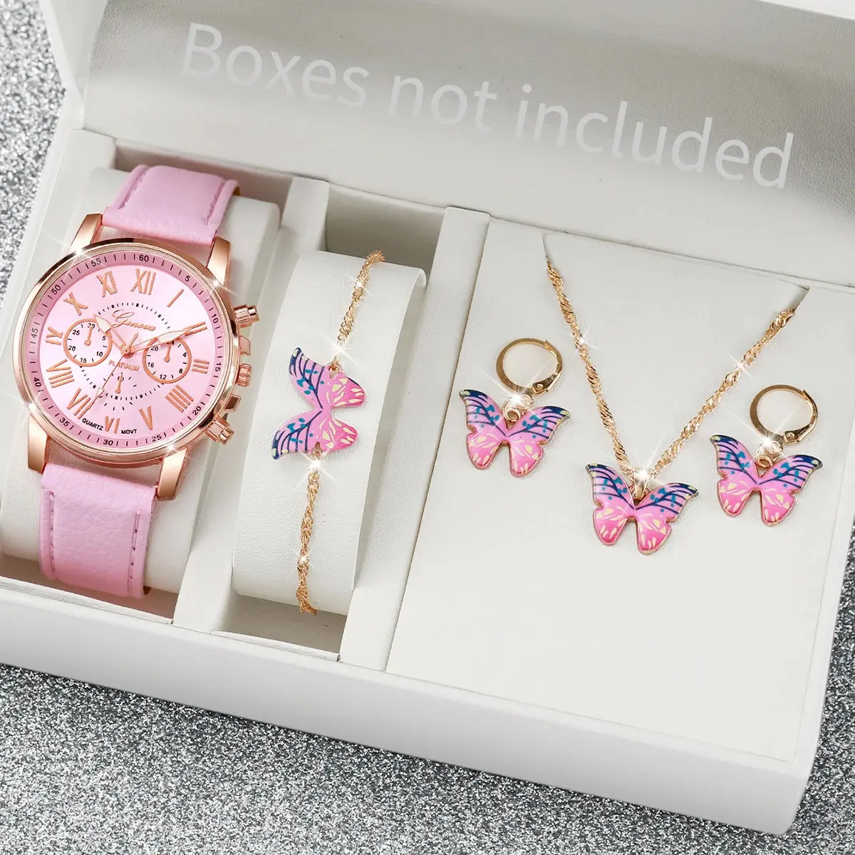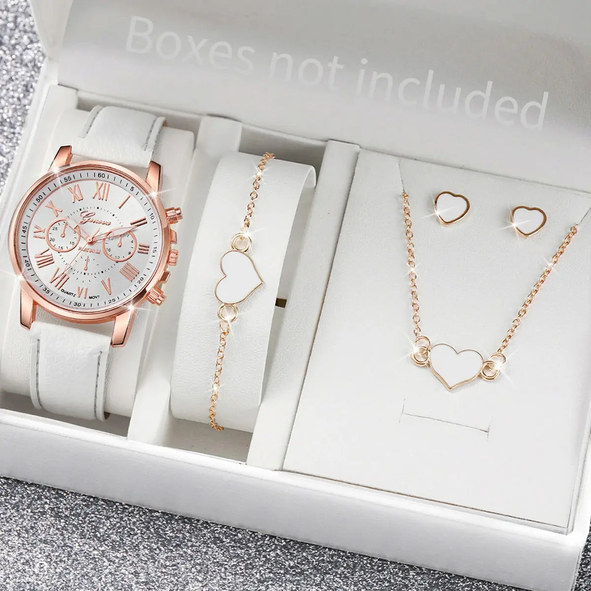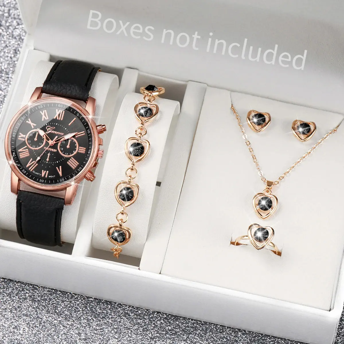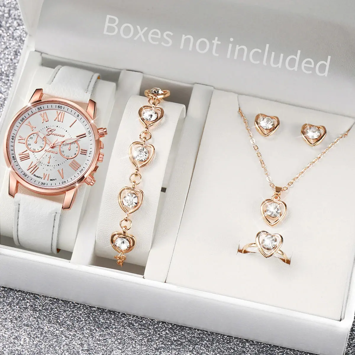 5/6PCS Fashion Women's Quartz Watch Leather Band Analog Wrist Watches Heart Rhinestone Jewelry Set(Without Box)