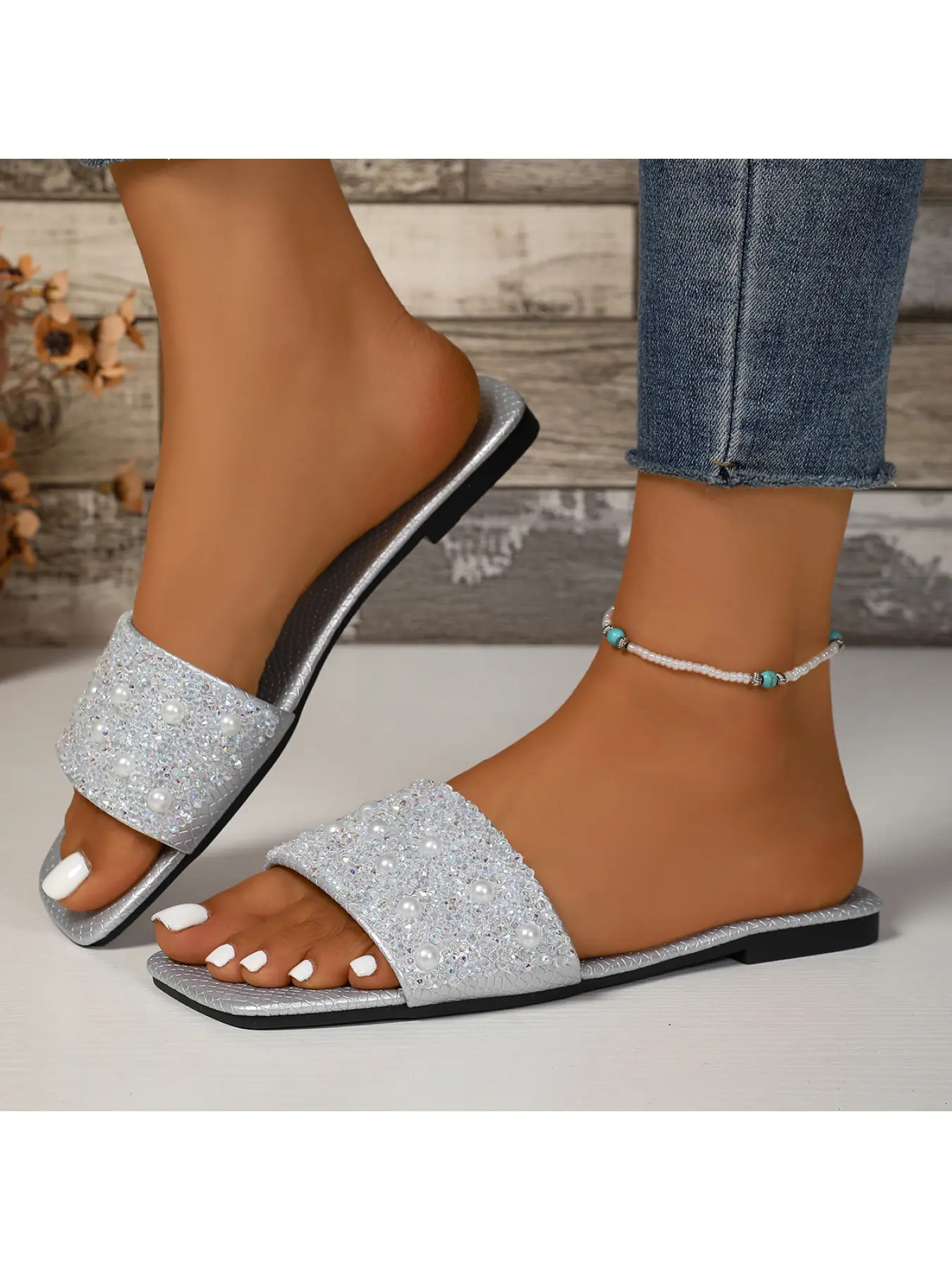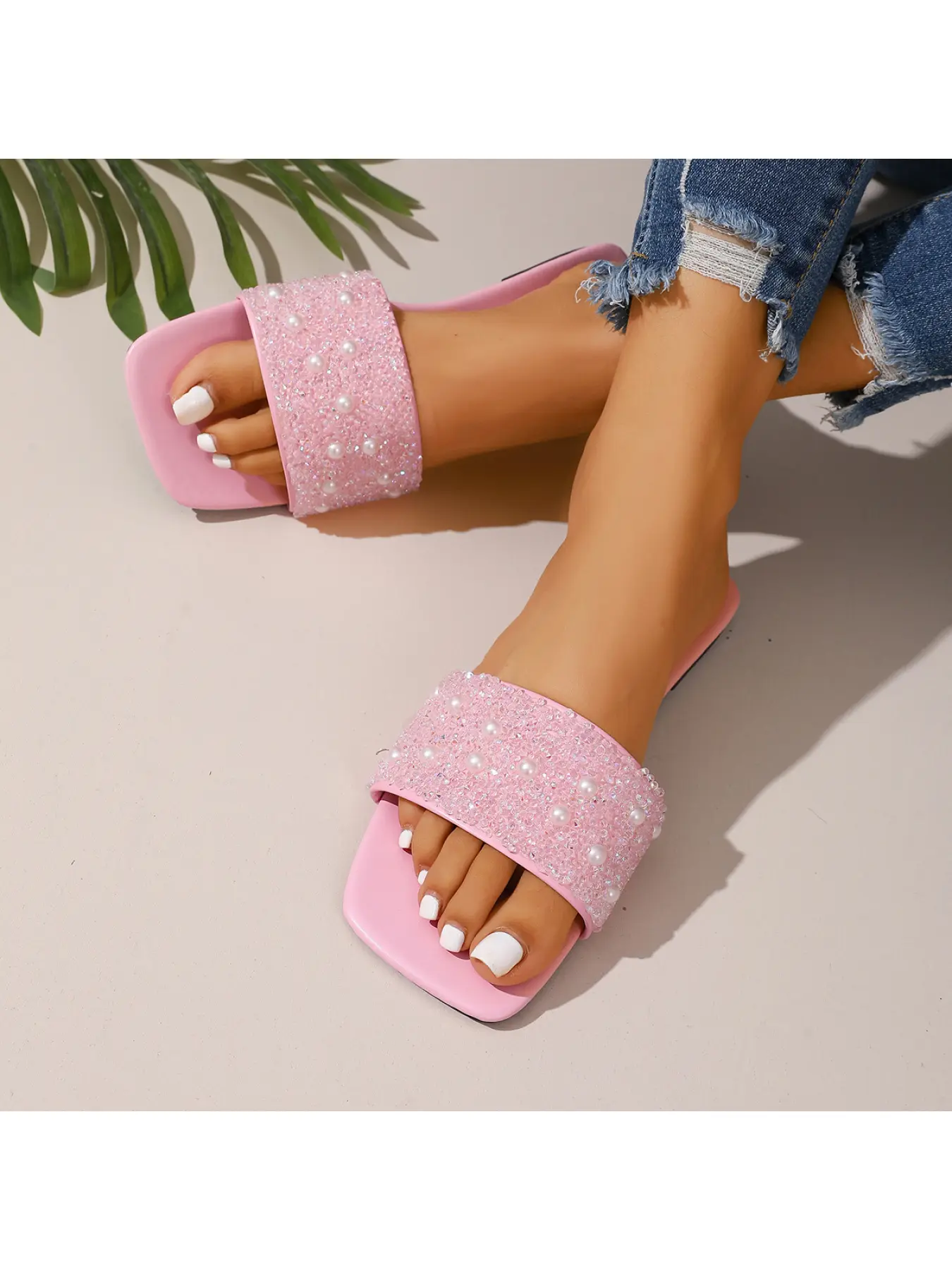 Women's slippers with pearl and rhinestone design, shiny flat slippers, comfortable and essential for home wear and dating.