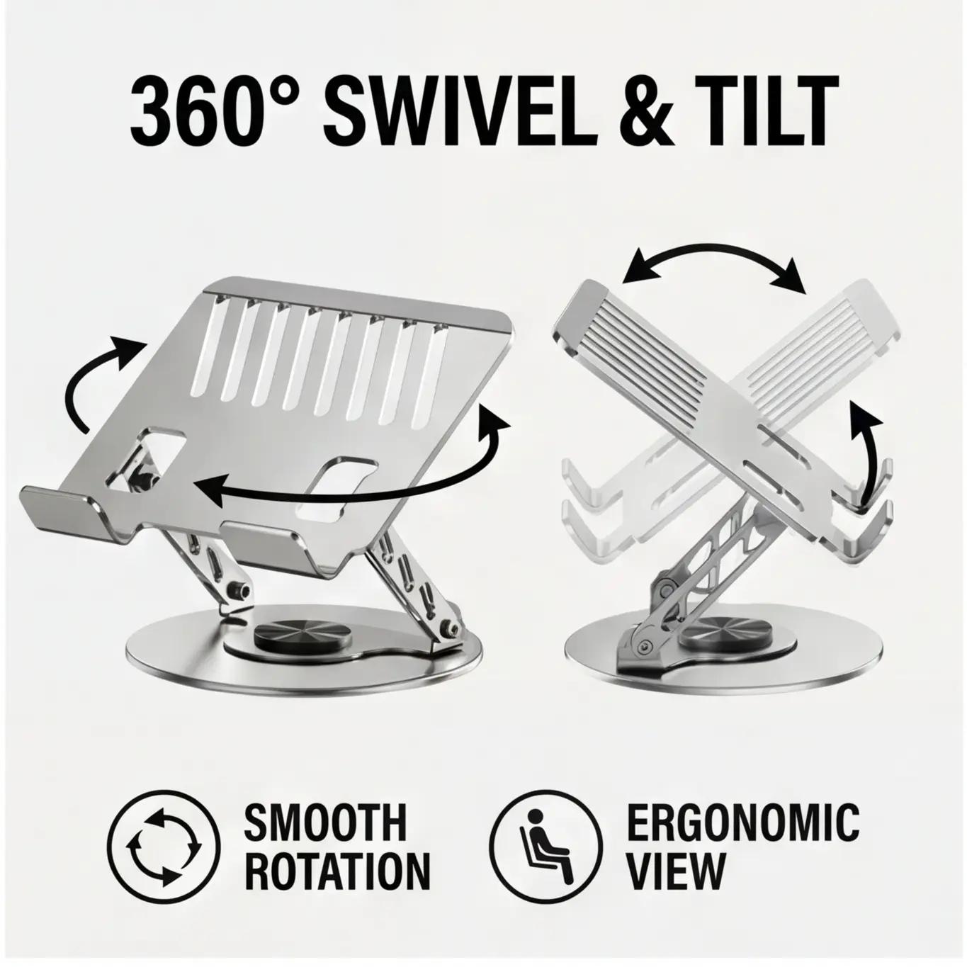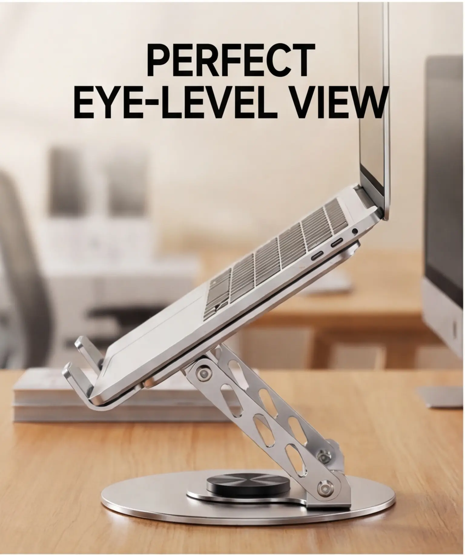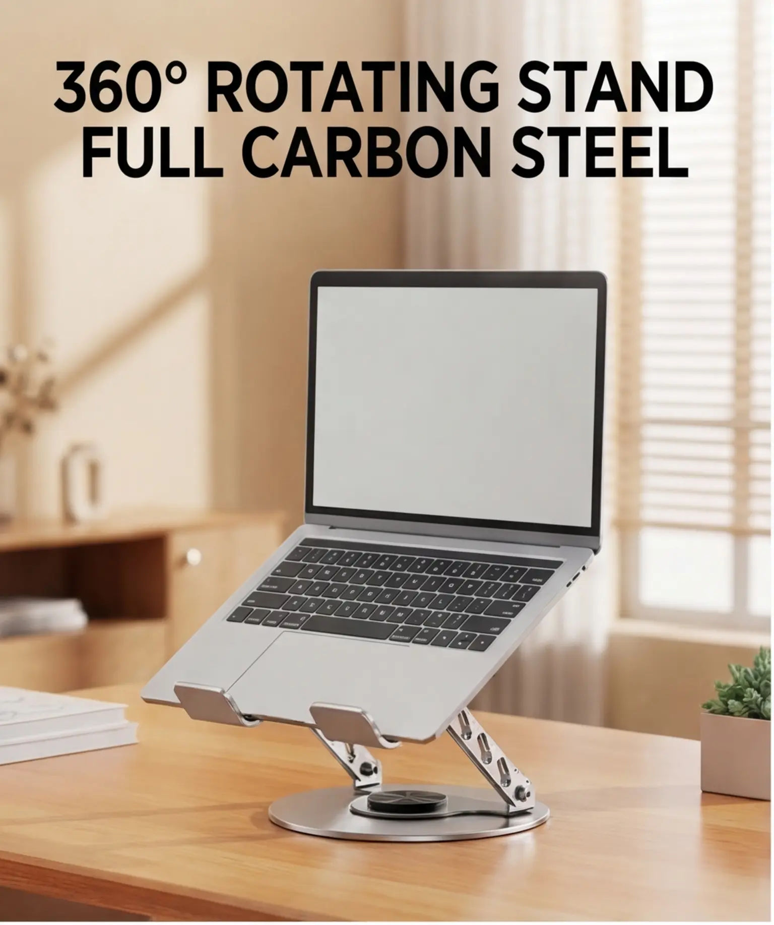 360° Rotating Swivel Base + Fully Adjustable Ergonomic DesignEquipped with a smooth 360° rotating base for seamless angle adjustment, plus multi-height tilt settings to customize your viewing position. This ergonomic carbon steel laptop riser relieves neck, shoulder, and back pain, corrects posture, and elevates your home office setup, gaming station, and student dorm workspace to pro-level comfort.