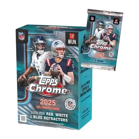 Topps presents the 2025 NFL Chrome Football Trading Card Value Box! Each box contains 7 packs with 4 cards per pack! Look out for Red, White, & Blue Refractors! Chase Rare Helix, Let's Go and Fanatical Inserts! Content may vary