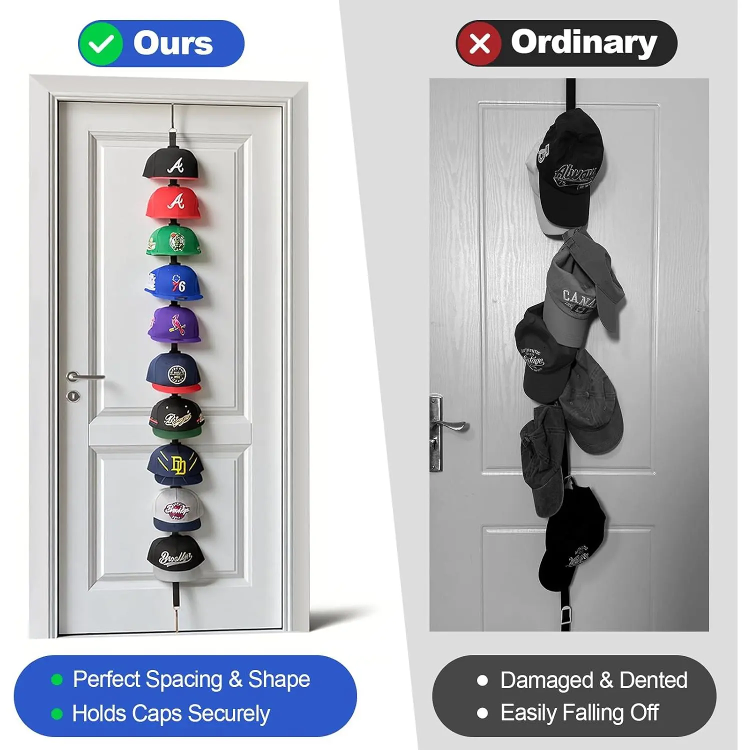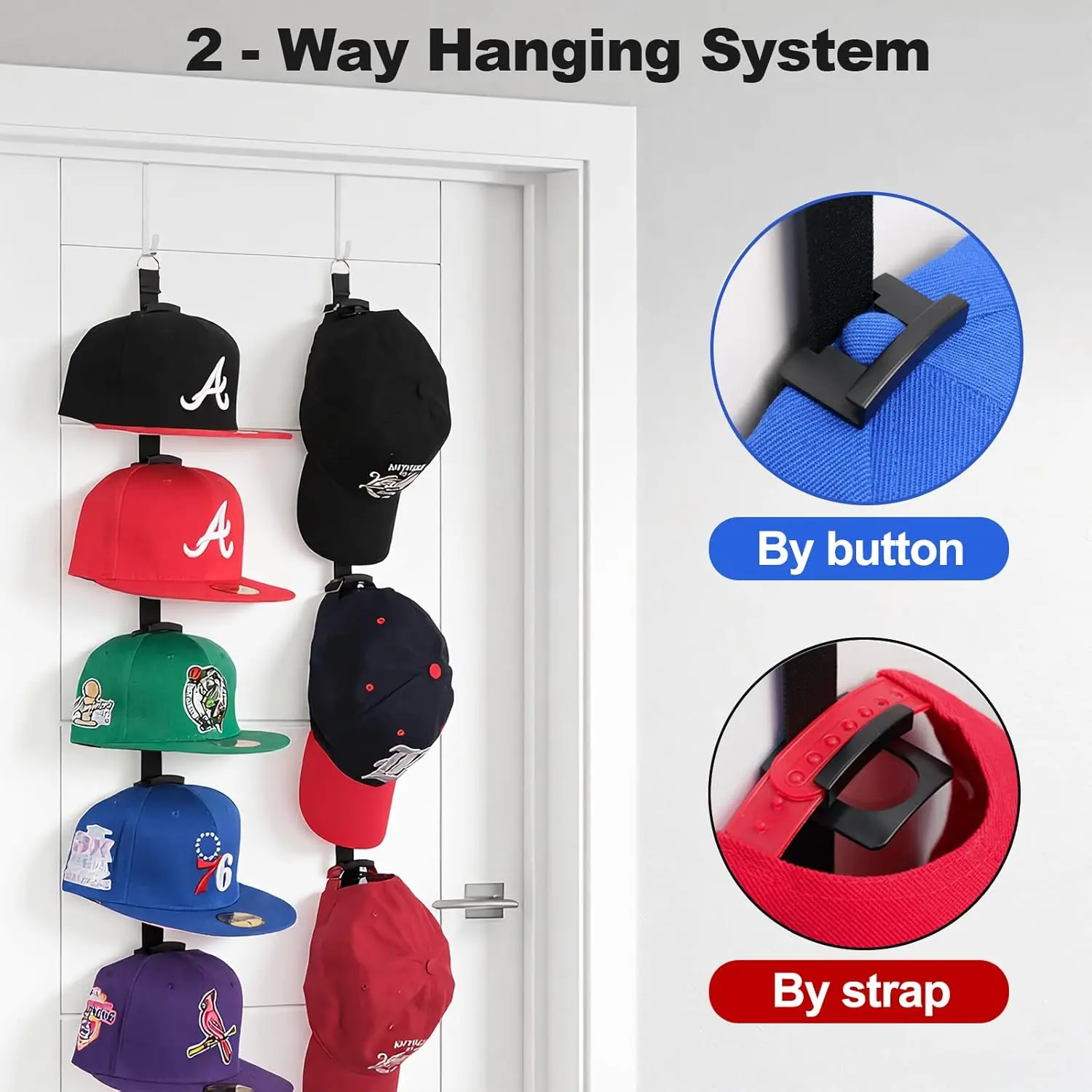 Hat Rack for Door - Two-Way Hanging Caps with Display Hooks and Hanger, Hat Organizer for Baseball Caps, Over the Door Hat Storage Organizer for Bedroom, Entrance or Garage Doors - 2 Packs