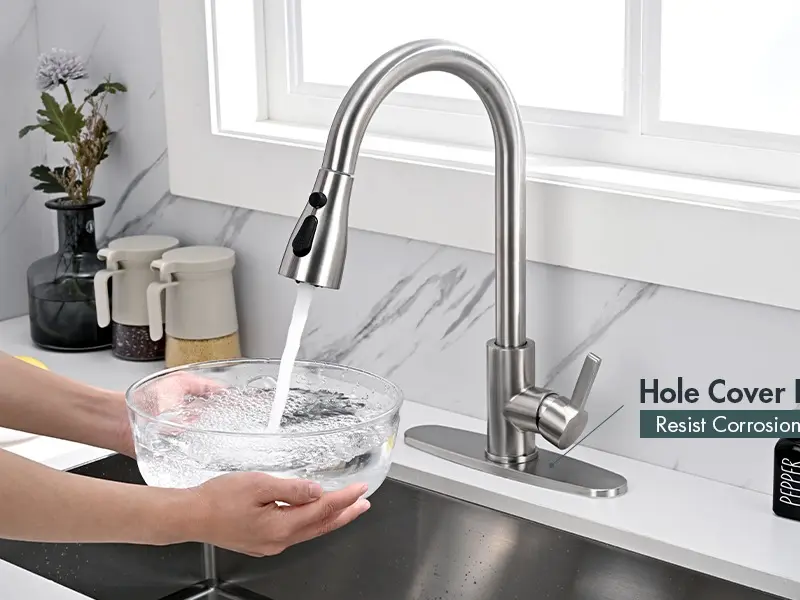 ·High-Arc Pull-Down Sprayer:360° swivel spout with 2 spray modes (stream for filling pots + spray for rinsing) and a flexible hose for full sink coverage.