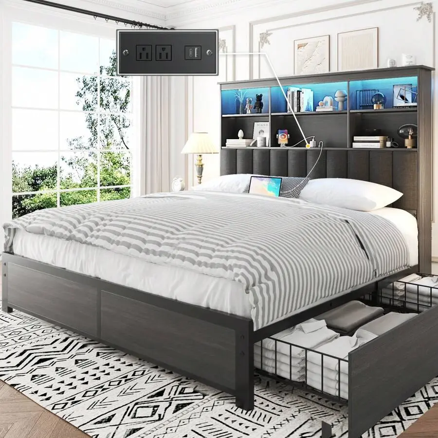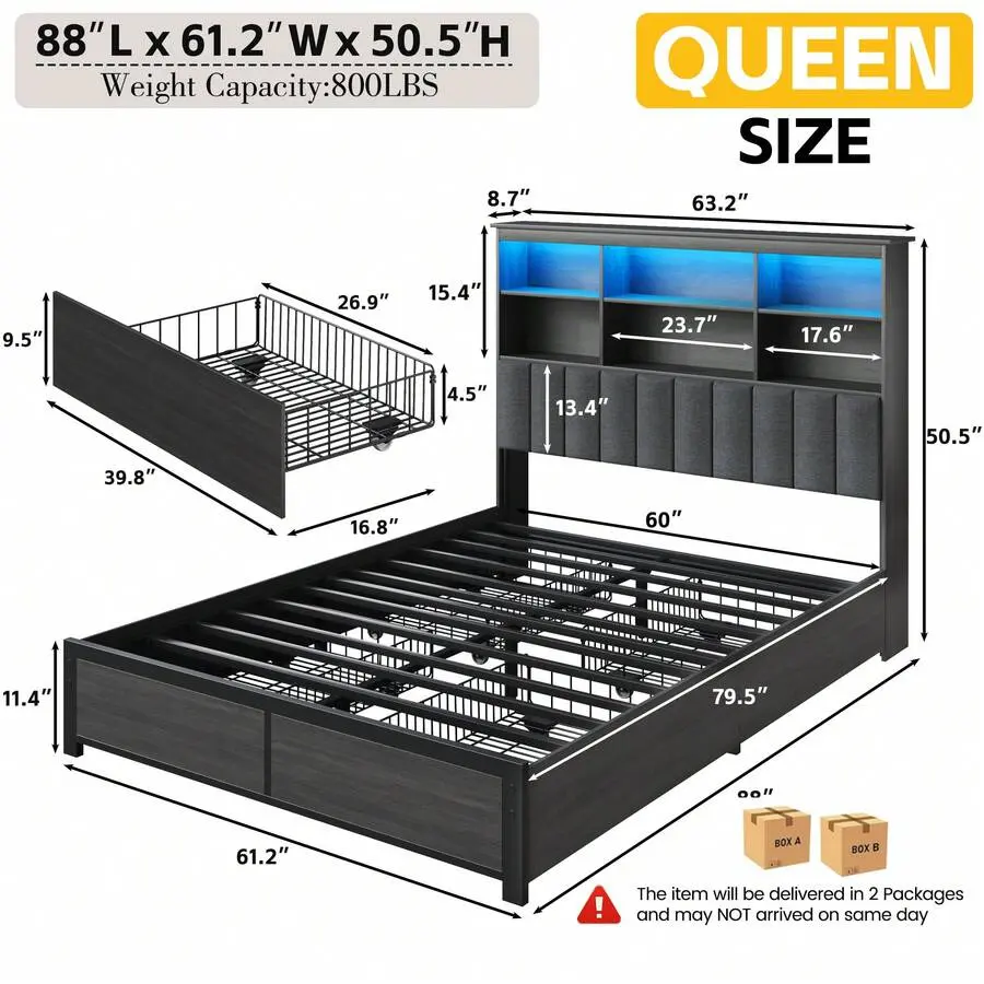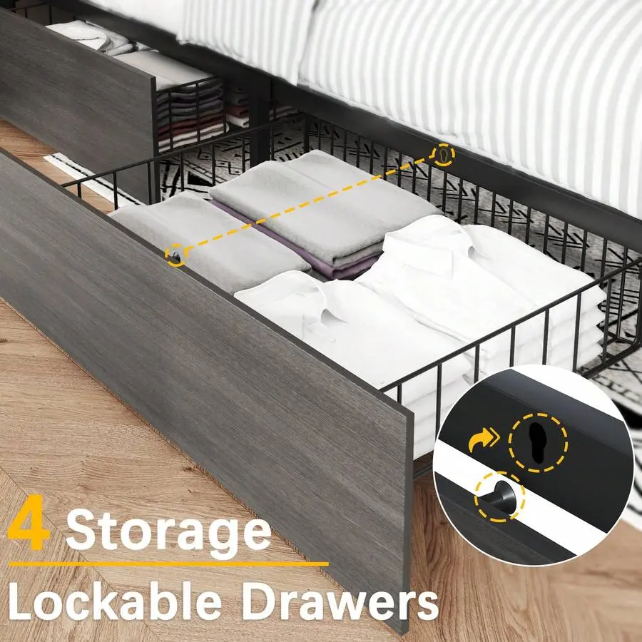 5.4 Lockable Storage Drawers:With 4 underbed sliding drawers to hold your personal belongings as needed, the 4 large capacity drawers will fulfill your daily storage needs. And we upgraded the drawers by fixing them under the bed if needed so that they can't slide freely, making your bedroom look more neat and clean.