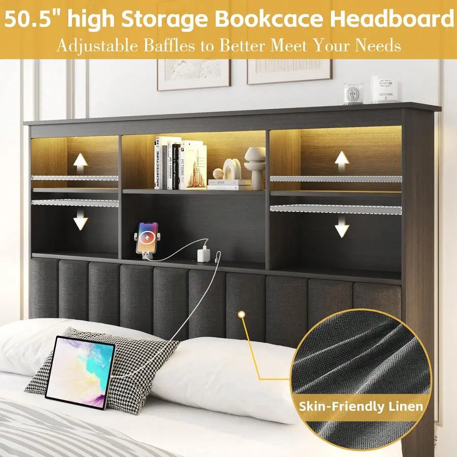 1.Adjustable headboard bookcase:The design of the nightstand is combined with the bookcase, and the large-capacity bookcase is more convenient for you to put your personal belongings.The two ends of the bookcase have three adjustable location for your choice, which can be flexibly adjusted according to your needs.