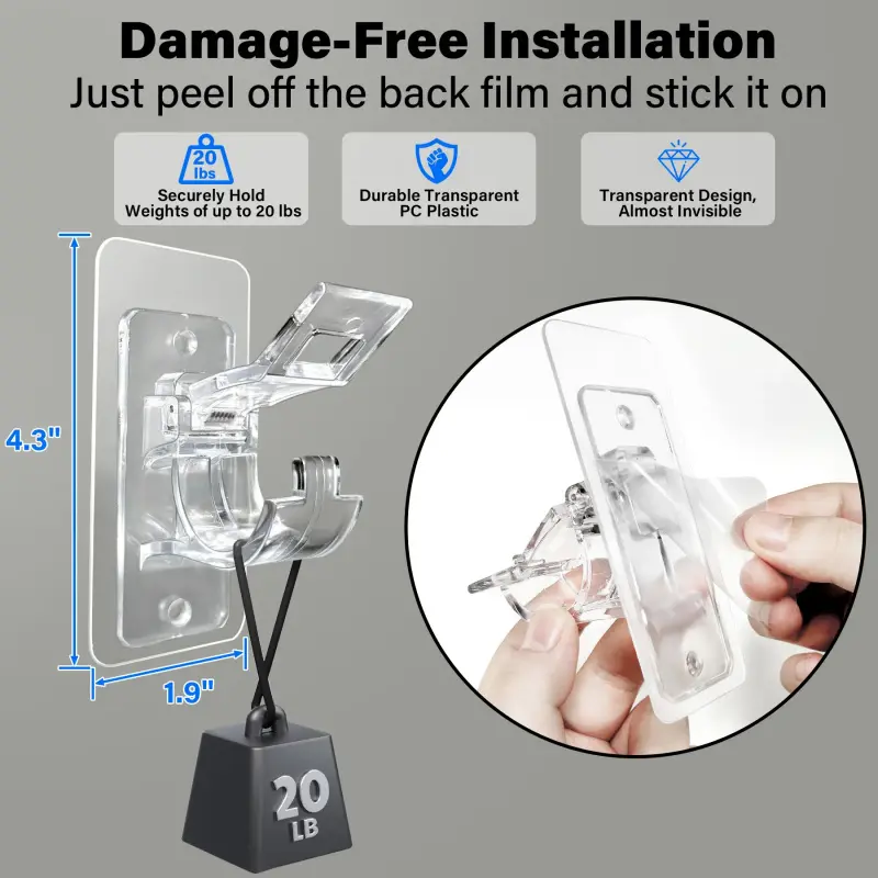 6-piece set, can support 20 pounds - Made with the latest nano-acrylic gel pads and high-transparency PC plastic, rust-proof, non-yellowing, non-deforming, and environmentally friendly.It has extremely strong adhesive force and can support a weight of 20 pounds.Simply peel off the backing film and stick it on.For fishing rods weighing over 20 pounds, using multiple adhesive hooks can help distribute the weight of the fishing rod.You will receive 6 curtain brackets that do not require drilling