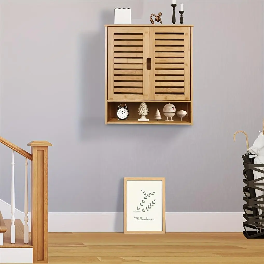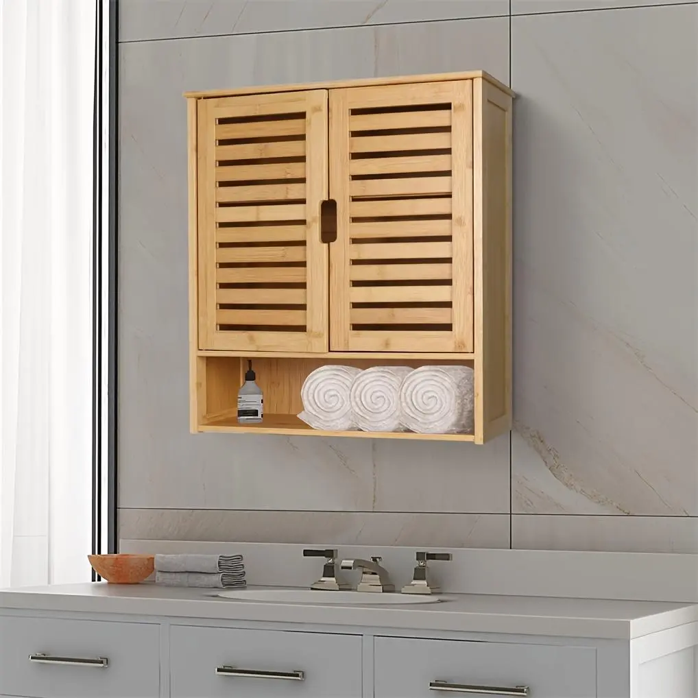 Wall Cabinet Storage Multifunctional Bamboo Wood Bathroom Kitchen Wall Cabinet with 3 Shelves Medicine Storage Organizer