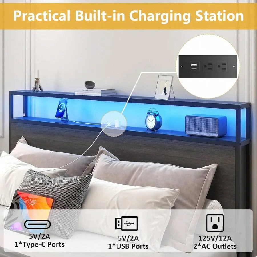 Dual-tier headboard and charging station: The double headboard is equipped with two standard sockets, a USB socket, and a Type-C socket to meet the changing needs of your electronic devices, ensuring you can enjoy using your electronics in bed.At the same time, the middle compartment offers some storage space for your electronics and books.