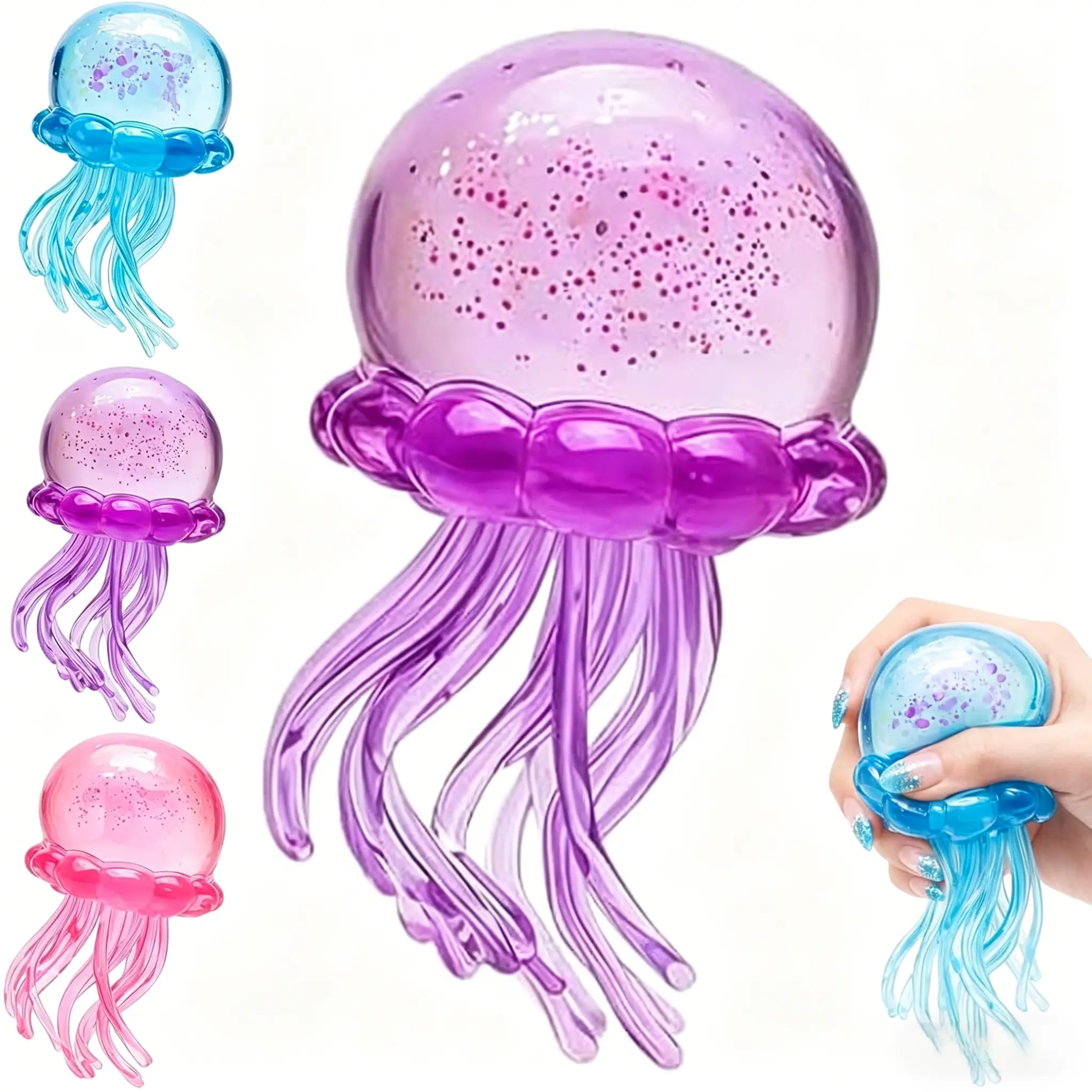 This jellyfish squeeze stress ball is designed to provide effective anxiety and stress relief for both kids and adults. Made with soft and elastic material, it offers a comfortable squishy and stretchy sensory experience that helps calm nerves and improve focus. Its cute jellyfish shape and smooth jelly texture make it fun to hold and play with anywhere. Portable and lightweight, this sensory fidget toy is perfect for daily use at home, school, office or travel. It serves as a great relaxing gift for people of all ages to relieve tension and enjoy quiet sensory play.