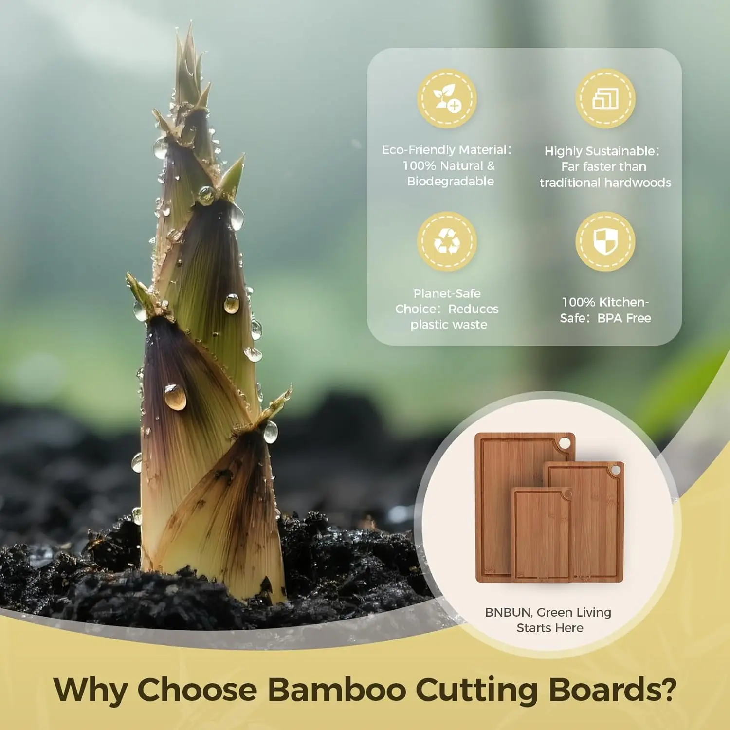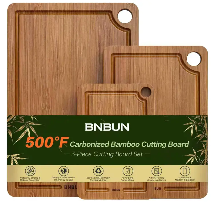 ·【Extra Durable and Eco-Friendly Construction】cutting board These cutting boards are charred at 500°F (260°C) to absorb only 5% moisture. Made from sustainably sourced organic bamboo, which grows 30 times faster than hardwood, they are both environmentally friendly and durable. Cross-laminated for added toughness, these kitchen bamboo cutting boards resist warping and cracking with everyday use, enhancing their stability.