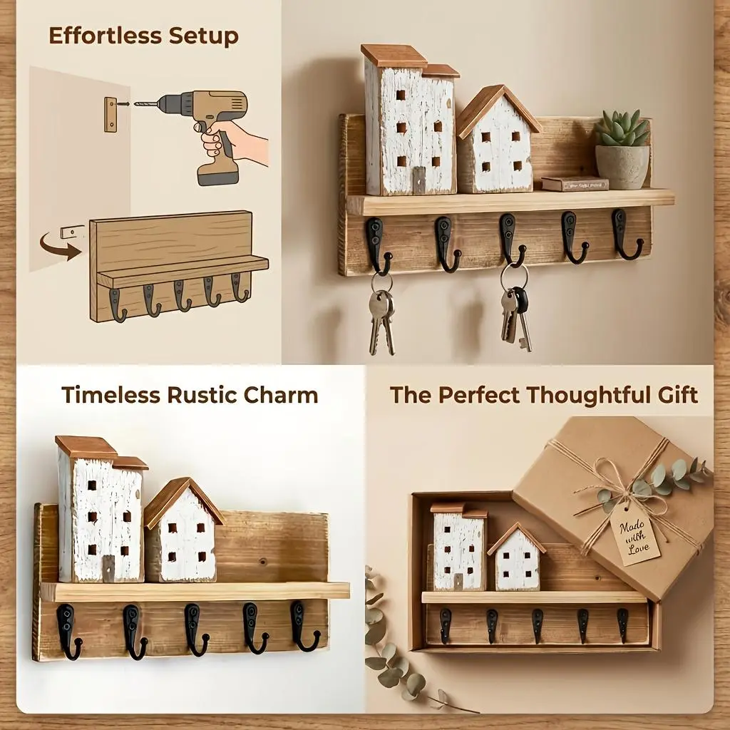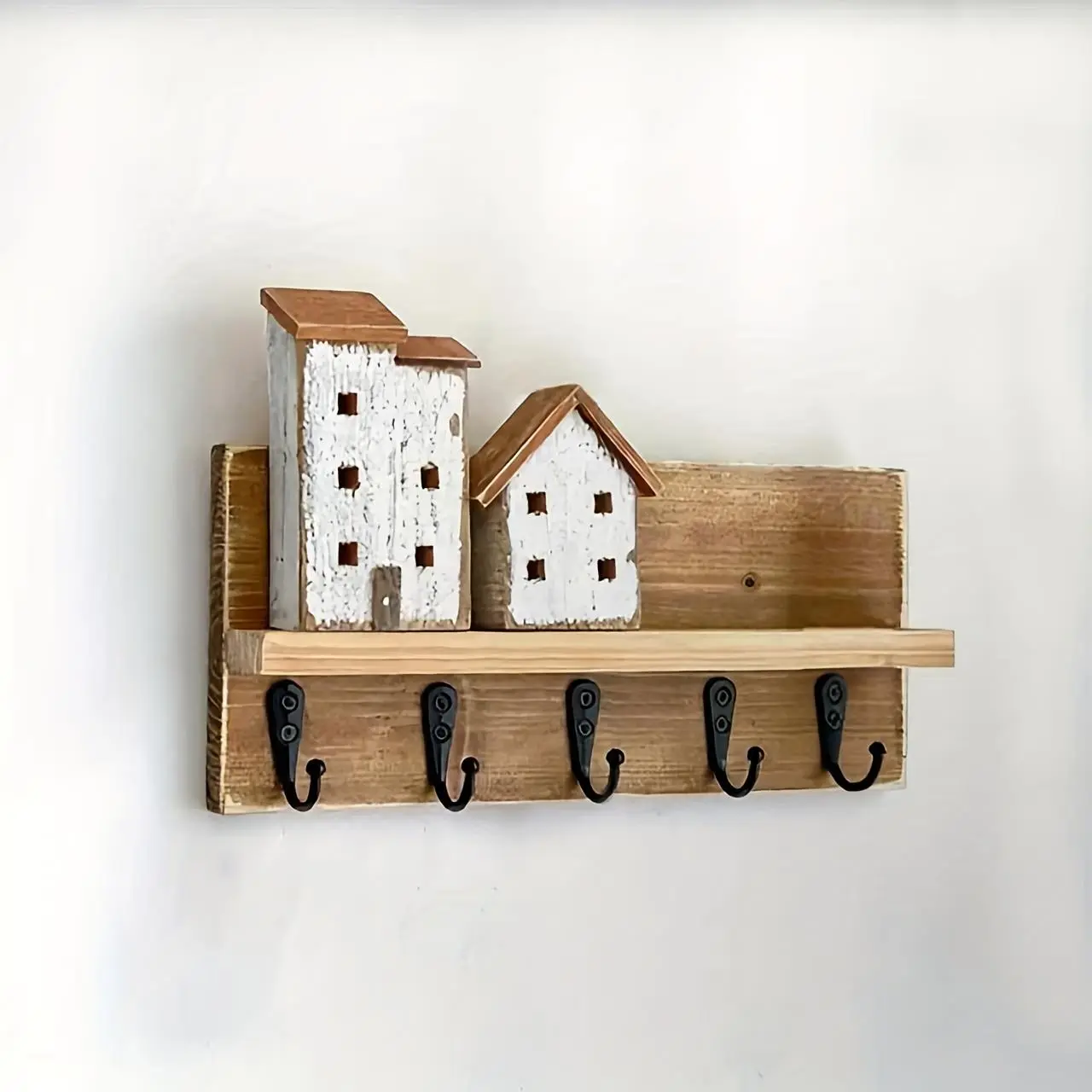 1pc 3D Rustic Wall-mounted Key Holder with 5 Hooks, Wall-mounted Key Rack, Wooden Entryway Organizer with Hooks, Suitable for Bedroom, Home Wall Display, Art Wall Storage, Art and Craft Wall Display Rack, Key Hook and Coat Hook