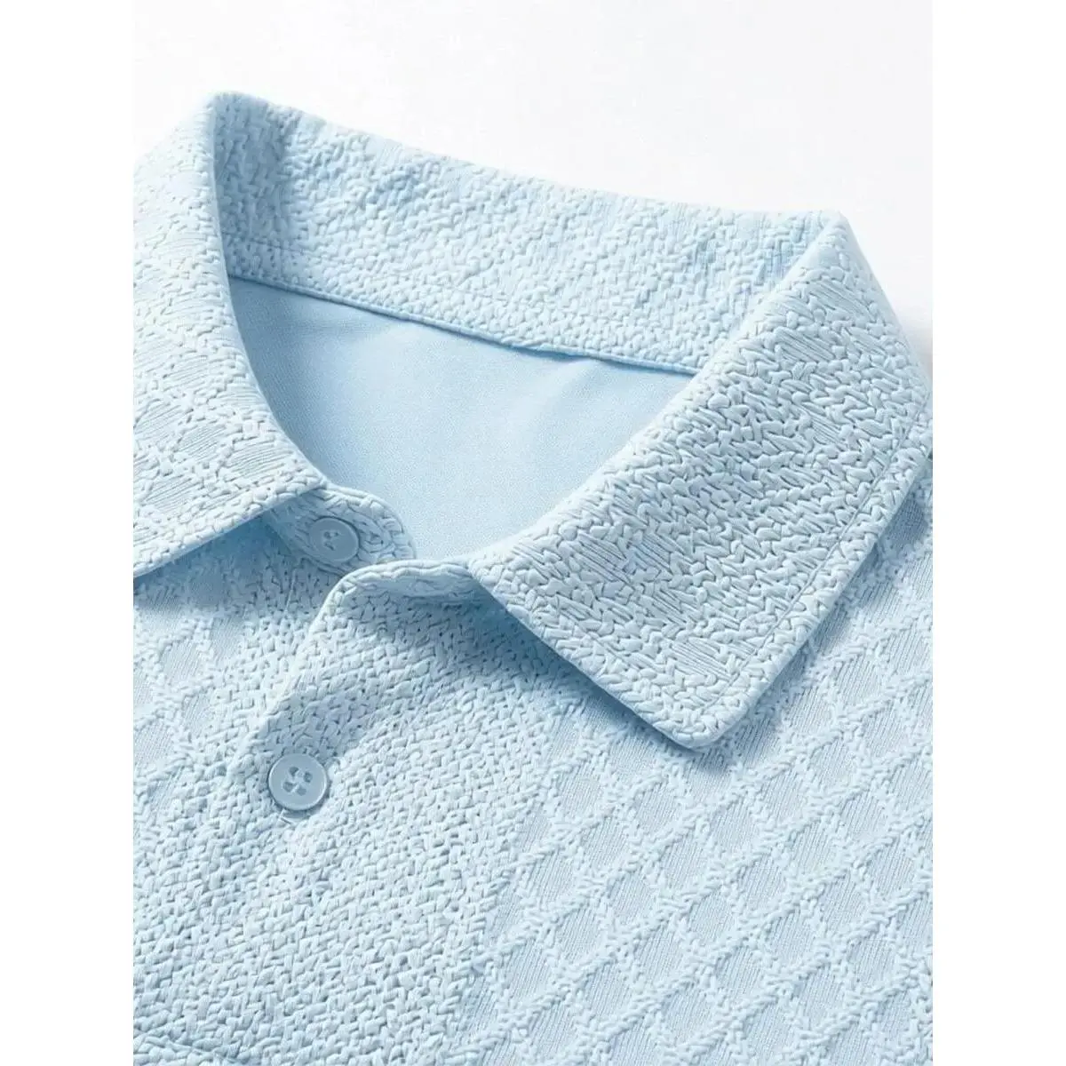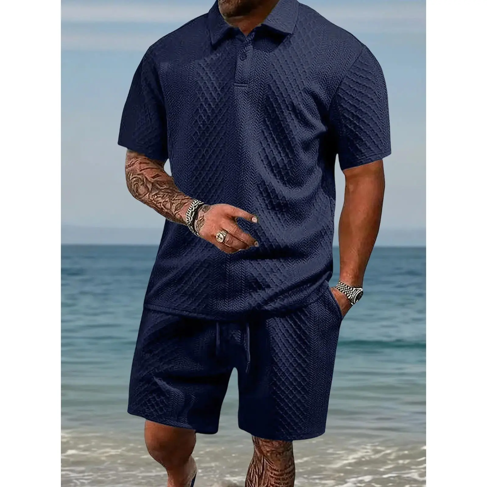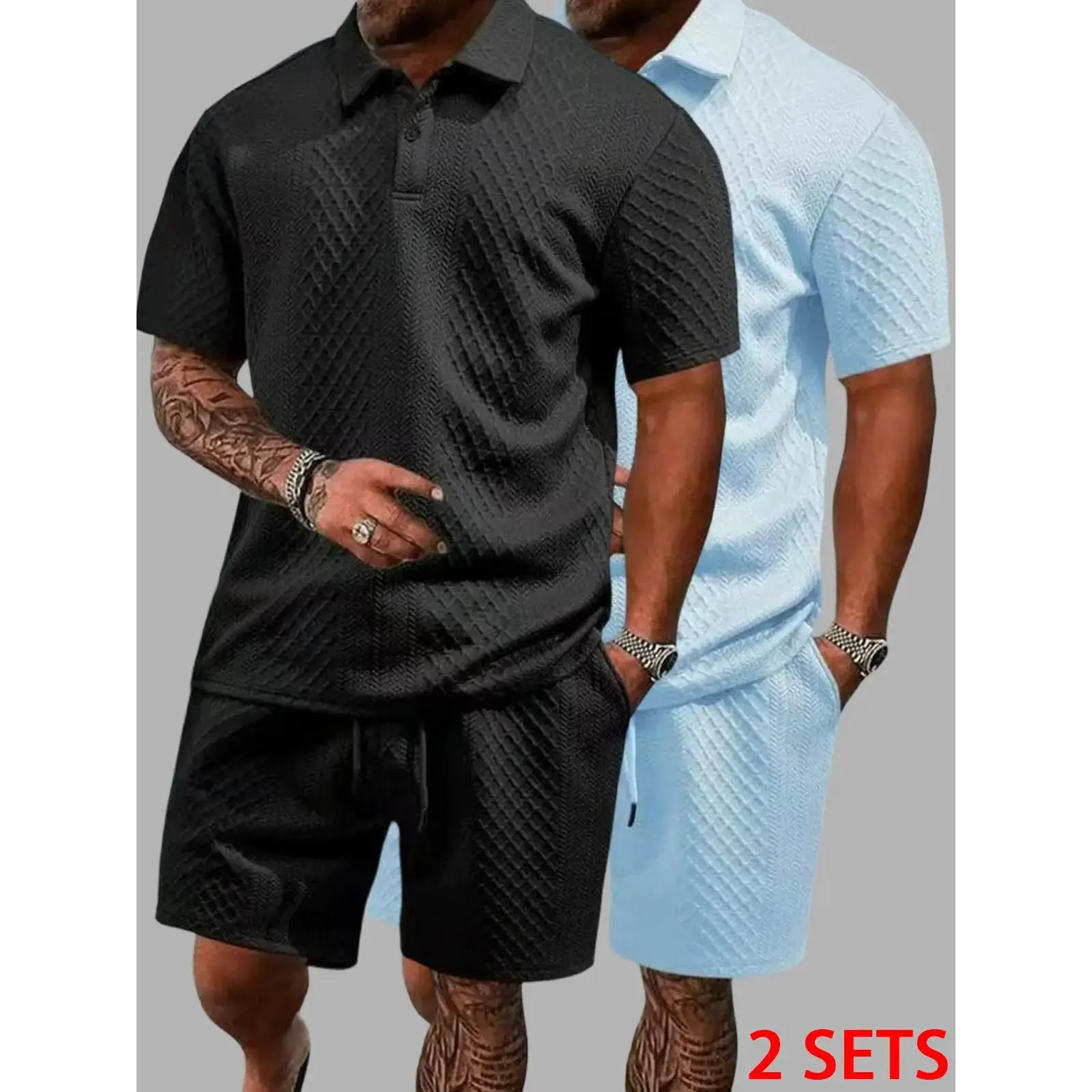 Men's summer casual texture fabric solid color polo shirt T-shirt shorts 2-piece set, loose fit suitable for casual sports, breathable and cool, essential summer outfit, comfortable and versatile Menswear Plain