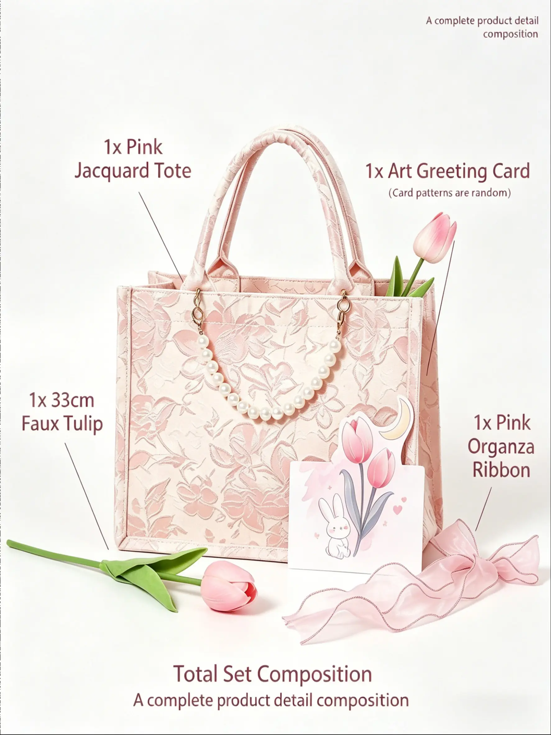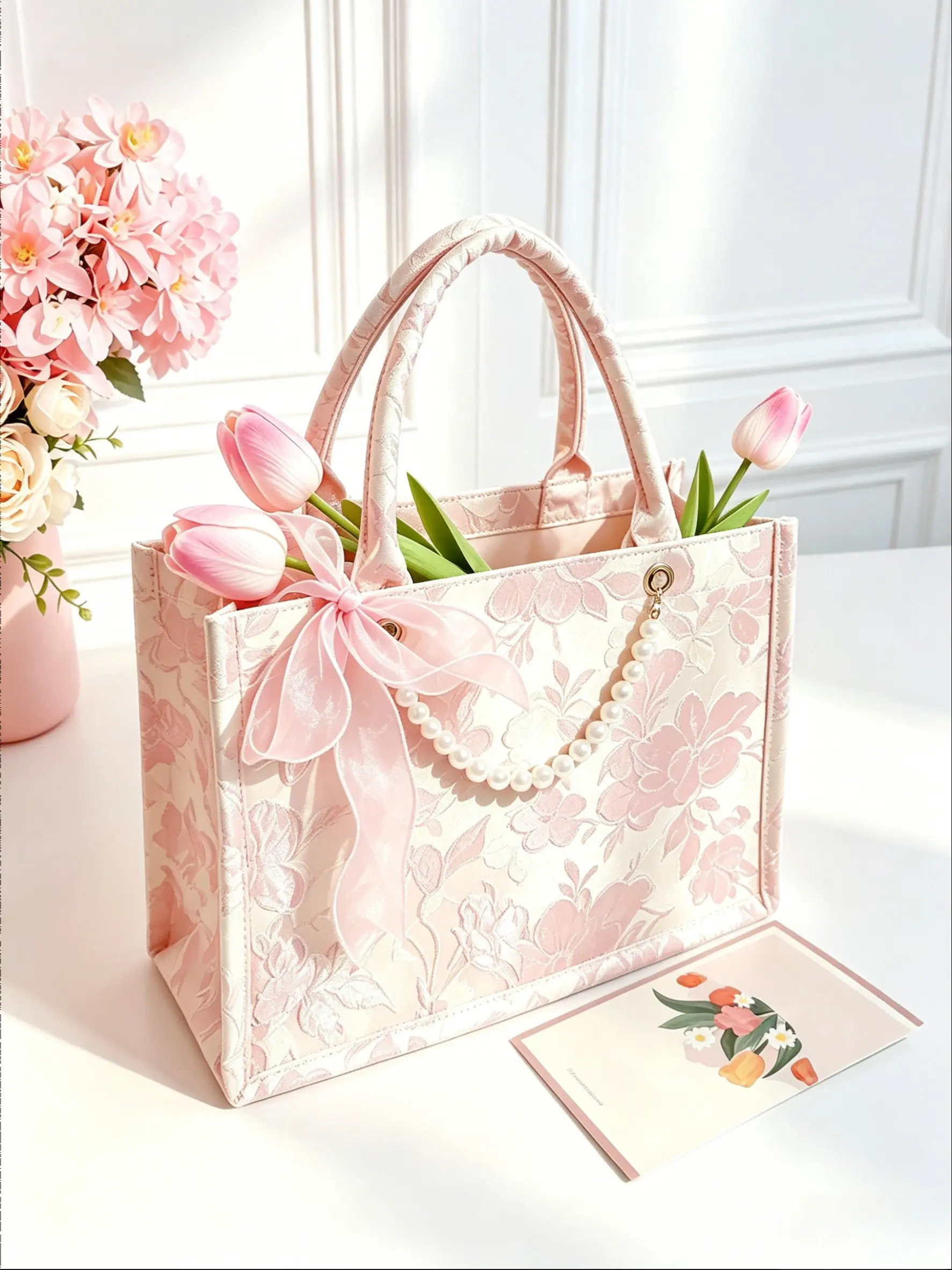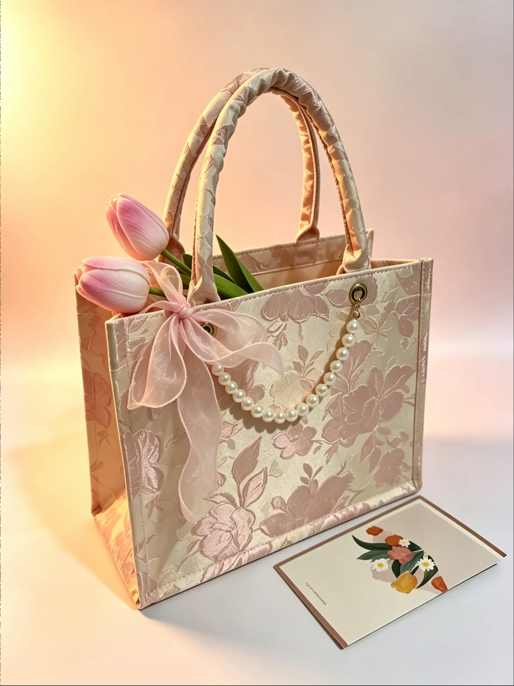 1 Set Exquisite Embroidered Gift Handbag Set with Ribbon, Tulip & Card | Vintage Floral Design Party Souvenir | Professional Gift Packaging for Festivals & Celebrations