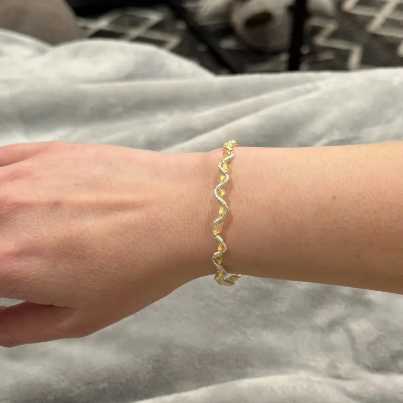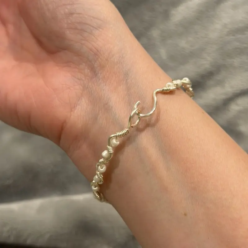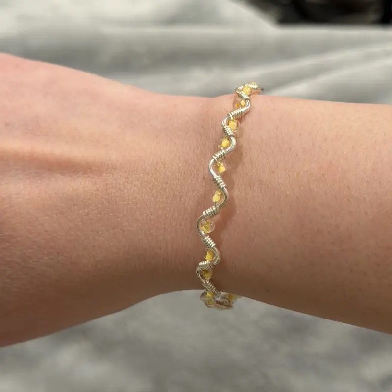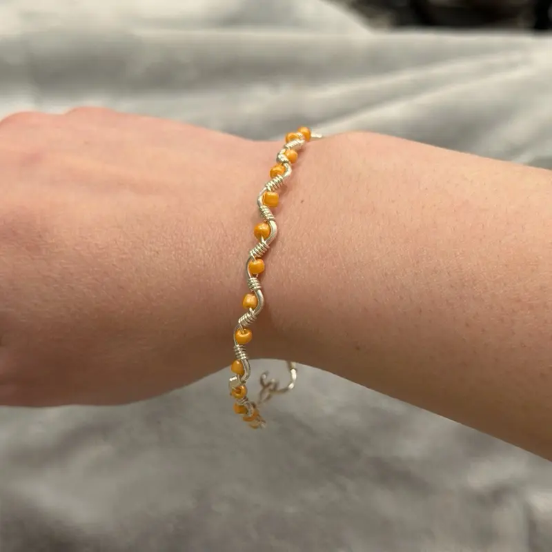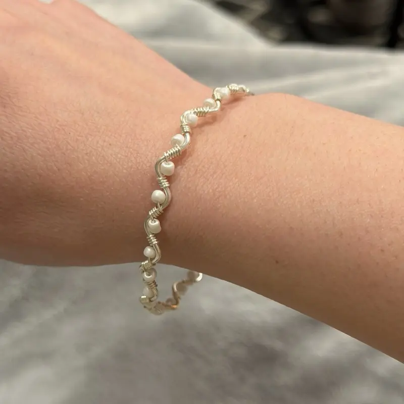 Handmade wire wrapped beaded bracelet. Tarnish-resistant silver-toned copper wire, twisted into a wavy silhouette and accented with dainty beads. Each bracelet is made with care and is one-of-a-kind.