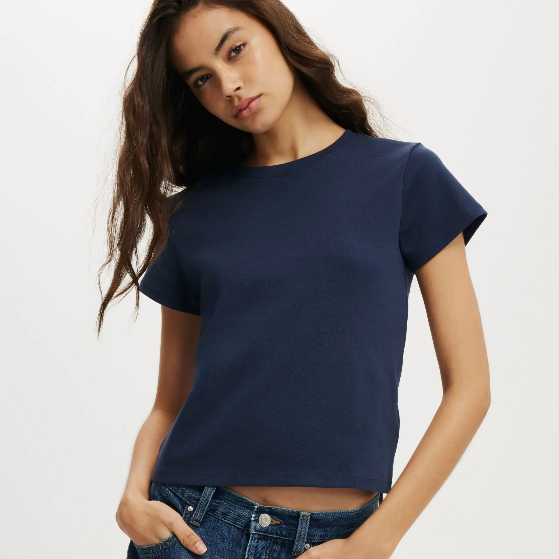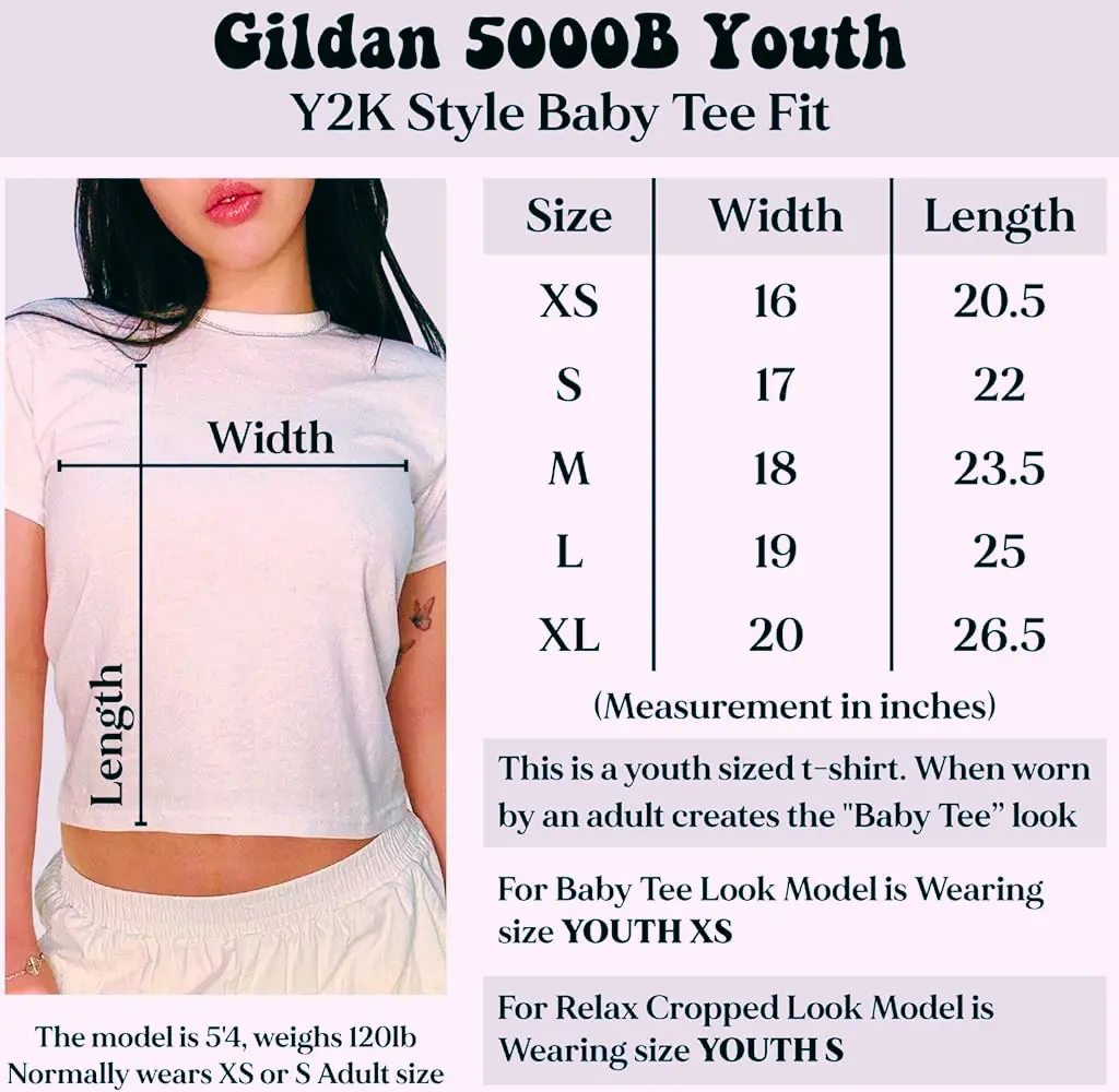 Our Baby tee is sized for a youth, reminiscent of the '90s-era shrunken-down T-shirt. This style, popularized by the skater/raver culture of the time, is not to be confused with the modern crop top. The baby tee was the equivalent of a kids' size medium or large and reflected the child-inspired fashion trend of that era.