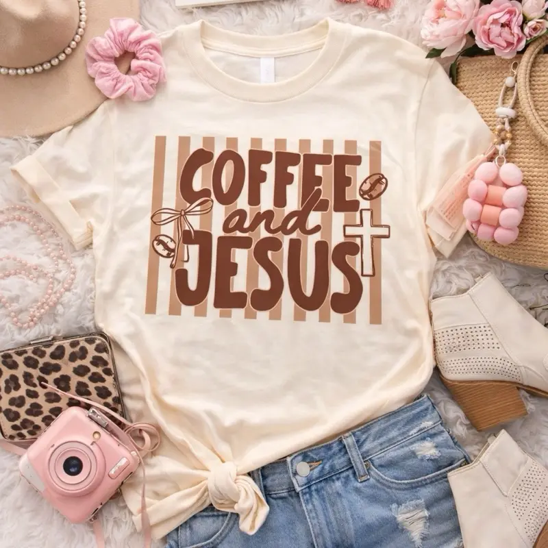 Coffee & Jesus Stripped Tee - Casual Short Sleeve T-Shirt with "Coffee and Jesus" Design, Ideal for Everyday Wear