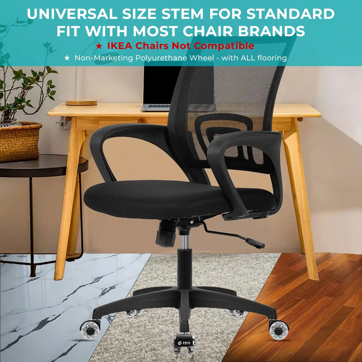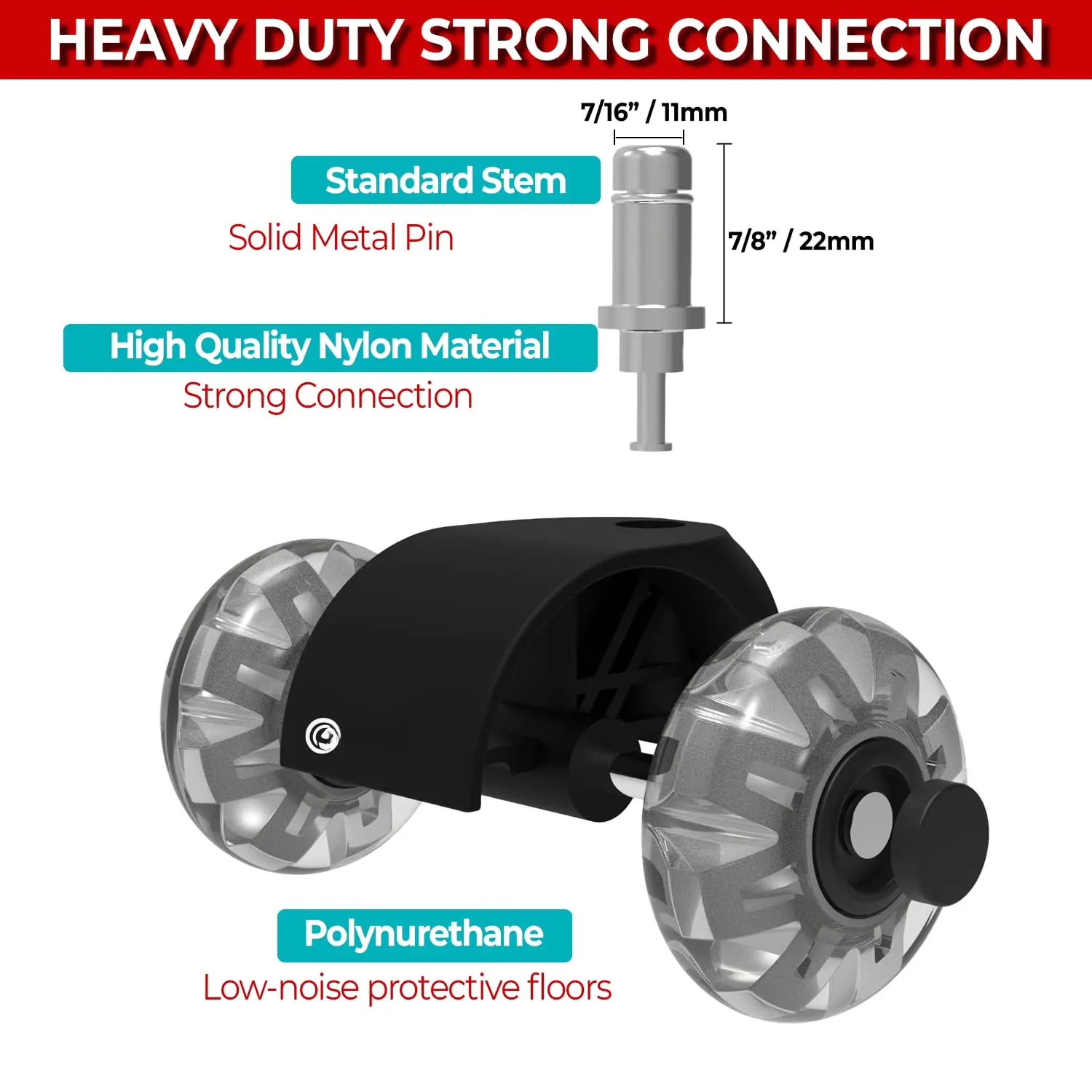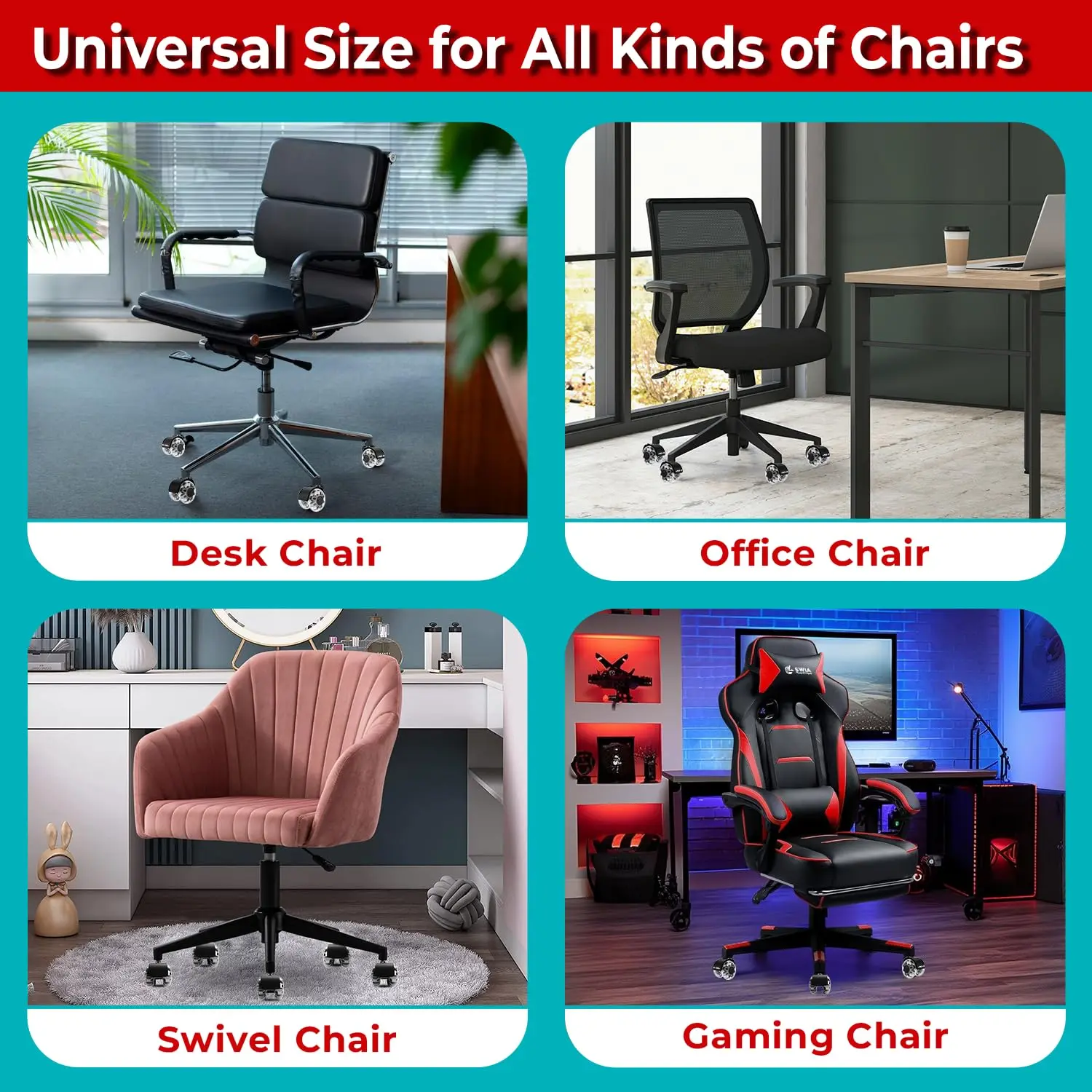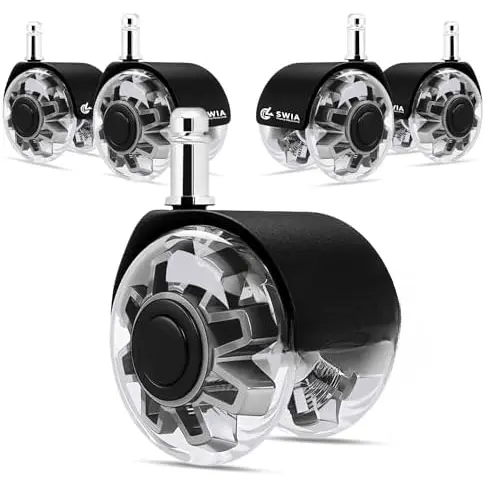 These wheels fit various office furniture, including desk and gaming chairs.With a standard 11x22 mm stem size, installation is quick and hassle-free.Upgrade your chair's mobility in minutes.No need for professional help or complex setups.