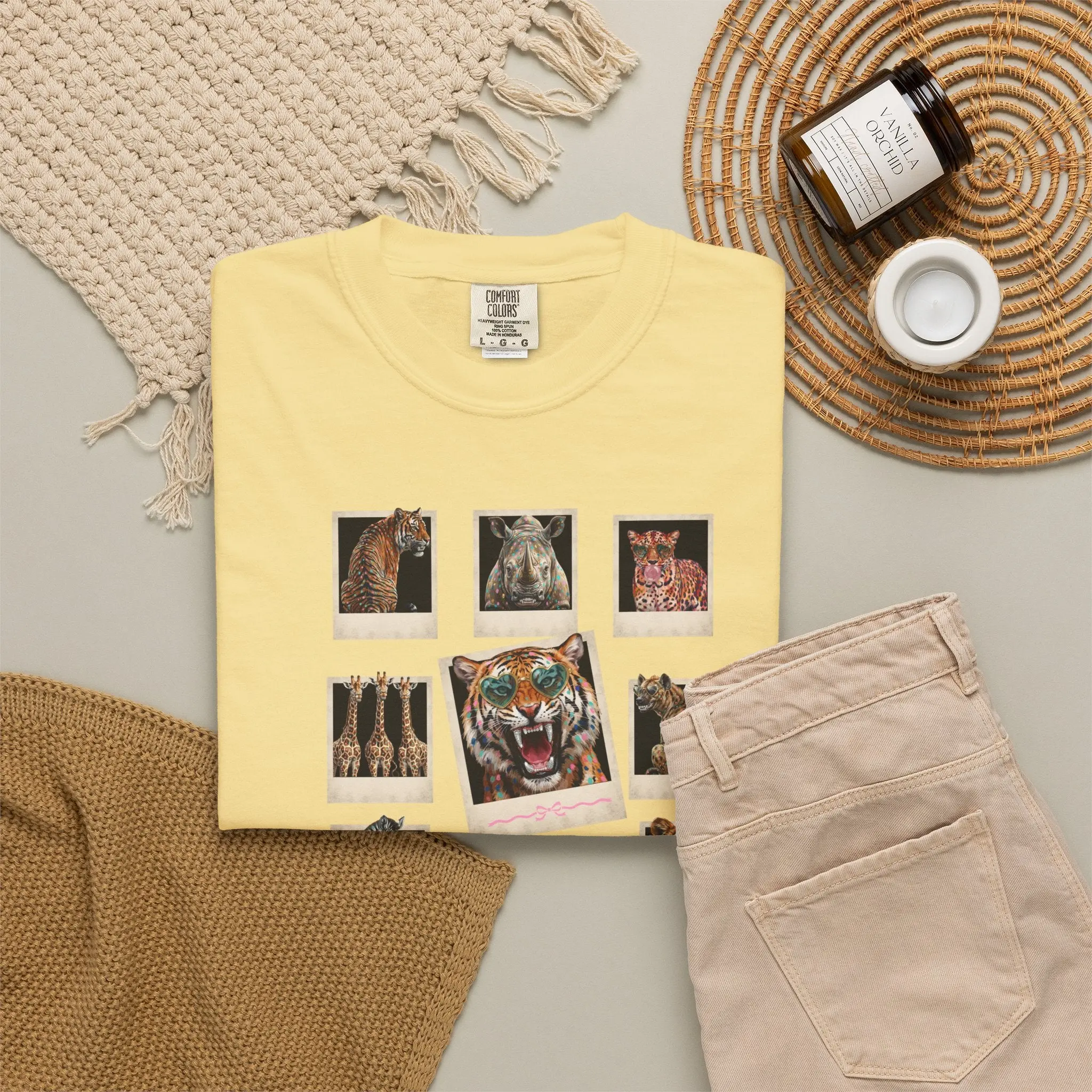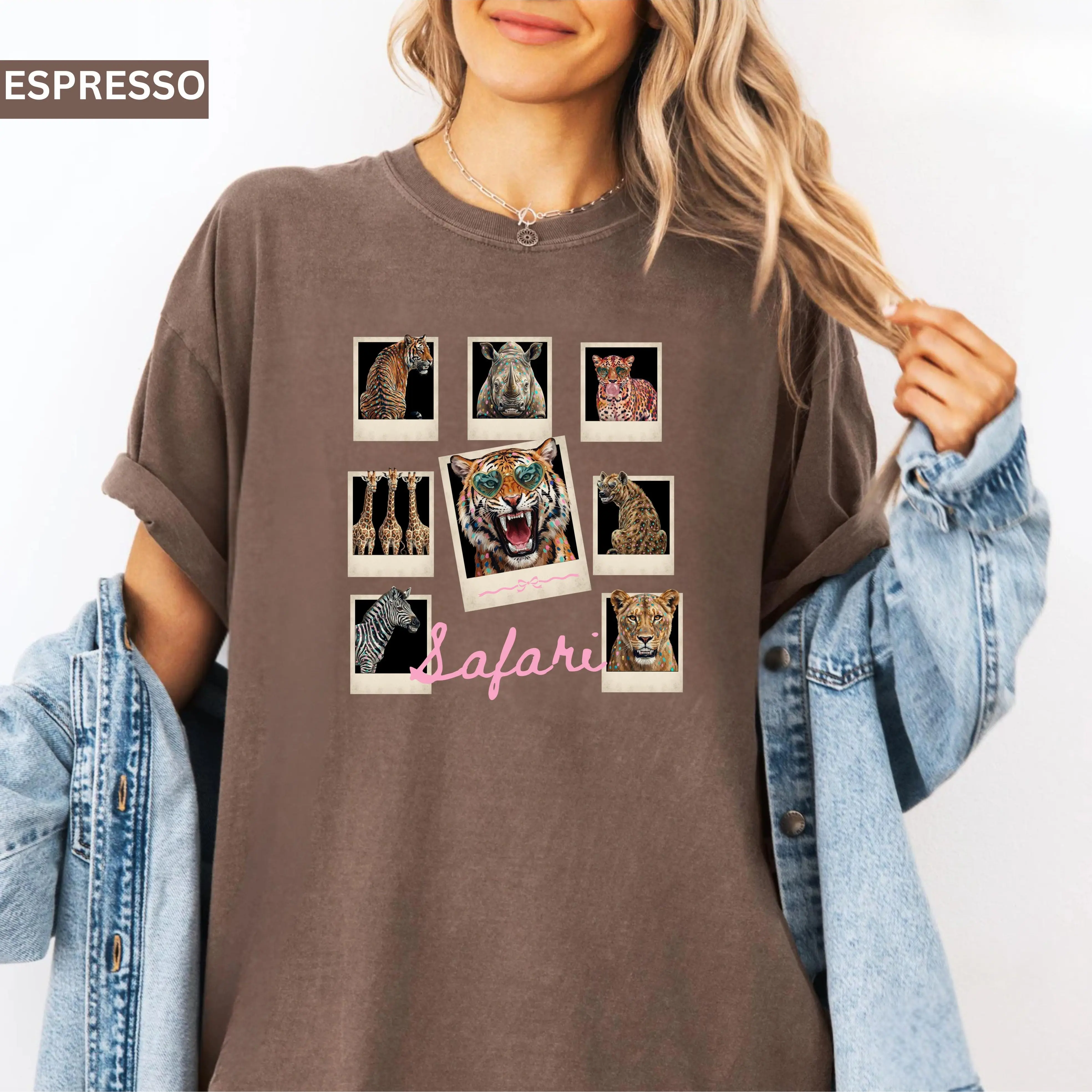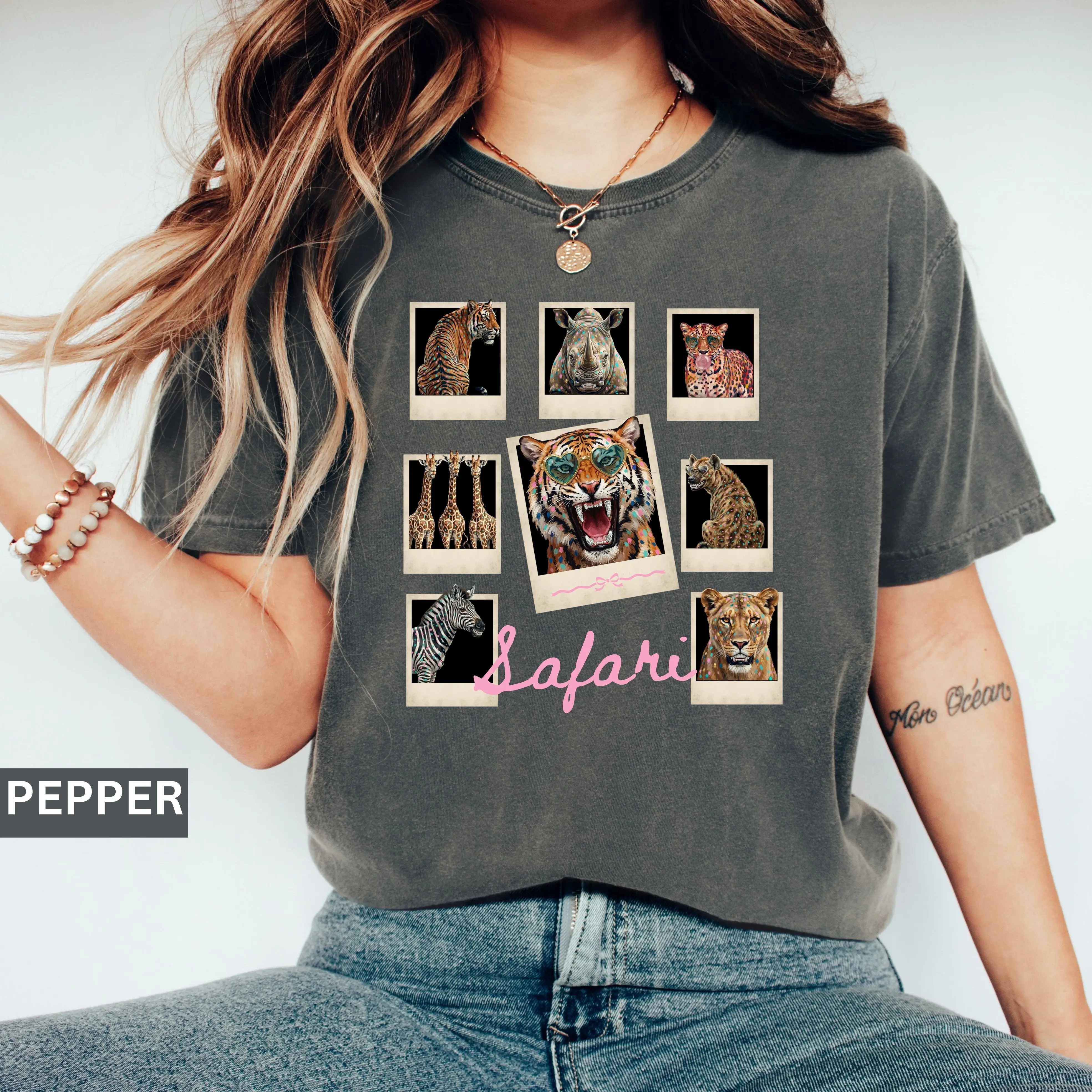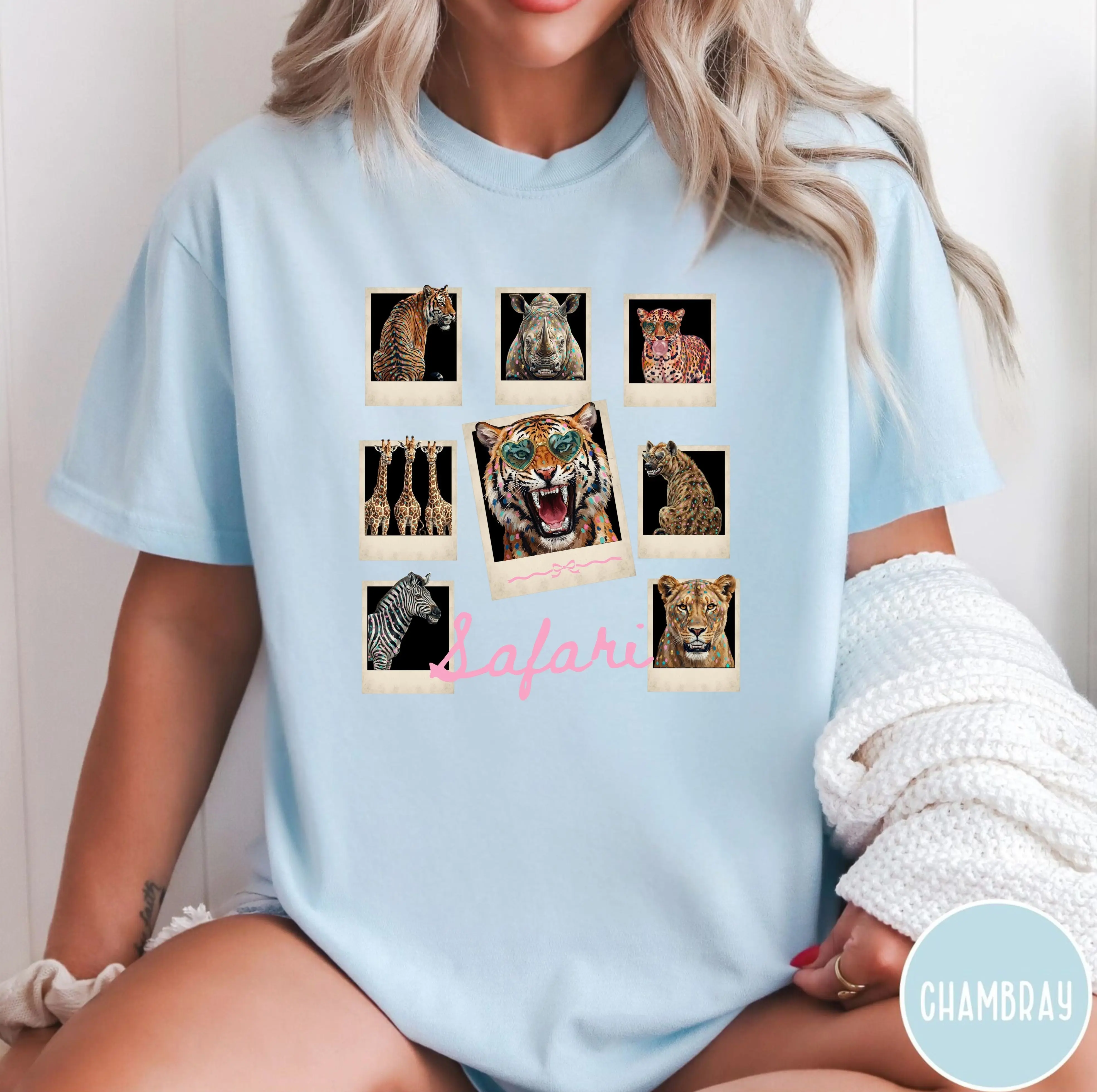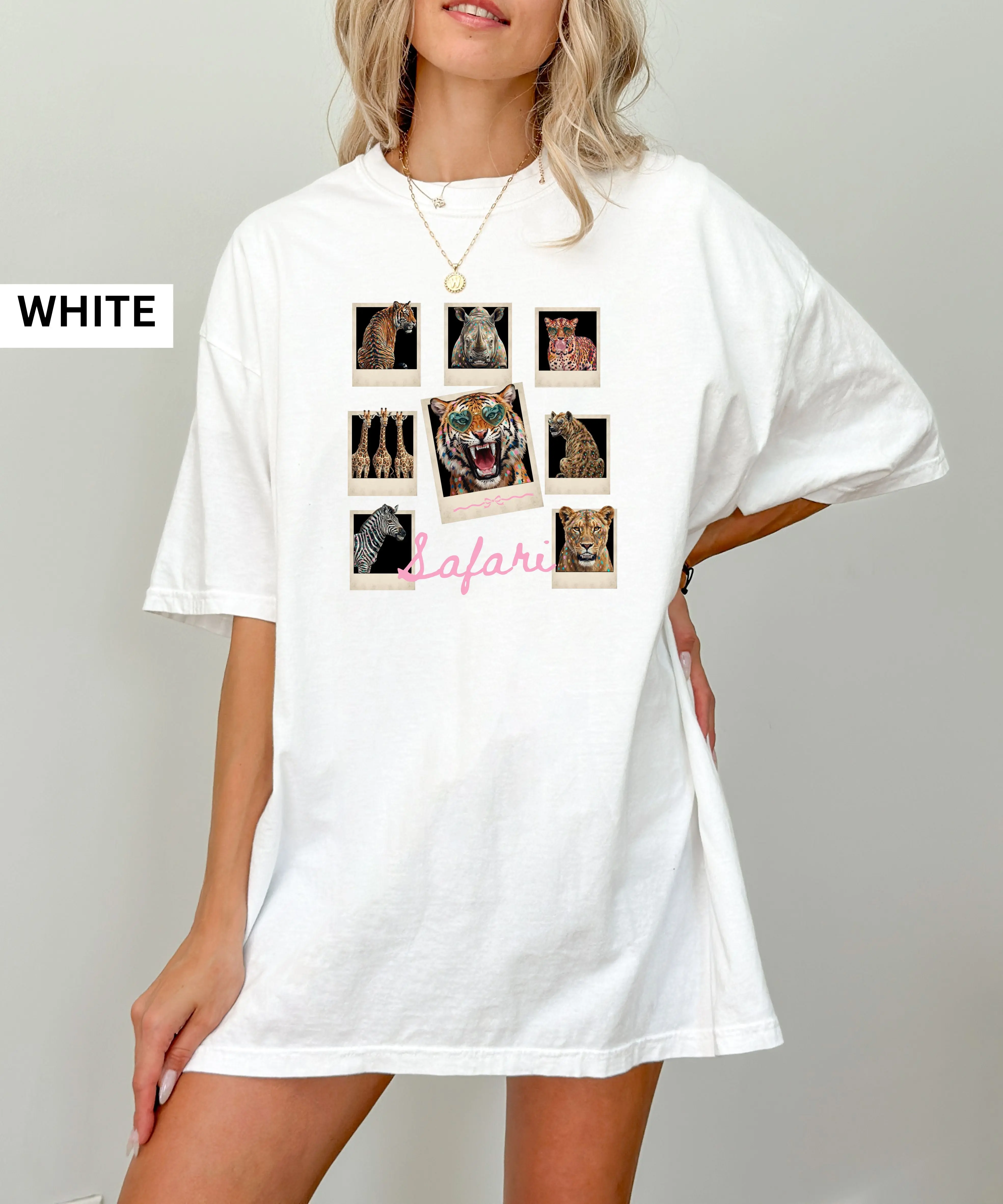 This “Safari” graphic tee blends bold animal energy with a soft, coquette-inspired twist. Featuring a collage of stunning safari animals in a vintage polaroid-style layout, this design is equal parts fierce and feminine.