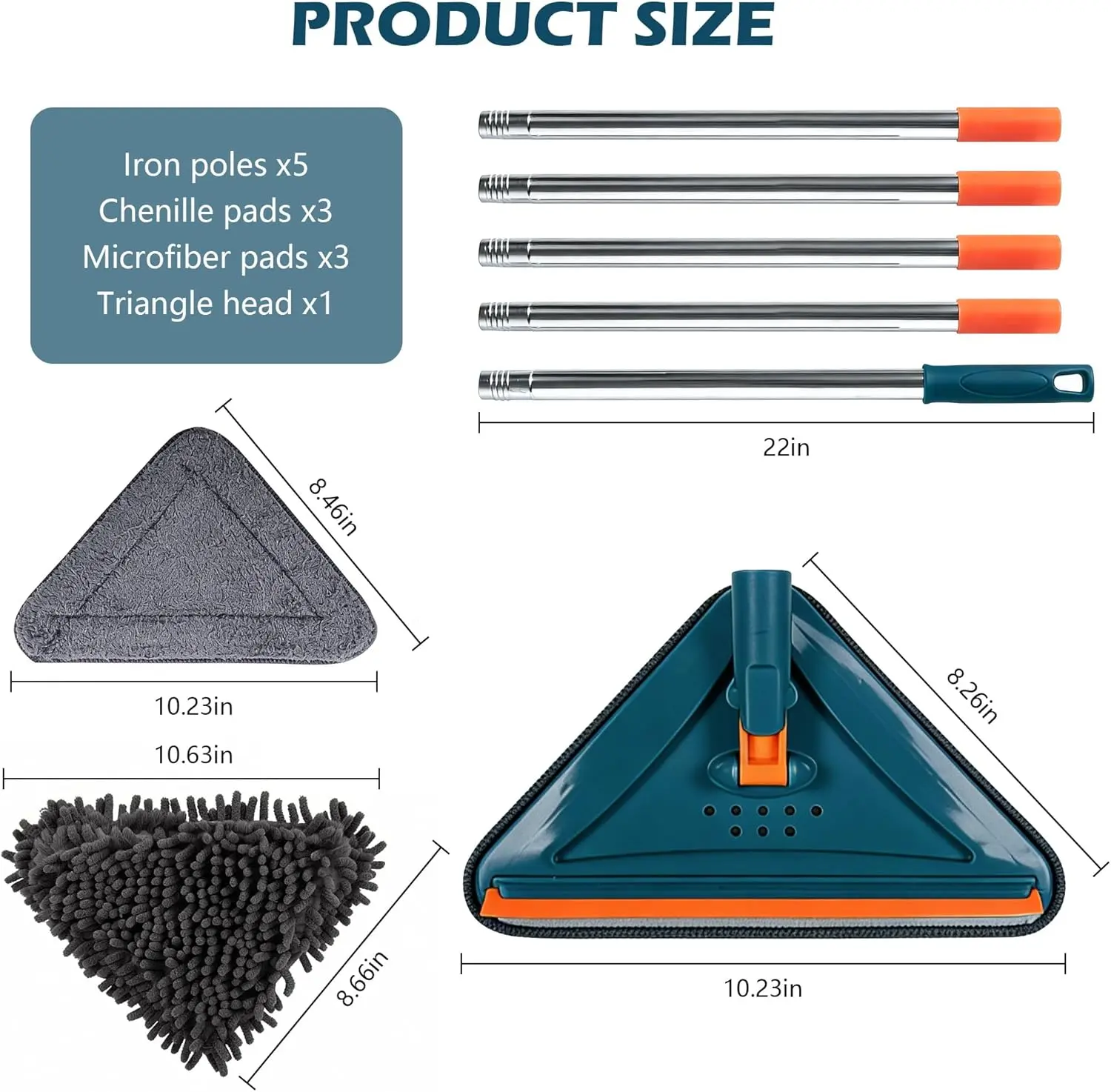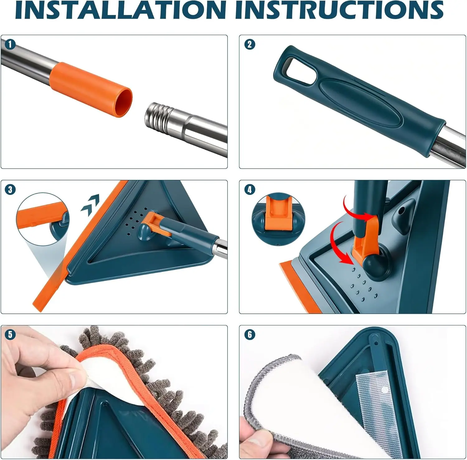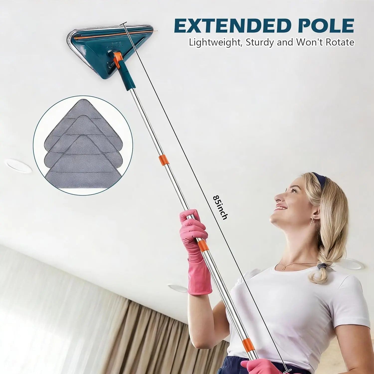 The triangular mop head can be adjusted to any angle for better cleaning. The locking function secures the head, preventing collapse or flipping. Ideal for high places, it ensures thorough cleaning of dead corners and hard-to-reach areas.