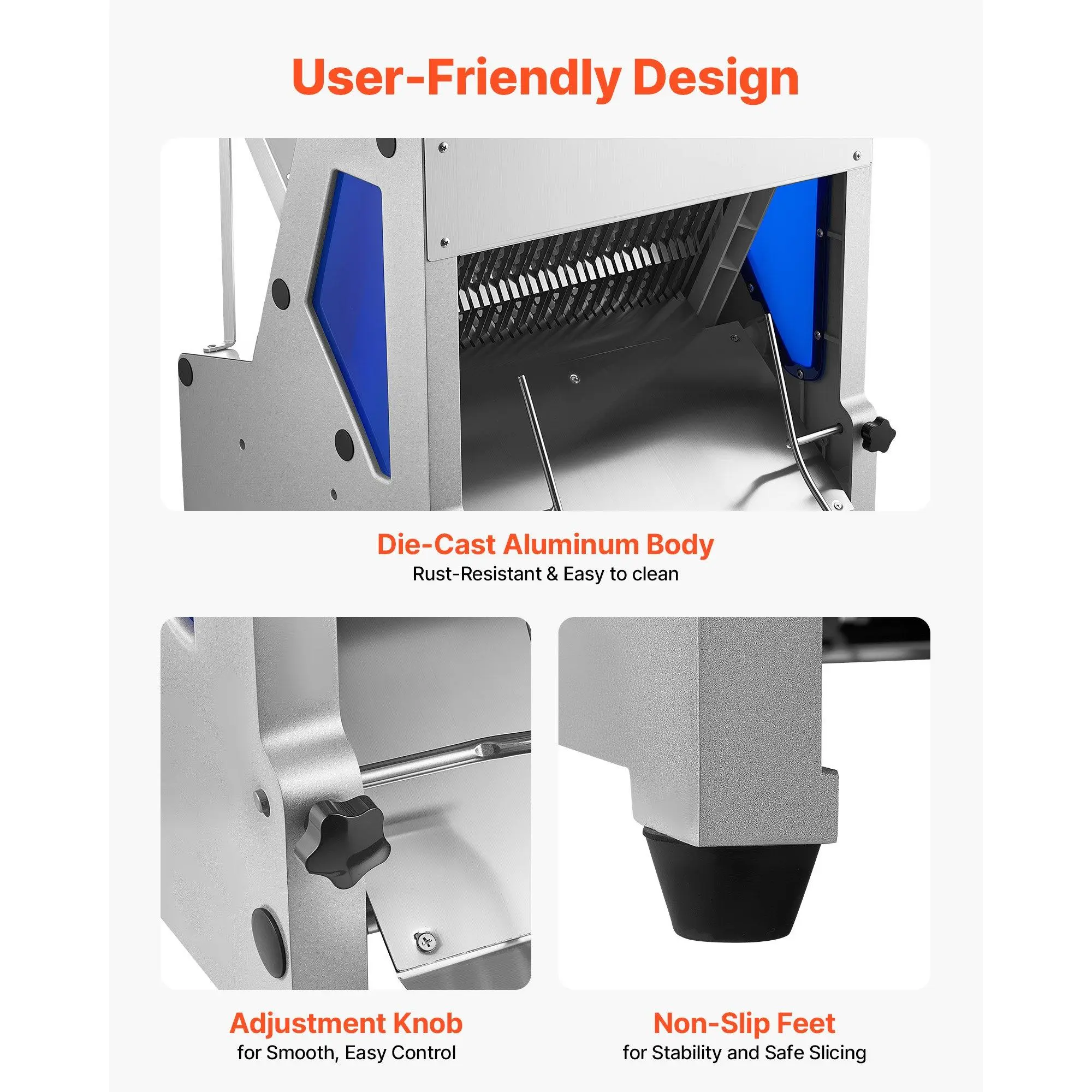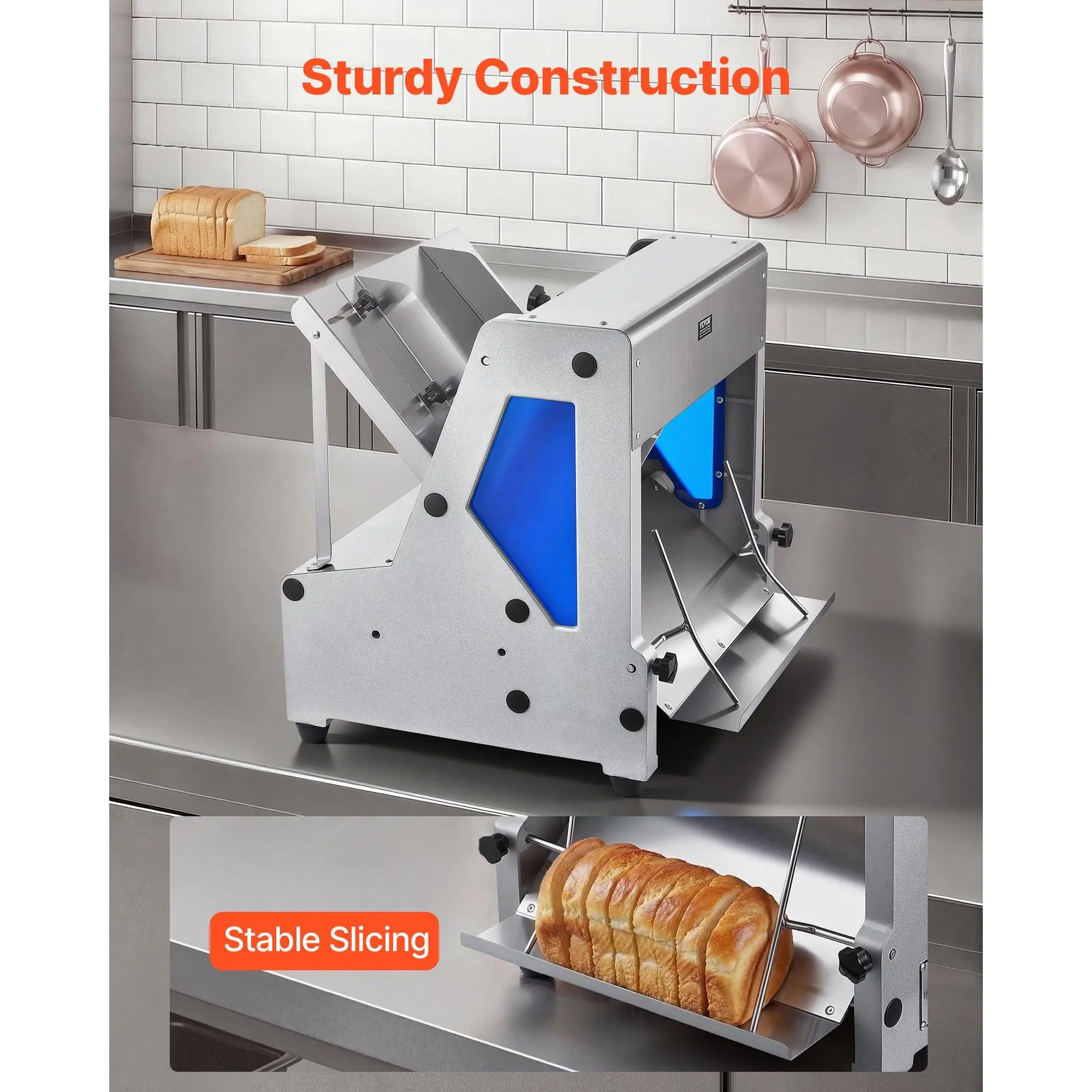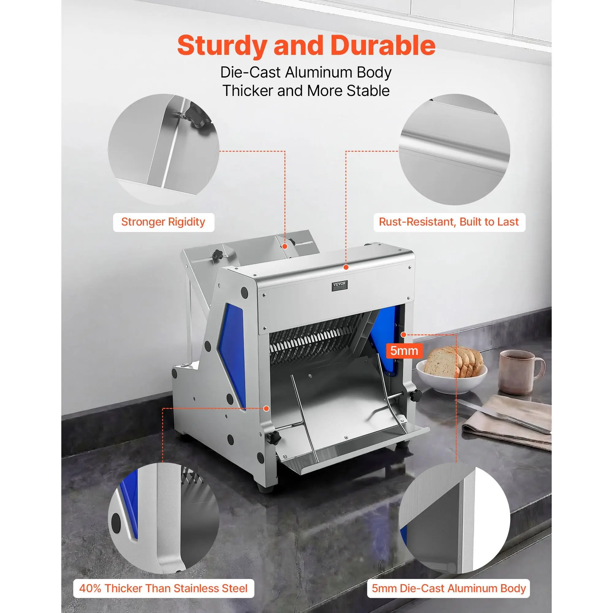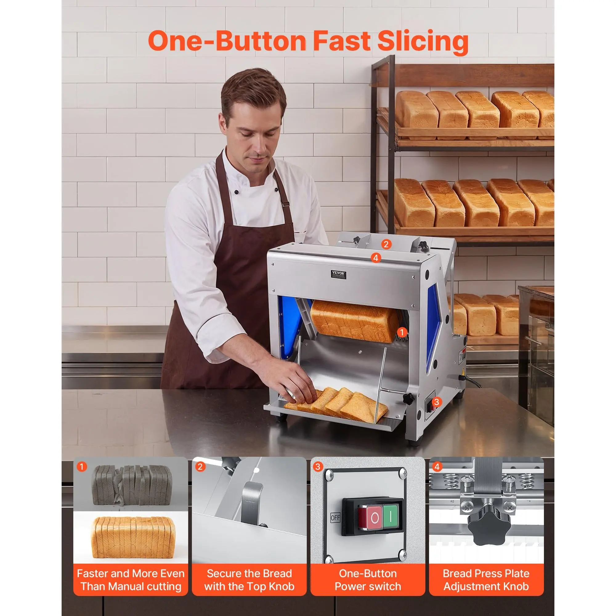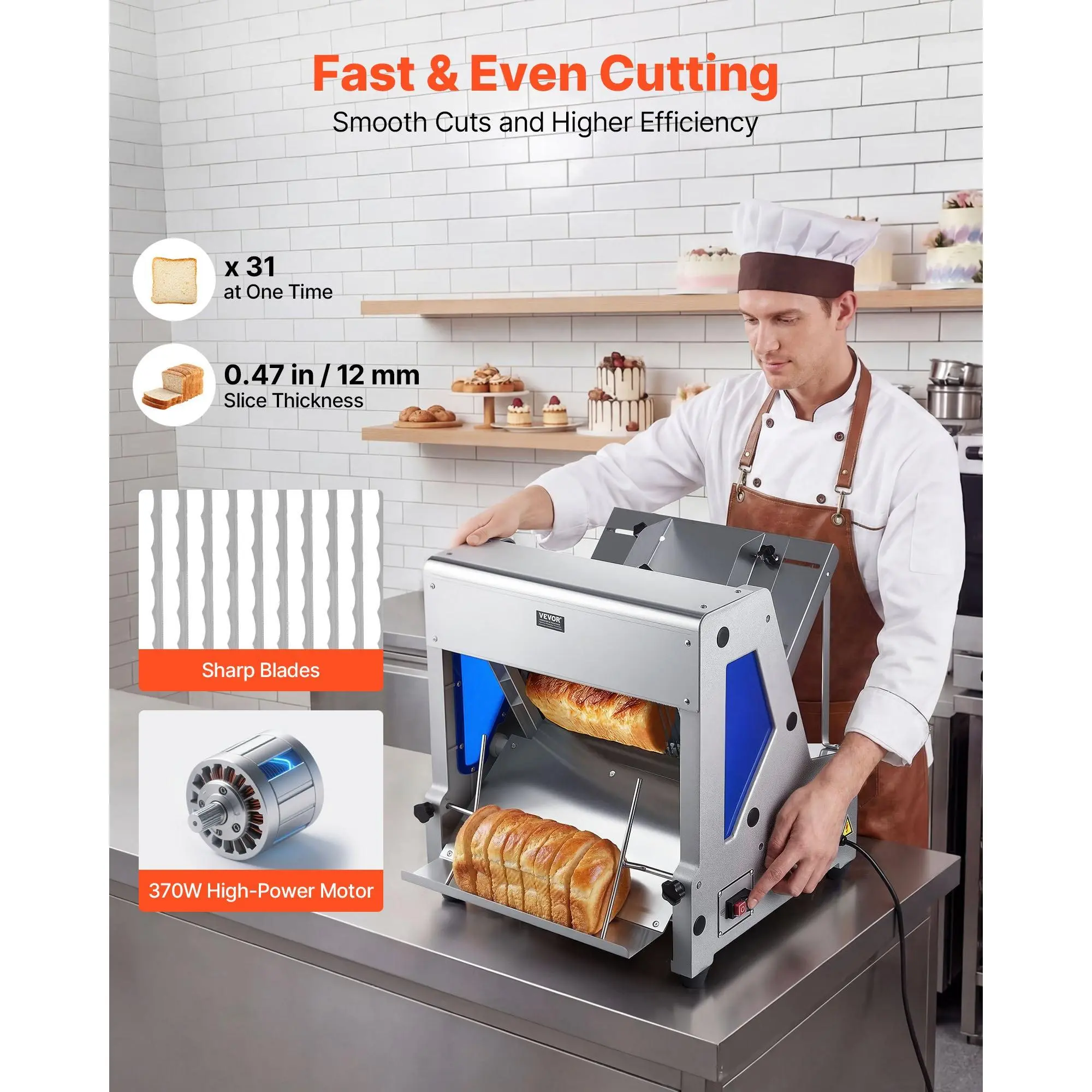 Hand-cutting bread is time-consuming and often uneven. This VEVOR electric bread slicer features a powerful 370W motor and sharp blades for high-efficiency slicing, and can cut up to 31 slices of 0.47-inch (12 mm) thick bread at a time.