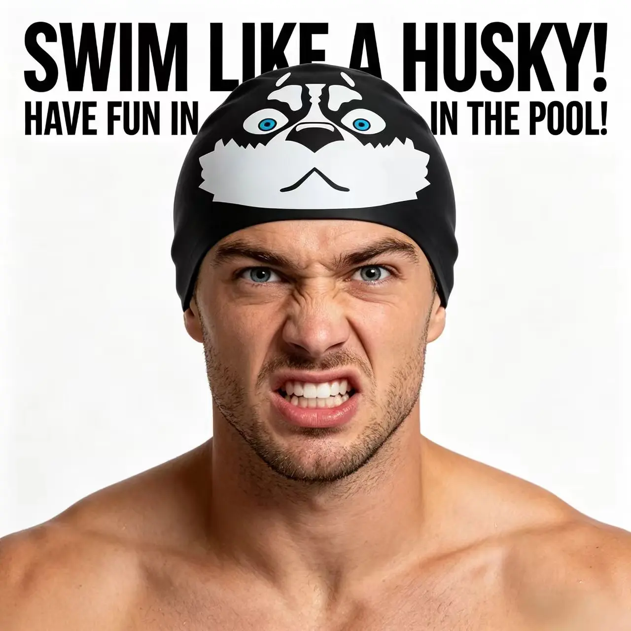 Dive into fun with the Husky Funny Swim Cap! This high elastic cap fits large sizes, ensuring comfort for men, women, adults, and kids. 🐶✨ It's waterproof, making it perfect for swimming. The cute cartoon design adds a playful touch to your swim session. No head pain guaranteed!