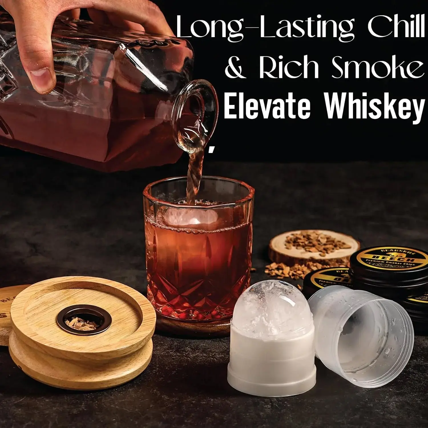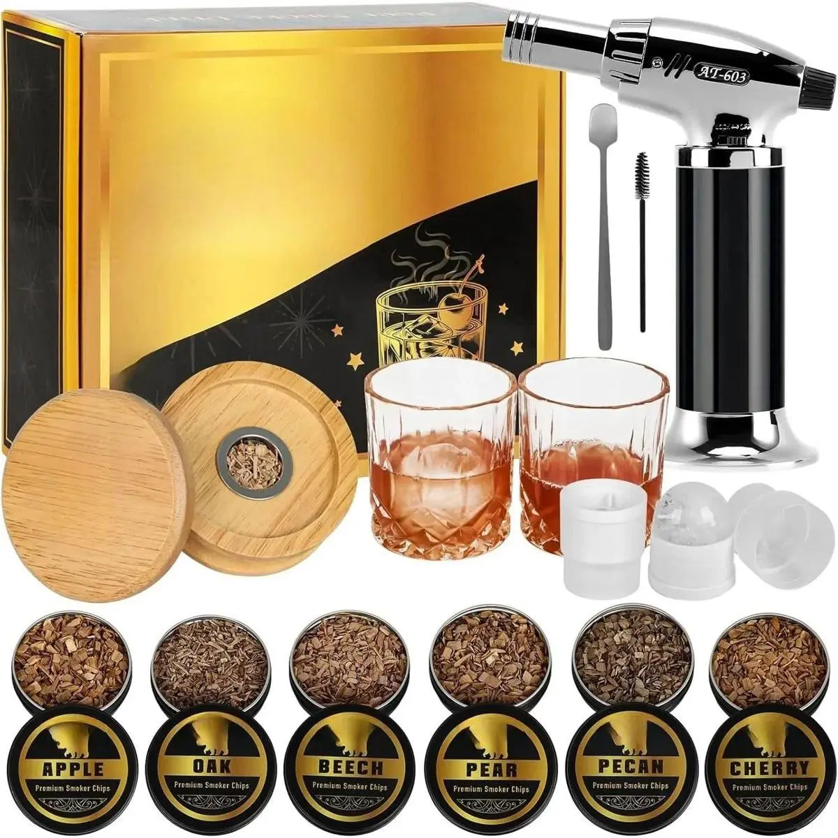 ed Complete Whiskey Smoker Set – a high-quality oak wood smoker, 6 flavors of wood chips, a torch lighter, 2 glasses, 2 ice ball molds, and a metal filter.It’s the perfect addition to your bar set or bartending supplies, whiskey accessories and fits seamlessly into any bartender kit or barware tool sets.